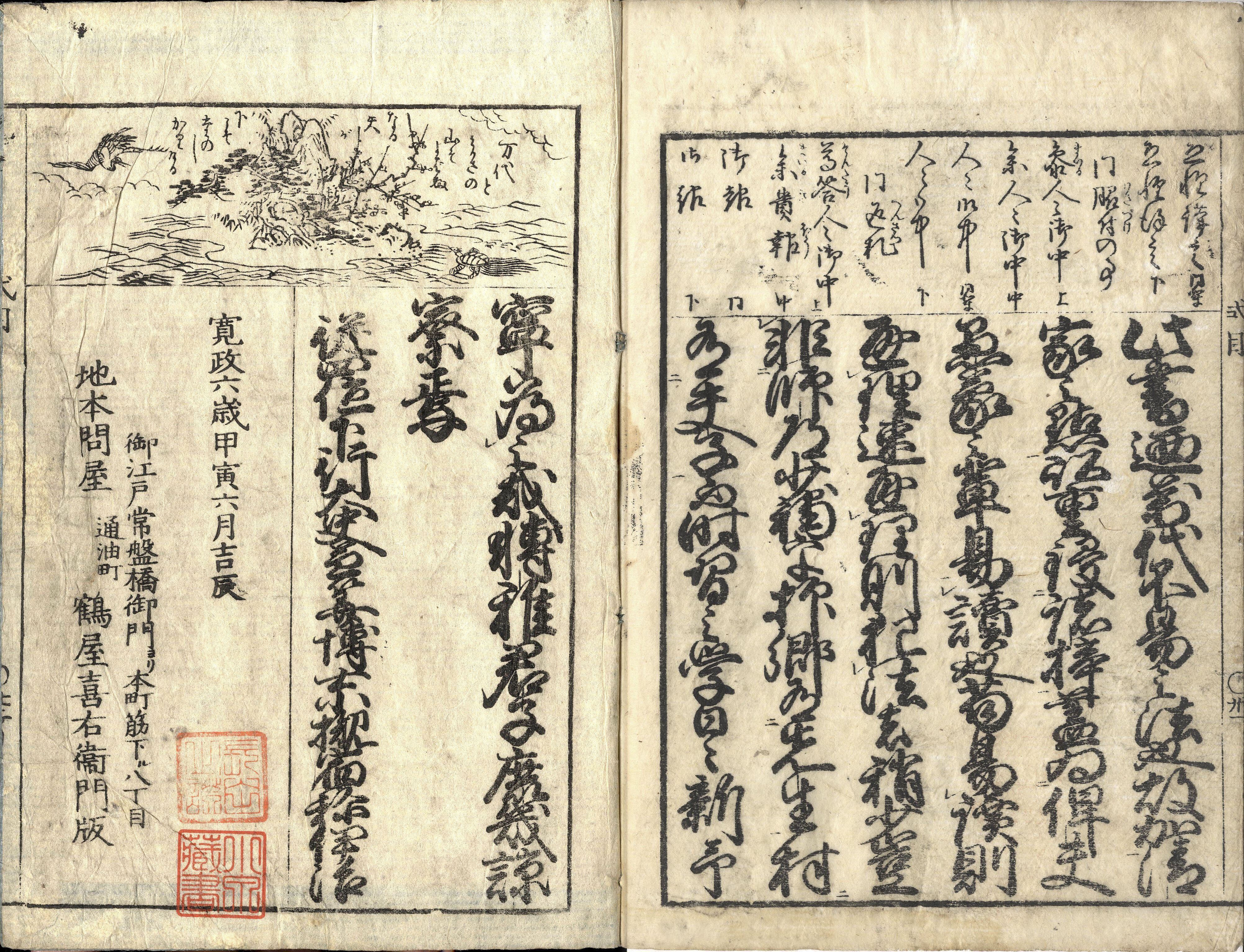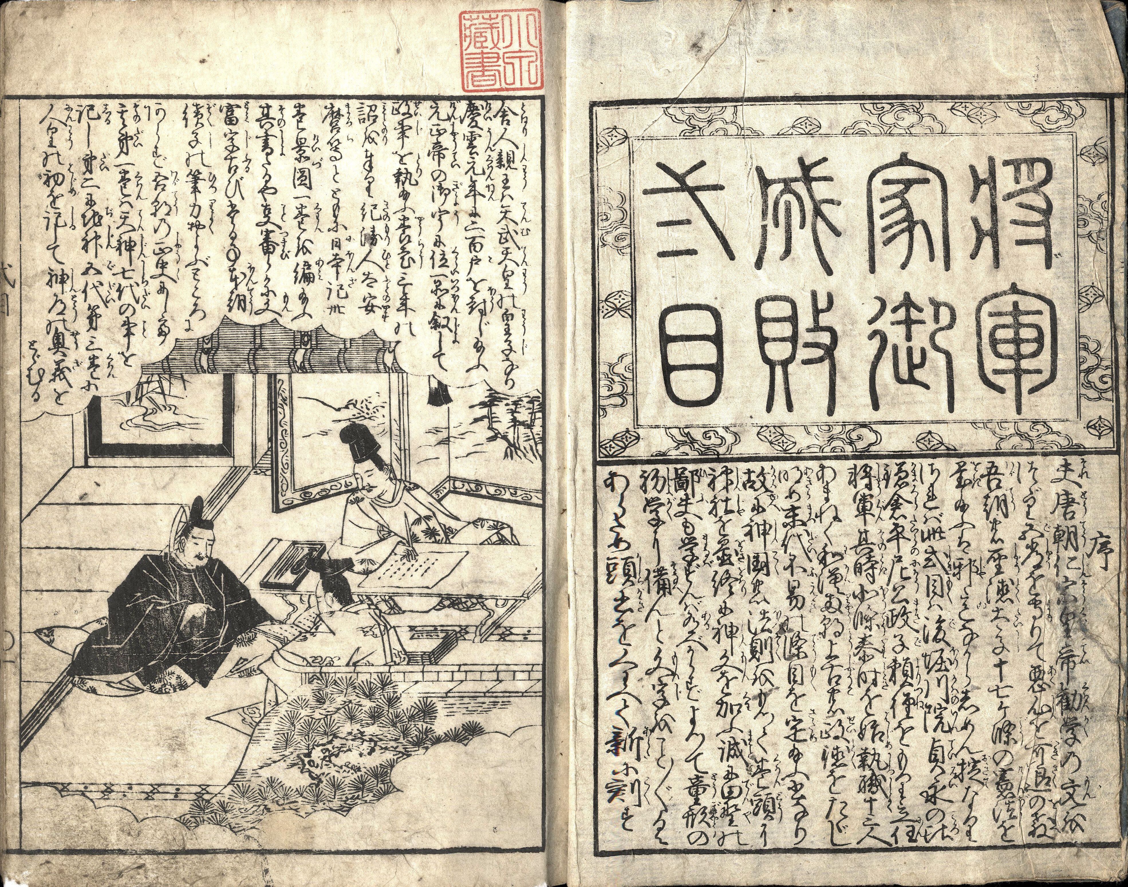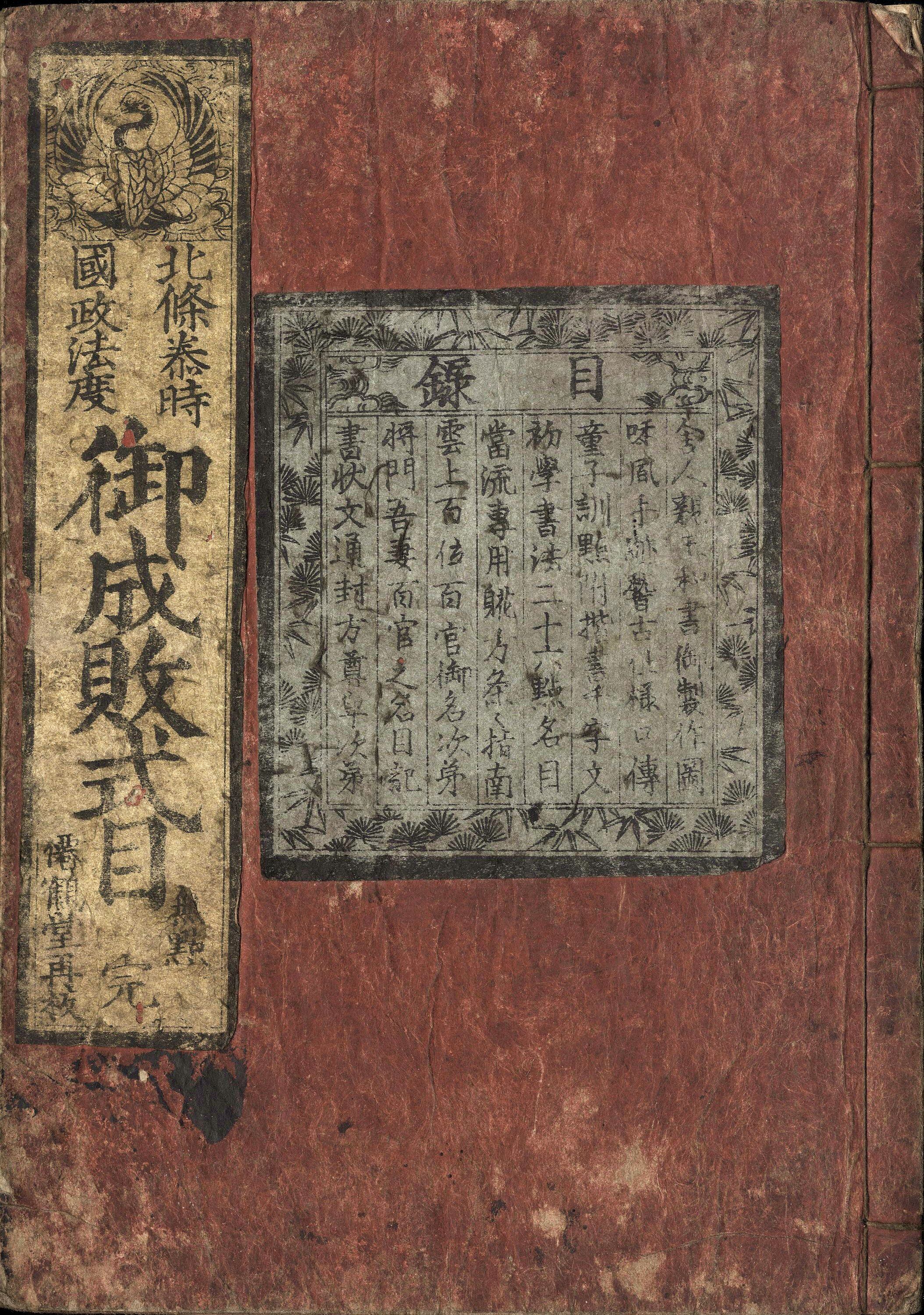 【判型】大本1冊。収録順に縦265・260・261・255・254粍。【作者】北条泰時編。【年代等】天明2年7月刊。[江戸]西宮新六板。続けて、天明7年7月再刊([江戸]伊勢屋治助板)、寛政6年6月再刊([江戸]鶴屋喜右衛門板)、文化14年3月再刊([江戸]鶴屋喜右衛門板)、天保13年11月求板([江戸]西宮弥兵衛ほか板)の4本を抄録または全冊収録した。各板元により題簽の角書等が異なる。