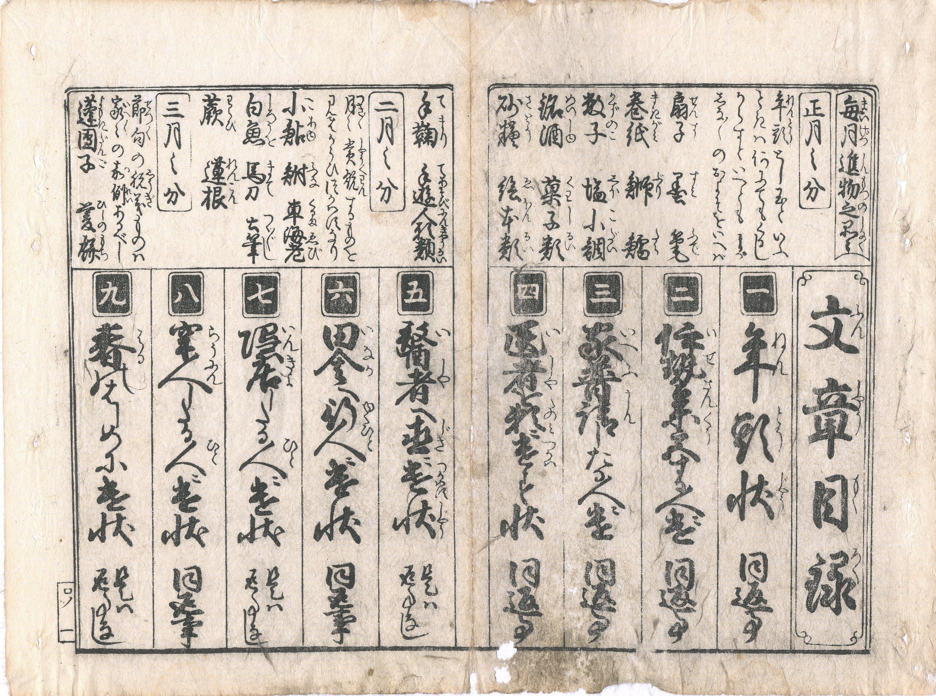 【備考】分類「往来物」。袋綴じ展開収録。後印本も抄録。「年頭状」から「歳暮祝儀状・同返事」までの160通余を収録した用文章。冒頭その他一部例外を除き、「伊勢参宮する人ニ遣」「家普請したる人ニ遣」「医者を頼ニ遣す状」のように、主題のイロハ順に配列するのが特徴。従って、四季順または分類順ではないが、四季折々の手紙や吉凶事に伴う手紙など一通りの例文を含む。本文をやや小字・6行・付訓で記す。見返・前付に「九九之声」「片仮名以呂波」「毎月進物之品々」「四季月々時節之言葉」を掲げる。