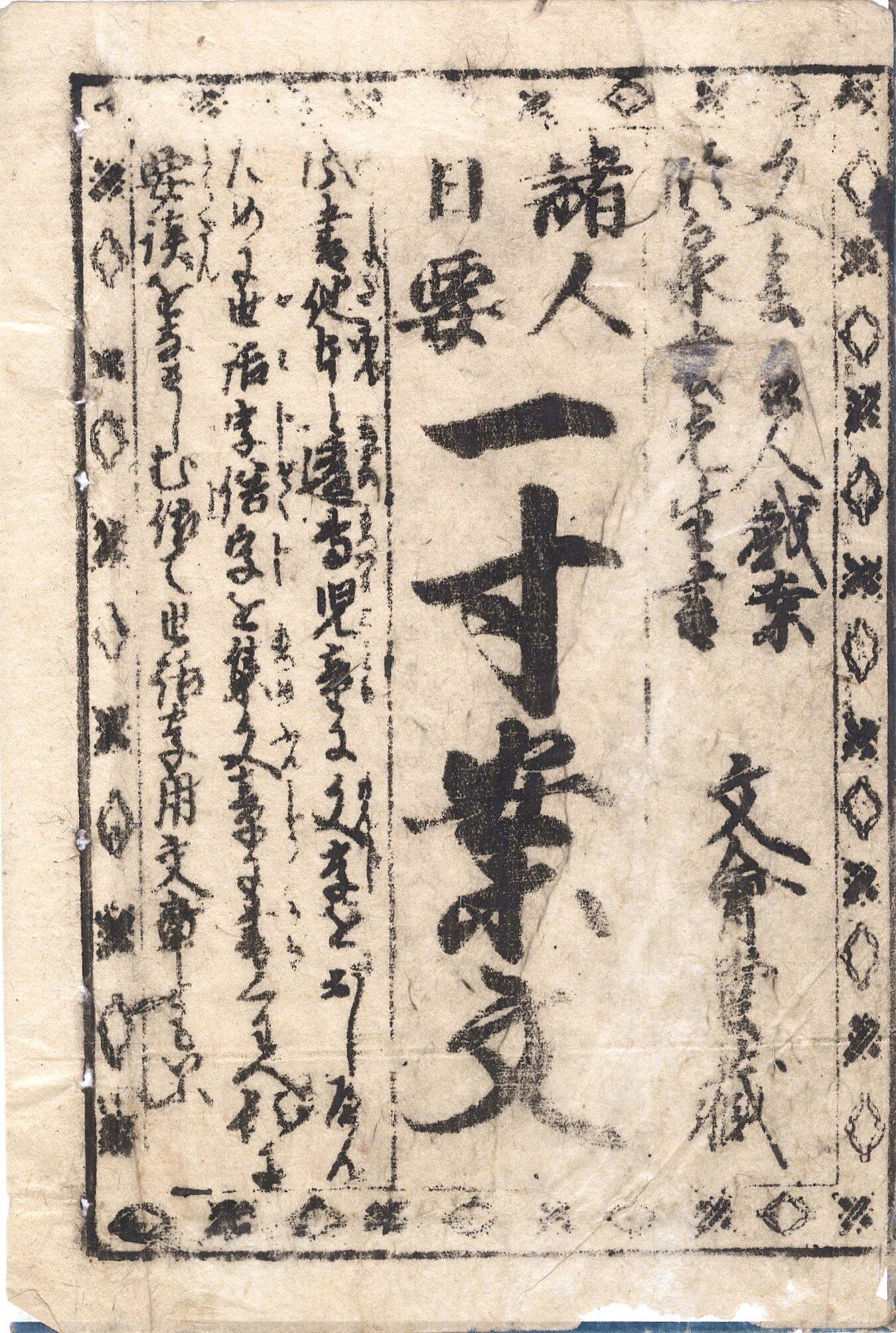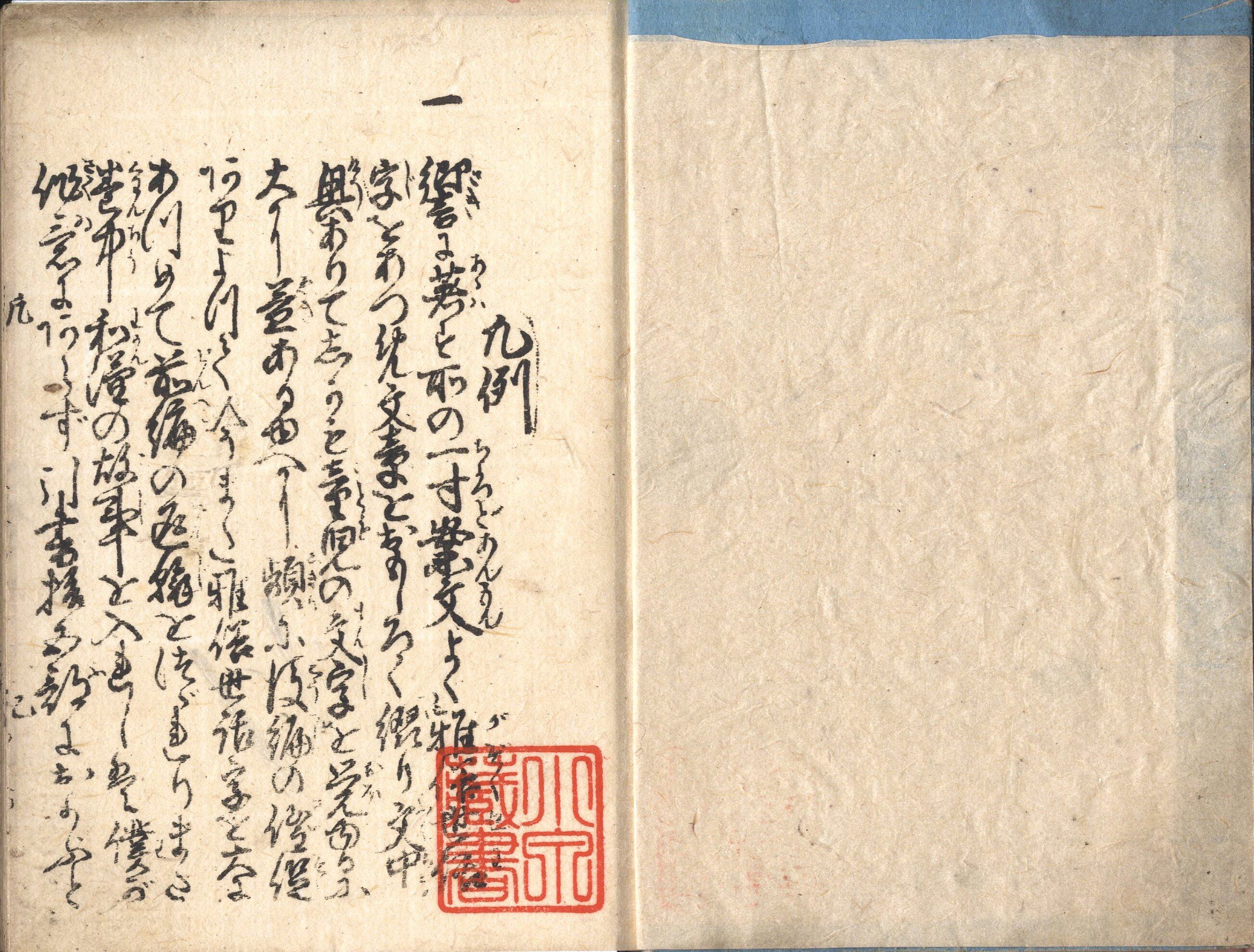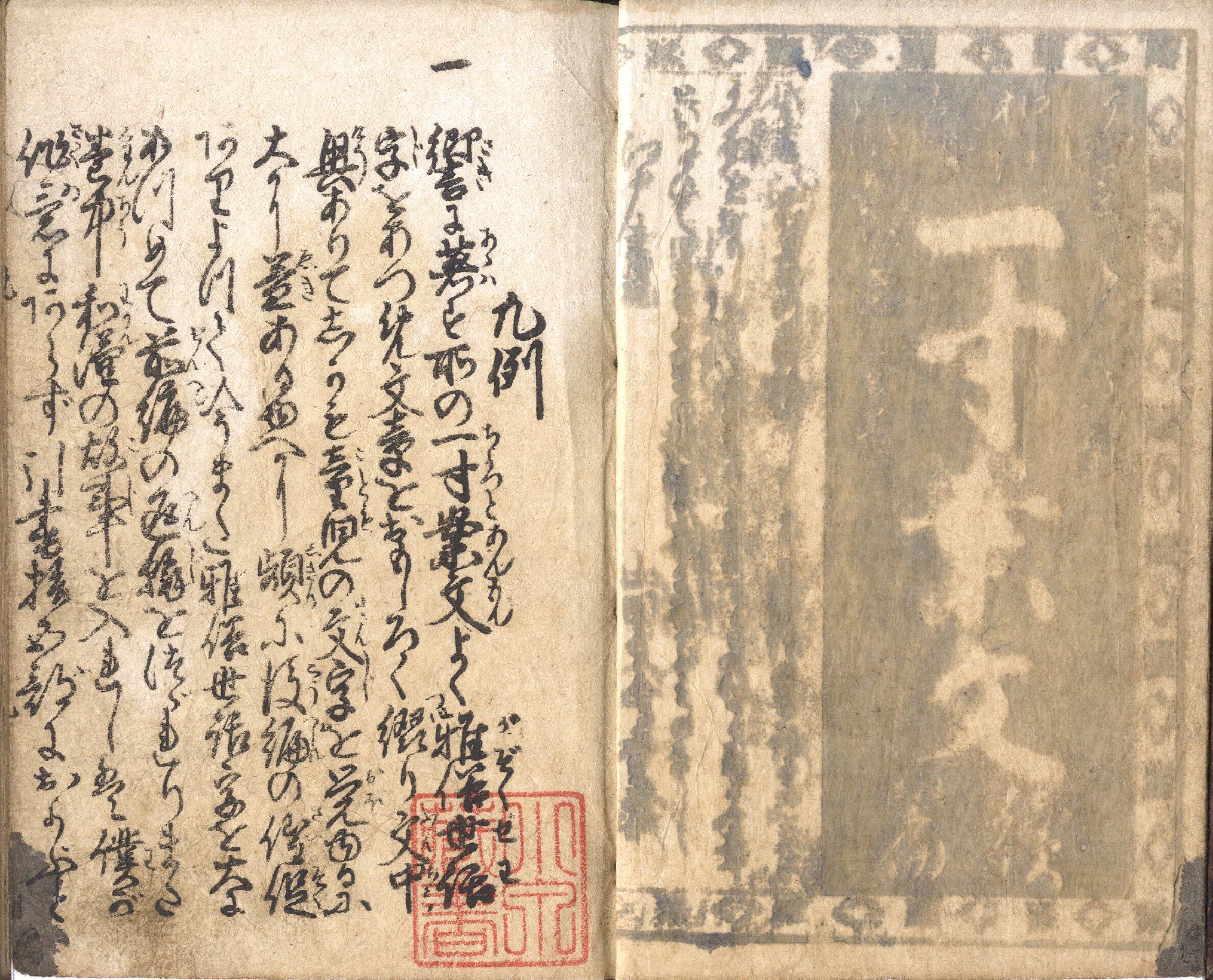 【備考】分類「往来物」。続編2種(抄録)と前後2編を合本した『大全一寸案文』(全冊を袋綴じ展開収録)を所収。『〈和漢故事〉一寸案文』は、『〈諸人日要〉一寸案文』の続編として編まれた用文章。前編ともに板元による編集。基本的に、往状のみの前編に対する返状を収録するが、「年頭状」「上巳の文」など数通の往状を含む(全58通)。前編同様に日用・俗用の例文を中心とし、戯作めいたものが目立つ。また、前半の四季用文中に年中行事の故事についての解説文を載せるのが特徴で、これが外題角書「和漢故事」の意味するところである。これに関しては、凡例に「巻中和漢の故事を入れしは僕が作意にあらず。引書十五部におよぶといへども、多く貝原先生の著述の諸書翻案して、その実事を知らしむ…」と記す。なお、前編と続編を合綴した『大全一寸案文』や、本書に続く3編『懐中案文』も刊行された。また、『大全一寸案文』は、山田屋佐助(文会堂)作・序。青木臨泉堂書・跋。天保7年刊(三刻)。[江戸]北島長四郎ほか板。『〈諸人日要〉一寸案文』(初編)と『〈和漢故事〉一寸案文』(続編)を合綴した用文章で、合計115通を収録。なお、本書広告に「此書、他本と違、専児童に文字をおしへんために世話字・俗字を集、文章に書くわへ、頓(とみ)に要談をなさしむ。依て『世話字用文章』ともいふ」と記す。