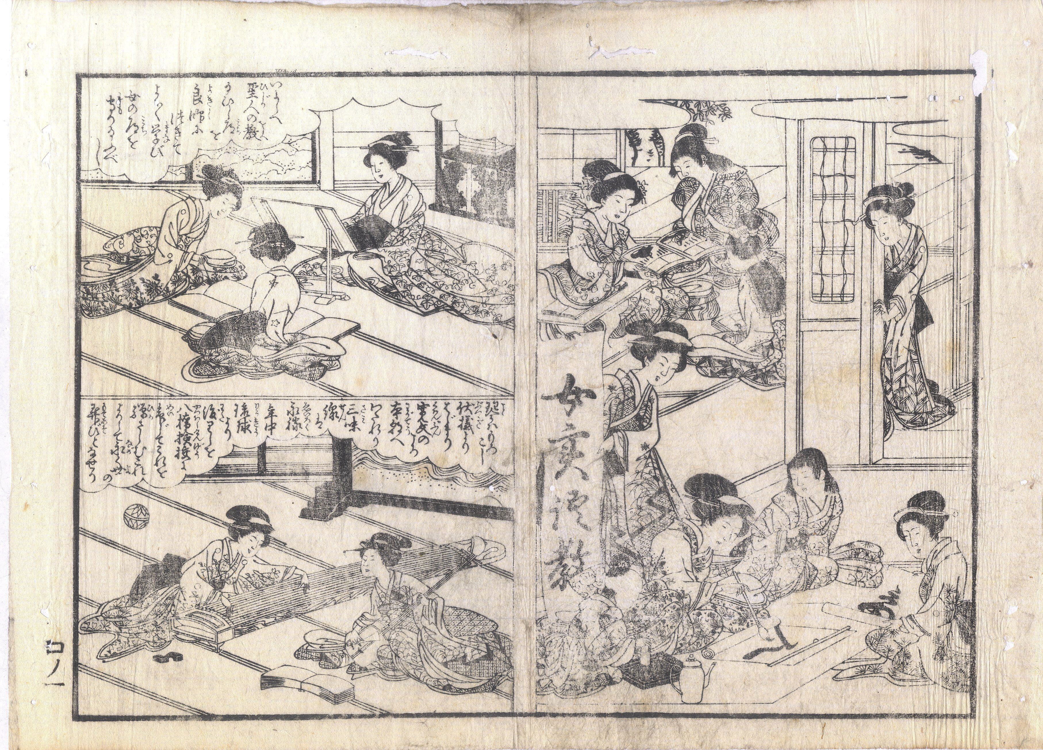 【備考】分類「往来物」。同板別本など4種を収録(全冊は袋綴じ展開収録)。男子用の合本科往来である安永5年刊『寺子調法記』を模倣して編んだ女子用往来。文化板では「女実語教」「女商売往来」「女今川」の3本を収録する。一方、天保13年再板本では「女手習教訓状」を増補し、収録順序を「女実語教」「女今川」「女手習教訓状」「女商売往来」と改めた。このうち、「女実語教」は元禄8年刊『女実語教・女童子教』(居初津奈作)の本文を「女実語教」と「女童子教」に分けずに一本化したもの。「女今川」は貞享4年刊『女今川』とほぼ同文。また、「女商売往来」は、元禄7年刊『商売往来』(堀流水軒作)を単に仮名交じり文に和らげたもの。冒頭に「凡、商売の家に生ゝ人は勿論、女とてもいづれの妻となるらん、持扱文字、員数、取遣之日記、証文、注文…」と述べるが、特に女性を意識して書かれた箇所はない。従って、その内容面よりも『商売往来』が初めて女子用往来に導入された意義の方が重要である。また、この部分を抽出した単行本もある。さらに、天保板で追加された「女手習教訓状」は享保元年刊『女手ならひ教訓の書』とは異文であり、実は天保2年刊『〈教諭必用〉女古状揃』所収の「女手習織縫教訓状」をほぼそのまま踏襲したものである。いずれも本文を大字・6行(それぞれ冒頭丁表のみ5行)・付訓で記す。文化板の前付・頭書には「琴・三味線由来」「香のきゝやう」「歌かるたの事」「茶湯の事」「双六のはじまり」「女身持鑑」「女中言葉づかひ」「婚礼云まじき詞」「小笠原折形の図」「大日本国尽」「京都町尽」「男女相性の事」「縫物秘伝」「家名尽」「女中名頭字」「諸道具字尽」「衣類の字」「草木字尽」「四季の文づくし」「書初詩歌」「七夕詩歌」「十二月倭名」等の記事を載せるが、天保板では「女手習教訓状」部分の頭書が追加されるなど若干の変更が生じた。