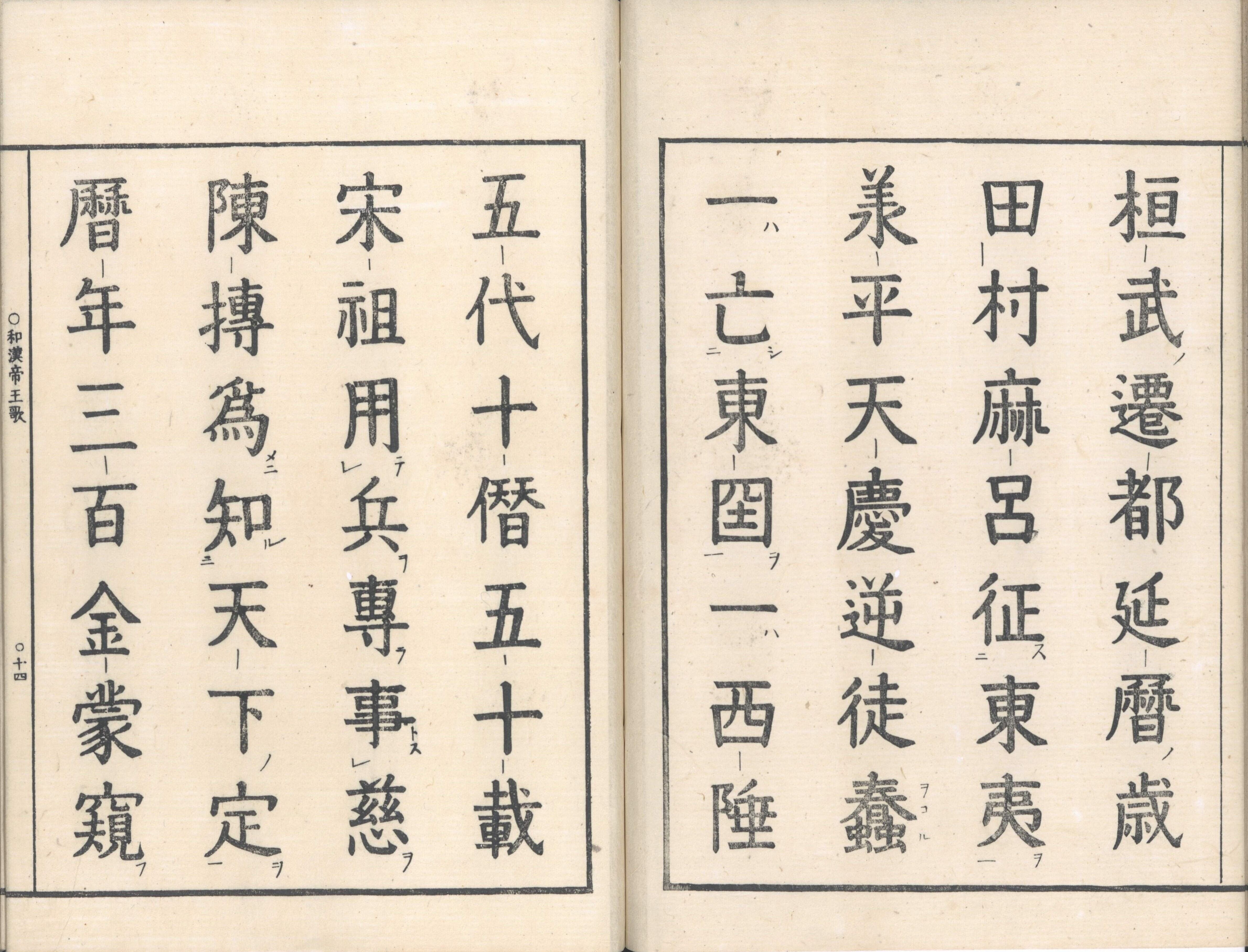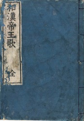 【備考】分類「往来物」。同板別本も抄録した。『和漢帝王歌』は、「我邦開闢圀常立、神祇年代幾相襲、上古荒唐不可論…」で始まる七言168句の文章で、古代から近世までの本朝皇統と中国皇帝の歴史を綴った往来物。各時代の情勢を対比させながら和漢二大王朝の歴史を略述した点に特色がある。末尾は大政奉還以後の日本の現状を「将軍職廃社稷移、王政復古万民歓、日月高懸無尽期」と述べて結ぶ。本文を楷書・大字・4行・無訓で綴る。