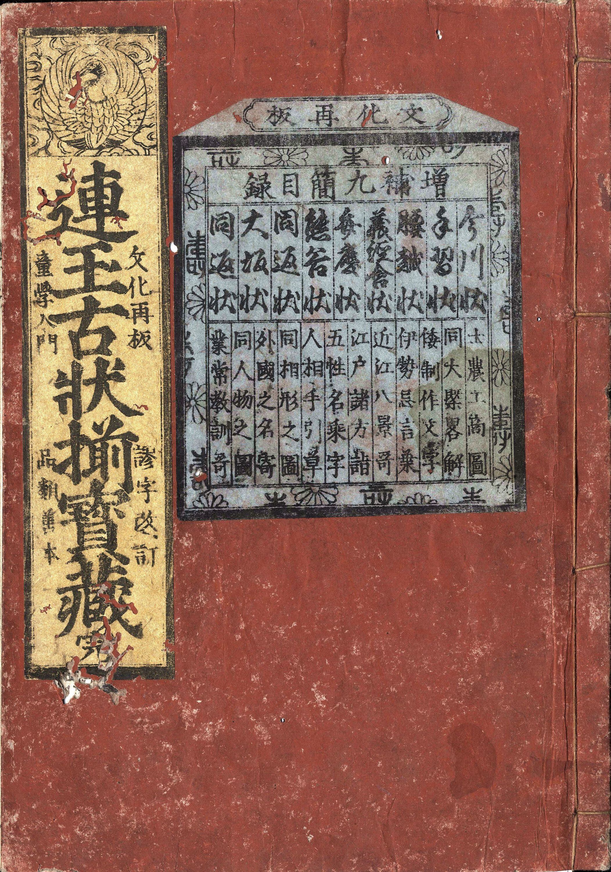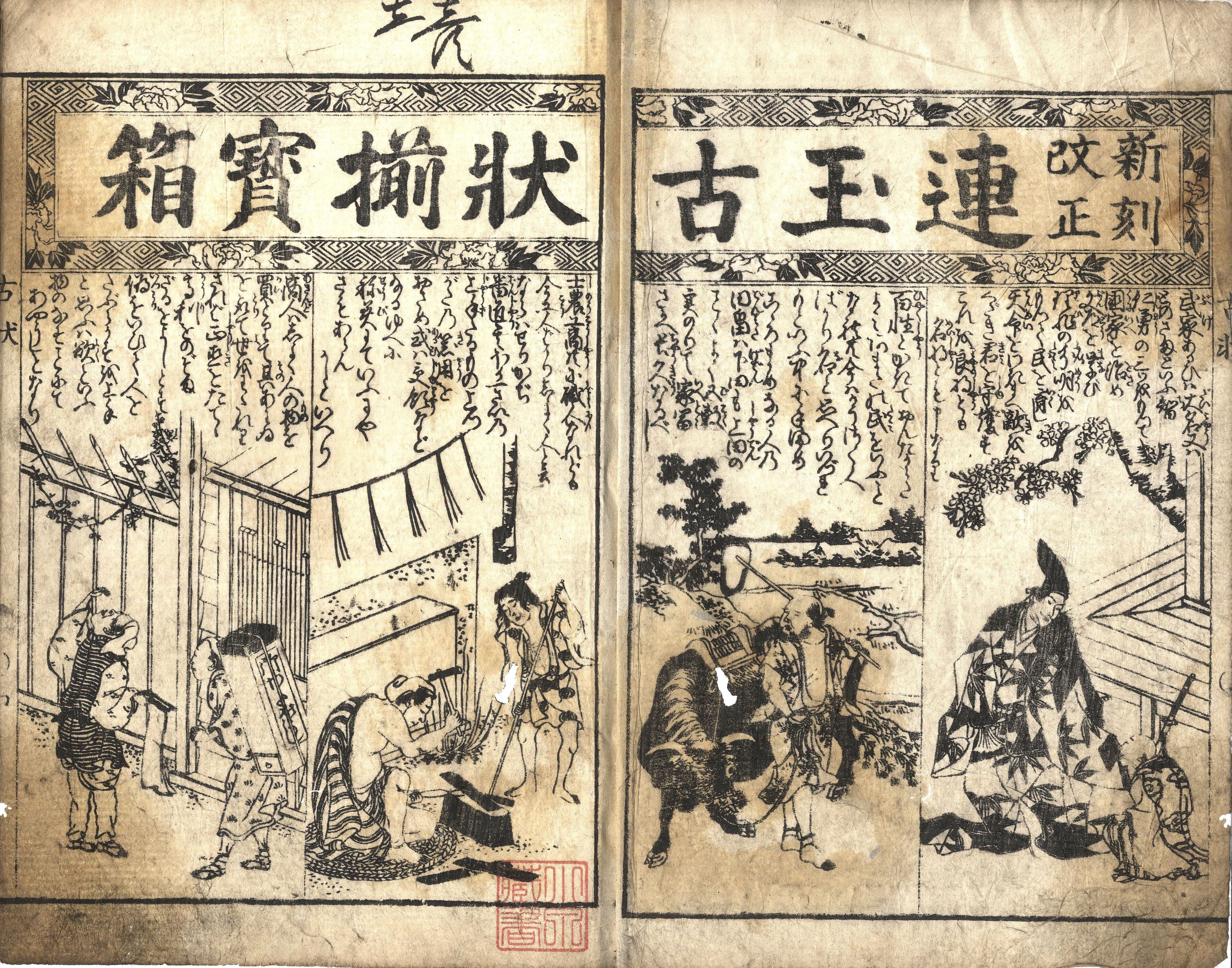 【備考】分類「往来物」。安永初板本のほか再板本など6種を収録した。『古状揃』は近世初頭に『今川状』を中心に『腰越状』『含状(義経含状)』『弁慶状』『直実送状』『経盛返状』『曽我状』『大坂状』などの古状・擬古状や、『初登山手習教訓書(手習状)』『風月往来』などを組み合わせて出版した往来物。近世期を通じて最も流布した往来物の一つ。本書本文には、今川状・手習状・腰越状・義経含状・弁慶状・熊谷状(送状)・経盛返状・曽我状・同返状・大坂進状・同返状の11状を収録。また巻頭に「士農工商図」「近江八景歌」「和俗制作の文字」「伊勢斎宮忌詞」等、頭書に「江戸名所往来」等を掲げる。