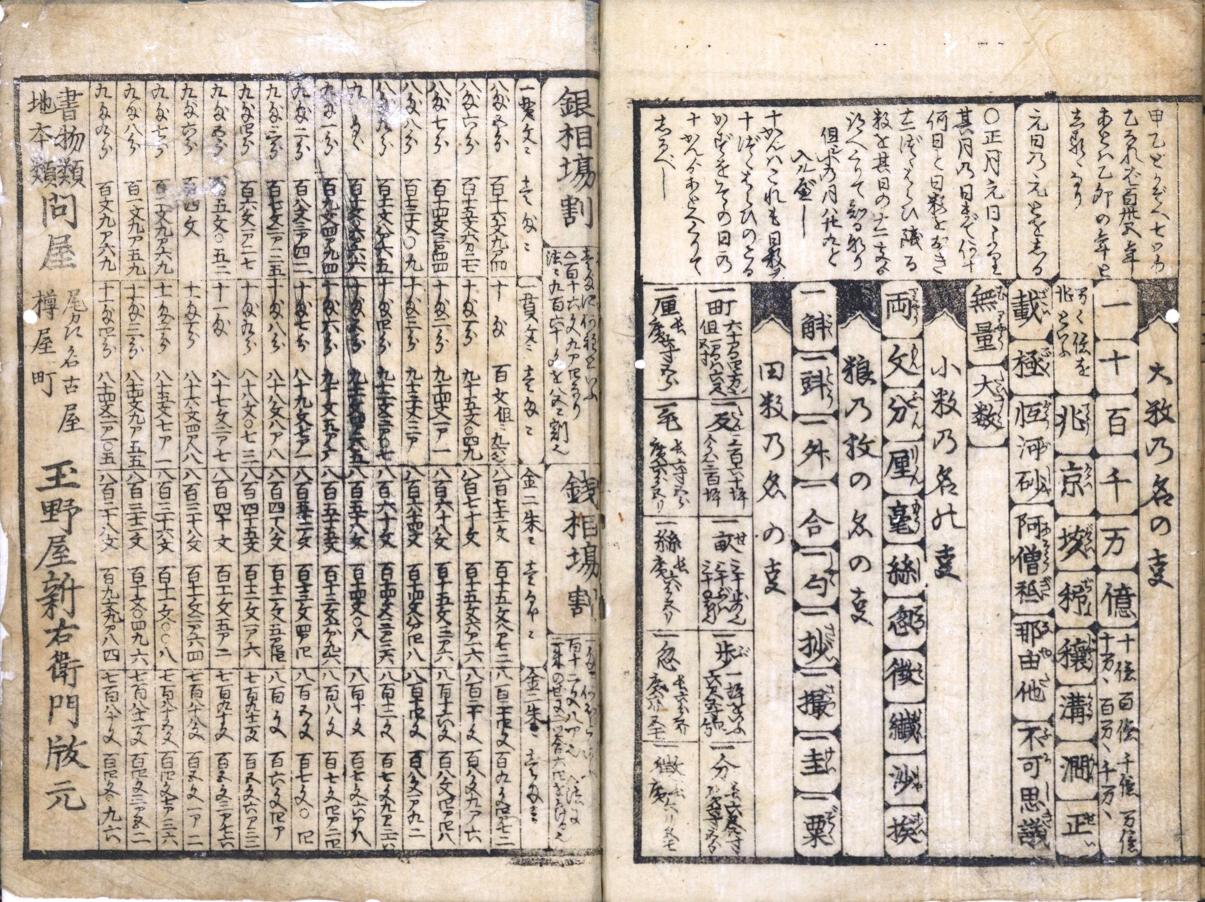 【備考】分類「和算」。『塵劫記(仮称)』(玉野屋新右衛門板)は、全12丁の簡易な和算書。巻頭に「まゝ子ざん図」「銀づかひの早割」「九九のかず」を掲げ、続いて、本文欄に「相場物之買の事」「ねづみざんの事」「かけてわれるさんの事」「二割之図」~「九割之図」、「同掛算」「見二図」~「見九図」、「わりてかけるさんの事」「諸物軽重の事」「大数の名の事」「小数の名の事」「粮の数の名の事」「田数の名の事」、また、頭書に「いれ子ざん」「杉形積俵のかずをしる事」「油売買の事」「油はかりわくる事」「田畑間数名の事」「銀相場わり」「もめんうりかひの事」ほかを載せる。また、裏表紙見返しに「銀相場割」「銭相場割」の一覧を掲げる。