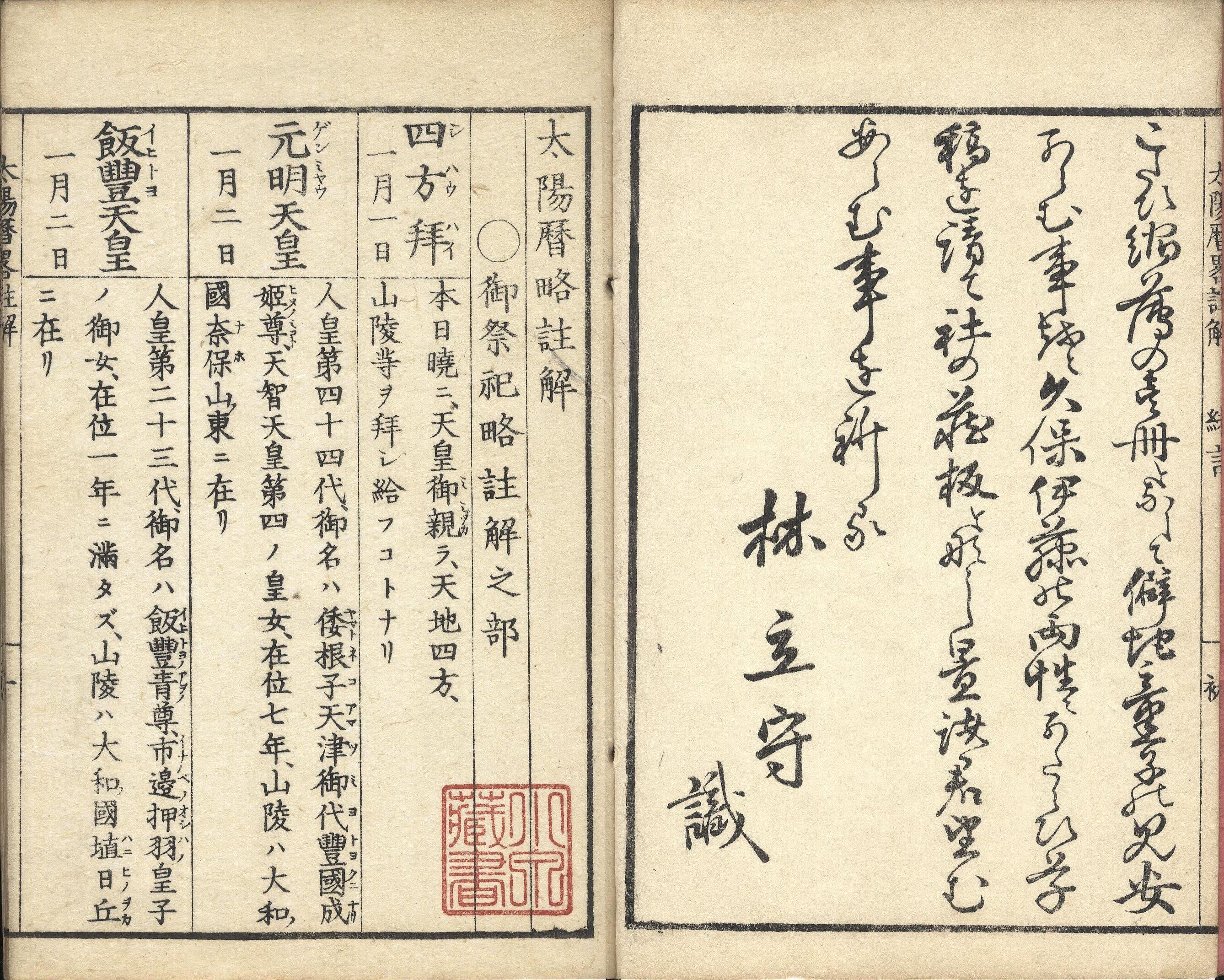 【備考】分類「往来物」。太陽暦における祝祭日や暦目などの暦関連事項を解説した教科書。前半の「御祭祀略註解之部」は「御祝祭日ノ由縁、御歴代ノ御名、在位年数、山稜所在等」で、久保が「開知新聞欄内典拠ノ条、史略類、並ニ帝王略譜、歴朝大綱ナド」を参酌してまとめたもの。また、後半の「暦要略註解之部」は、「紀元」「平年・閏年」「大月・小月」、「冬至」「小寒」「大寒」「春分」等の主要な暦占用語を伊藤氏が集めて解説したもの。