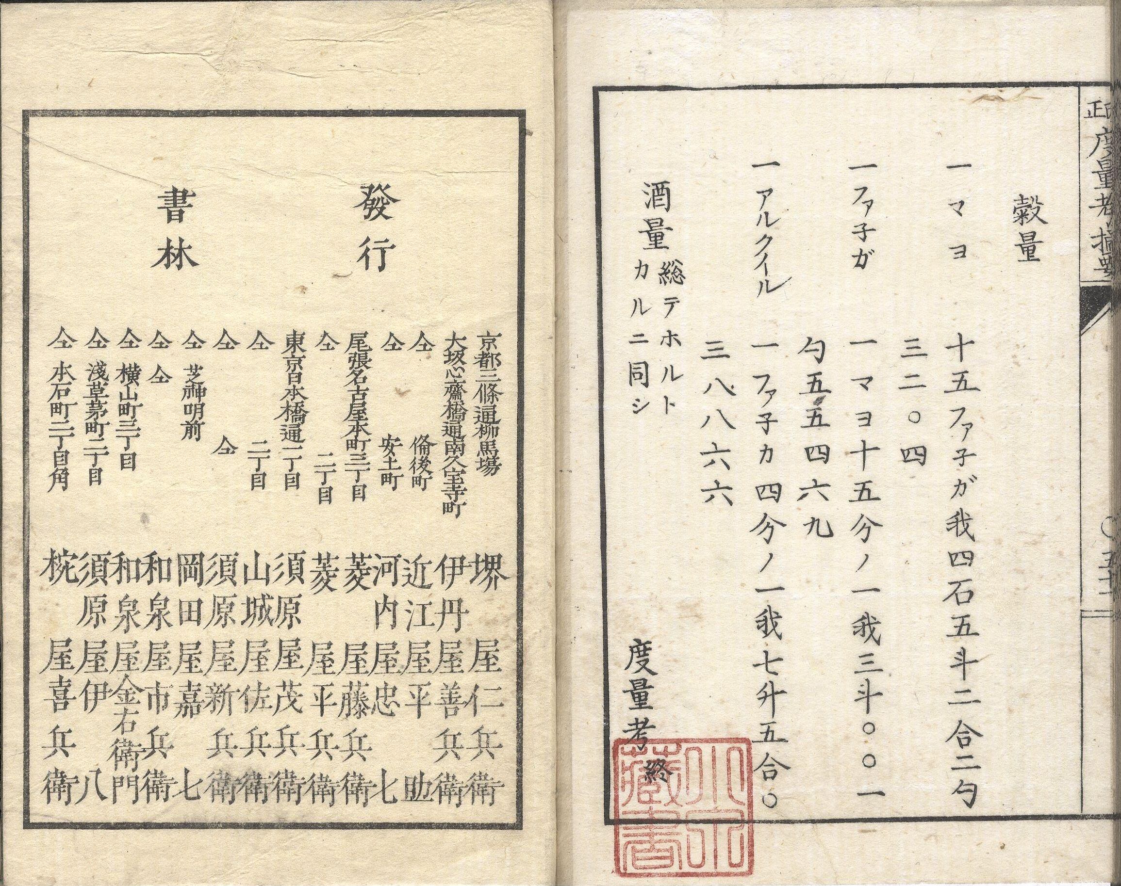 【備考】分類「往来物」。各国の度量衡の不統一は明治初年の貿易商の悩みの一つであったが、それを解決するために主要国の度量衡の単位を日本の単位と比較させながら解説した実用便覧ならびに教科書。日本・中国・イギリス・アメリカ・フランス・ロシア・オーストリア・ローマ・プロシア・オランダ(全国・南北の両方を併記)・ポルトガル・スペイン・スウェーデン・スイス・トルコなど一八カ国について紹介する。例えば、イギリス「長短尺」項には「一インチ/十二ライン、即チ大麦三粒ノ長サ、我八分三厘六毛三ト九分ノ八」、また同「時刻」項には「一秒時/我昼夜平等ノ半時ヲ三千六百分ニシタルノ一」などのように説明する。世界各国との通商が頻繁になった明治期ならではの教科書である。