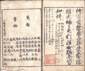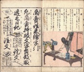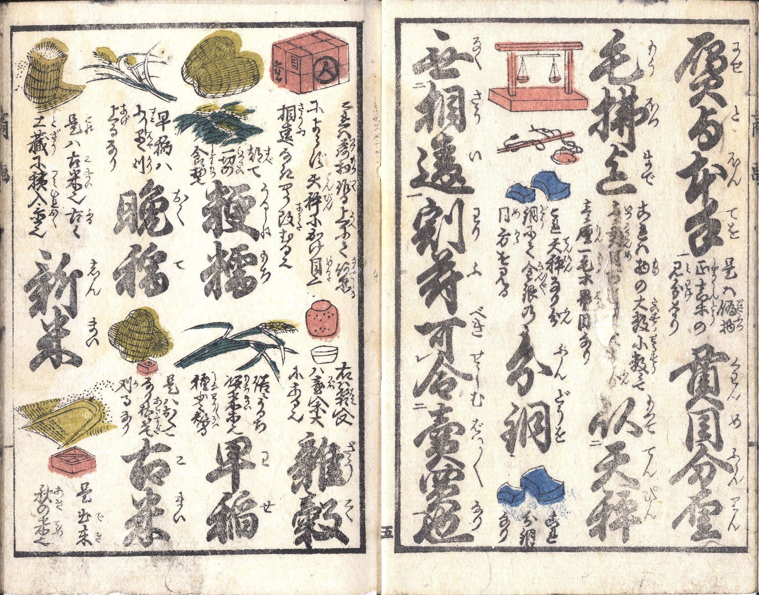 【備考】分類「往来物」。初編3種と2編2種を全冊収録した。初編:元禄7年刊『商売往来』本文のほとんどの語句に図解と割注を施した、庶民の生活図鑑とも言うべき往来。各丁とも大字・4行・付訓の本文に、語句に続けて図解等を挿入する。挿絵は多く5~10色の多色刷り(単色の場合もある)で、その大半に平易な略注を付す。本書には異板が多く、又玄斎南可の序文を付さないもの、狭川半水の序と長谷川貞信画の「士農工商図」等を付すもの、小型化したものなど様々ある。また、本書に続いて2編も刊行されたほか、本書にならった元治元年刊『道具字引図解』(初・2編)もほぼ同時期に刊行されている。2編:『商売往来絵字引』(初編)の続編として編まれた図鑑風の往来物。初編に漏れた語彙を集めたもので、見返の序言によれば、「和漢の産物、其出る処を糺し、先、呉服・織物類を始め、青物・野菜・果物・乾物・餅菓子・酒肴・魚類より鳥獣・草花・虫・石・紙・書画・竹木等迄図解して悉く記す」とある。ただし、これらの分野についても、初編との語彙の重複がないように編集する。初編と同様に、本文を大字・4行・付訓で記し、語彙毎に図解を挟んで割注を施す。巻頭に「聖徳太子の略伝」を載せる。