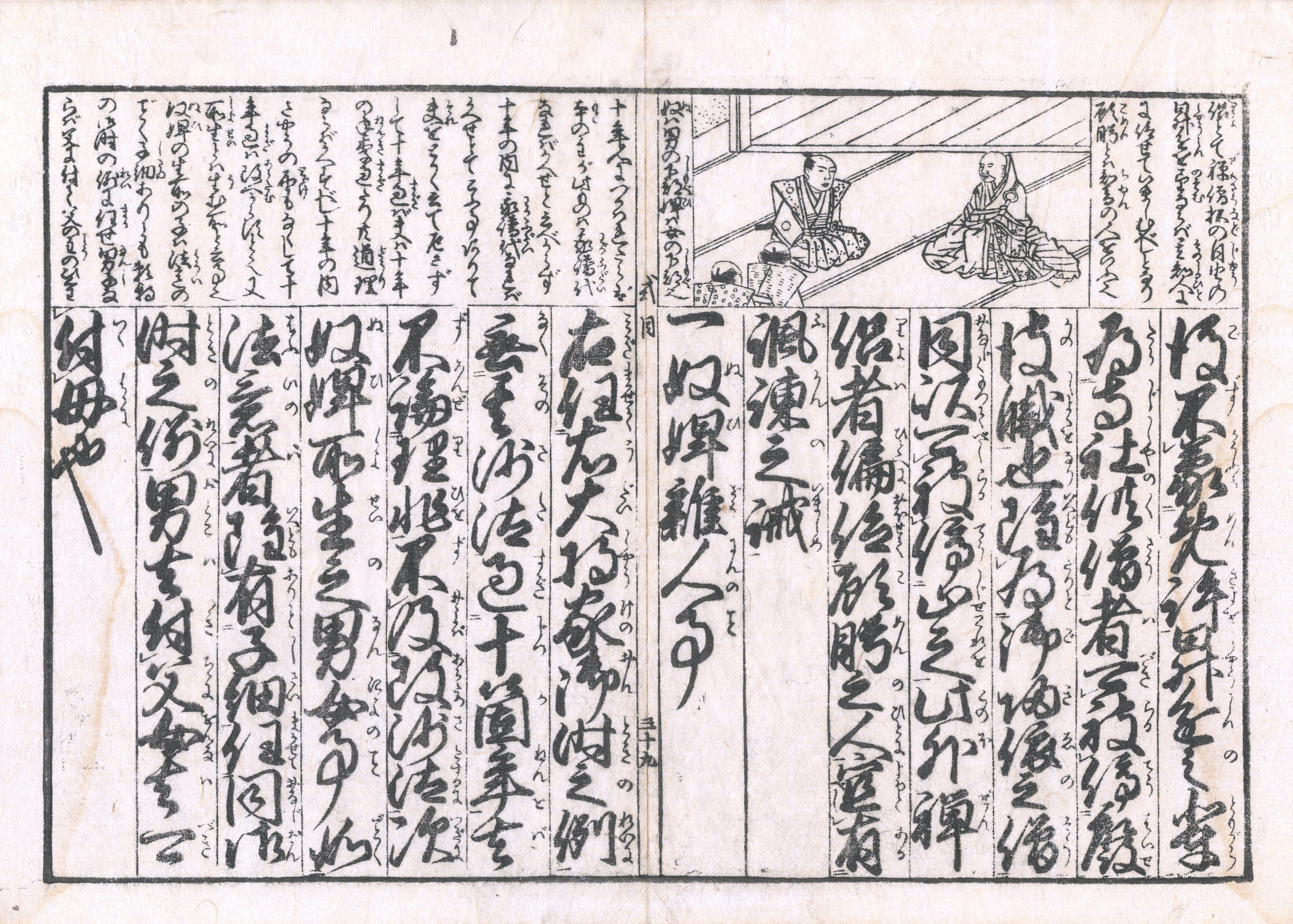 【備考】分類「往来物」。本文第3丁と第4丁が乱丁。本書は、十返舎一九が文政年間に大判絵題簽を付けて刊行した一連の往来物の一つ。本書は、家屋新築にあたり家具・調度類の新調を依頼する手紙文になぞらえて、日常生活に必要な家財・諸道具類を書き綴った往来。「家飾の具」「家財・調度」「庖厨道具」の三つに分けて紹介し、所々、加工の内容や素材、および名産地・種類等について付記する。本文を大字・5行・付訓で記す。頭書に、鼎・釜・壺など八つの家財の字義・故事・用途・形状などを挿絵とともに紹介した「家飾具器の図」を始め、「竈神(かまどがみ)の事」「献立認めよう(『童子諸礼躾方往来』の頭書と同じ)」や、解毒剤について記した「万毒けしの法」などを掲げる。