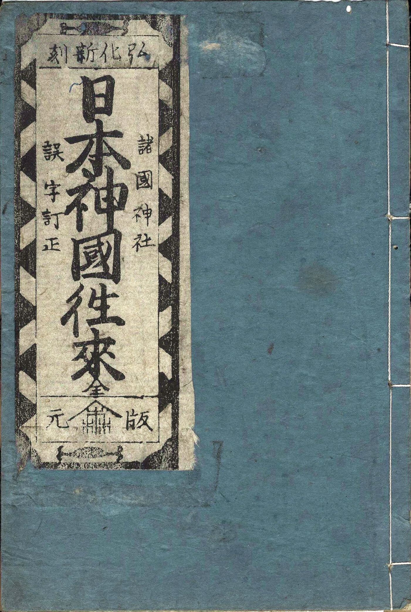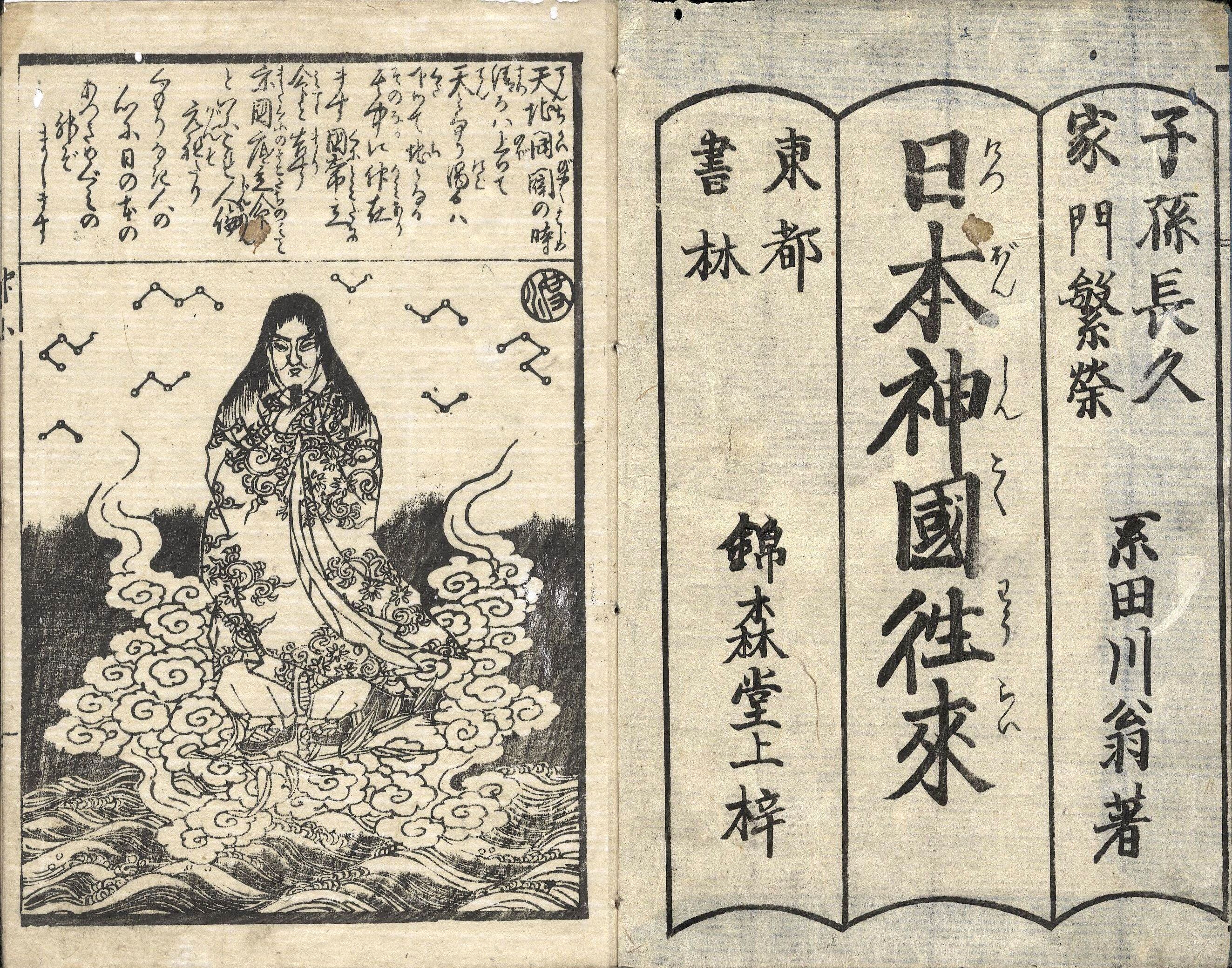 【判型】中本1冊。縦178粍。【作者】系田川翁作・跋。【年代等】弘化4年1月刊。[江戸]森屋次郎兵衛(錦森堂)板。【備考】分類「往来物」。題簽の異なる別本を全冊収録した。文化元年刊『神道倭文章』、文政7年刊『宗門往来』と同様に、宗教・宗派について扱った往来の一つ。神国たる日本の歴史を概説して神道の重要性を強調した往来。まず、日月星の「三光」が全て日本より出現したことや、「千界万国」の恵みは全て神の恩によること、源氏・平氏・藤原氏などあらゆる姓氏が神孫たることを説いて神国の証左とし、また、仏教が伝来して神道が衰微したために種々の災いが生じたことを述べ、さらに徳川幕府によって再び神事が復興し世の中が泰平になったとする。巻頭に「天地開闢の時」、頭書に「諸国一の宮記」の記事と若干の挿絵を載せる。