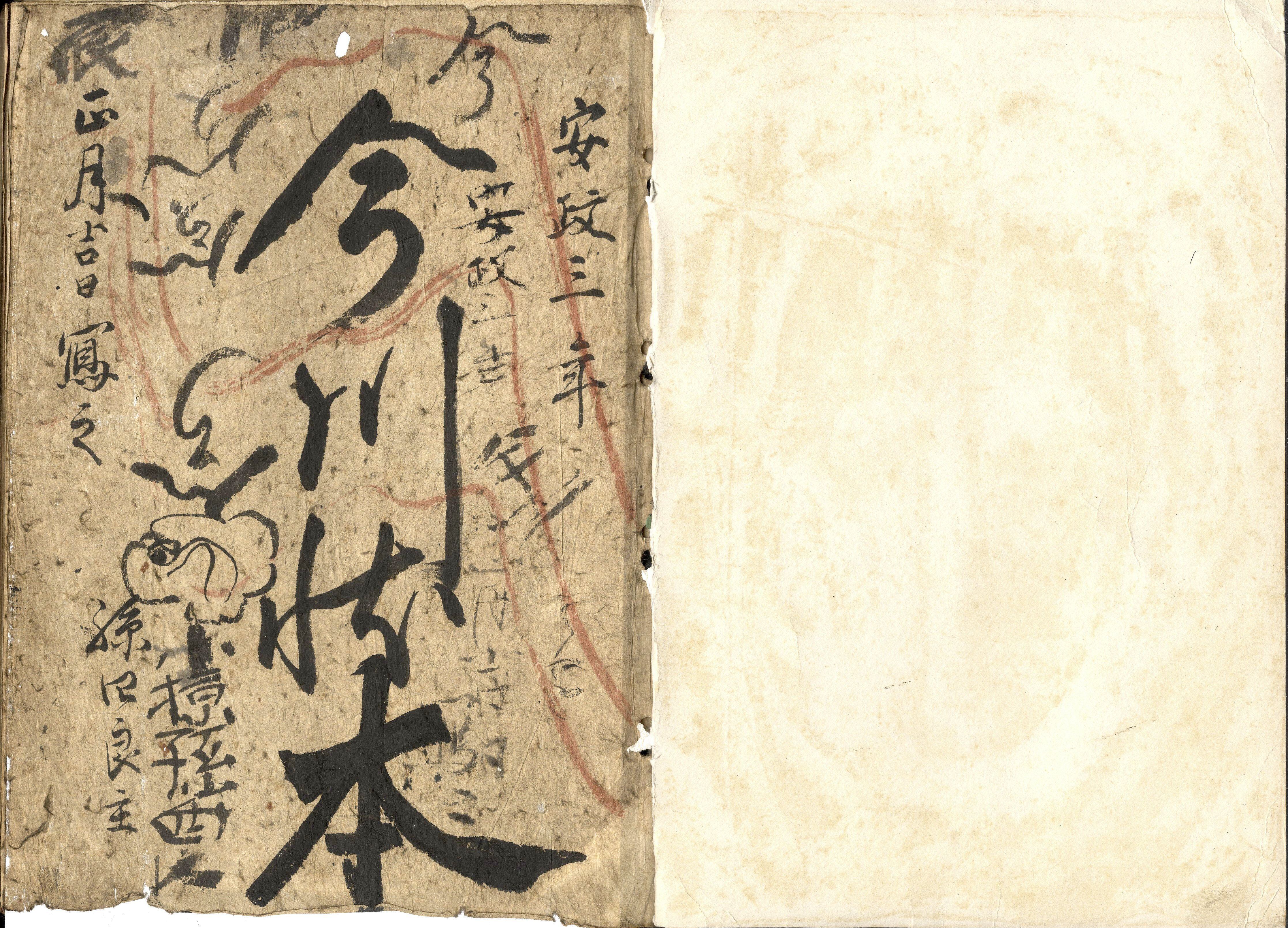 【備考】分類「往来物」。小椋孫四郎旧蔵本など複数の手習本を合本したもの。「今川状(安政3年1月書)」「人名頭・国尽(国尽文章)」「名頭字尽・諸役要字」「商売往来」「文章(2種)」を収録する。手習本の天地サイズはそれぞれ多少の違いがあるが、ここには表紙で測定。