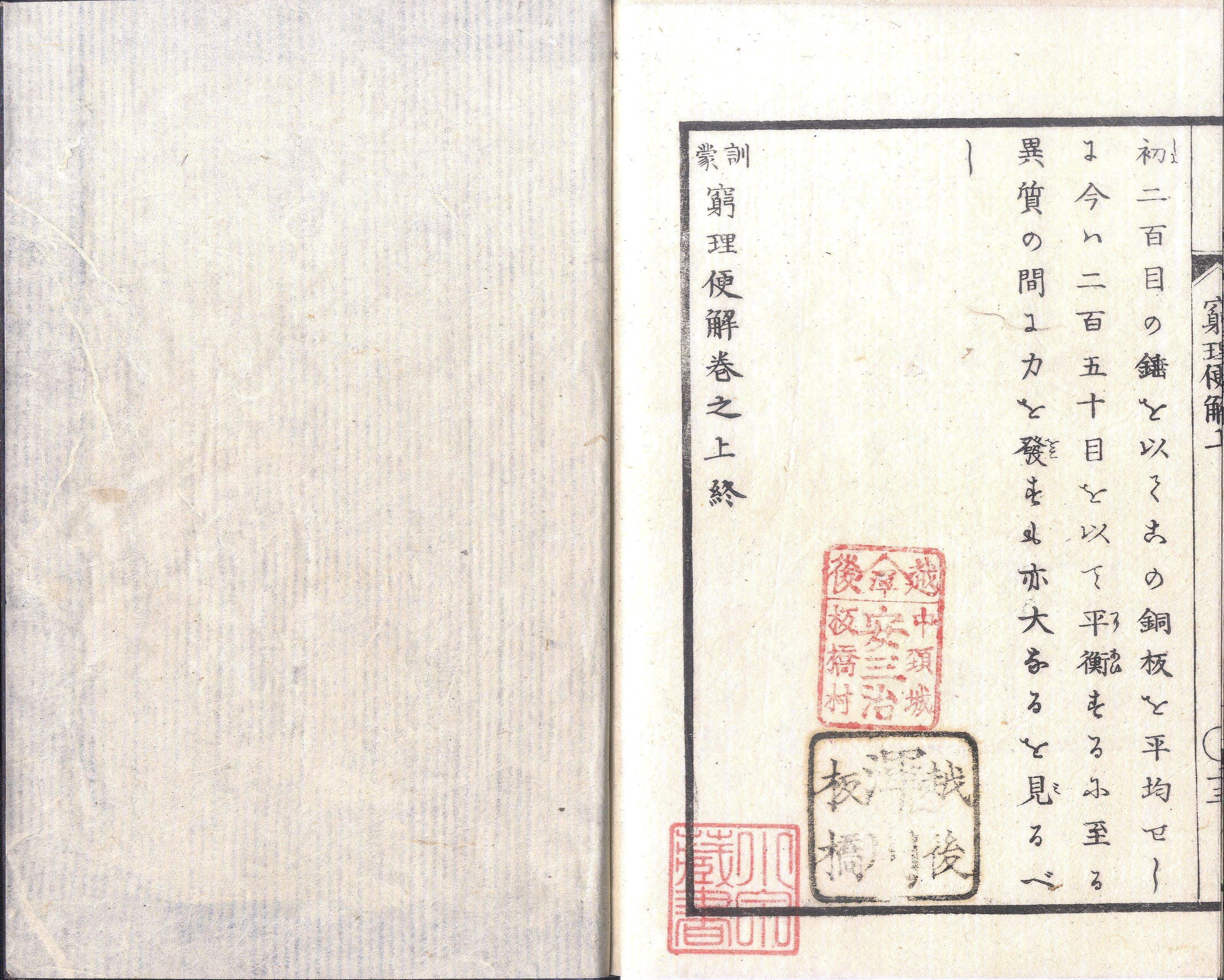 【備考】分類「往来物」。主として力学に関する諸説を、チャンブル著『イントロヂェクション、ツ、ゼ、サインスト(万学小引)』、ヲルムステット著『リュヂメンツ、ヲフ、ナチュラル、フィロソフィー、エンド、アストロノミー(博物通論)』、クワッケンブス著『ナチュラル、フィロソフィー(窮理書)』の3書から抄訳して編んだ初等教科書。各巻4章ずつからなり、上巻は鋭力、圧搾力・膨張力、凝聚力・粘着力、中巻には遠心力・求心力、引力、重心、細管力、下巻は扛子力、運動力、働力・抗力、摩軋力について説く。頭書にも適宜図解をしながら、その原理を平易に解説する。
