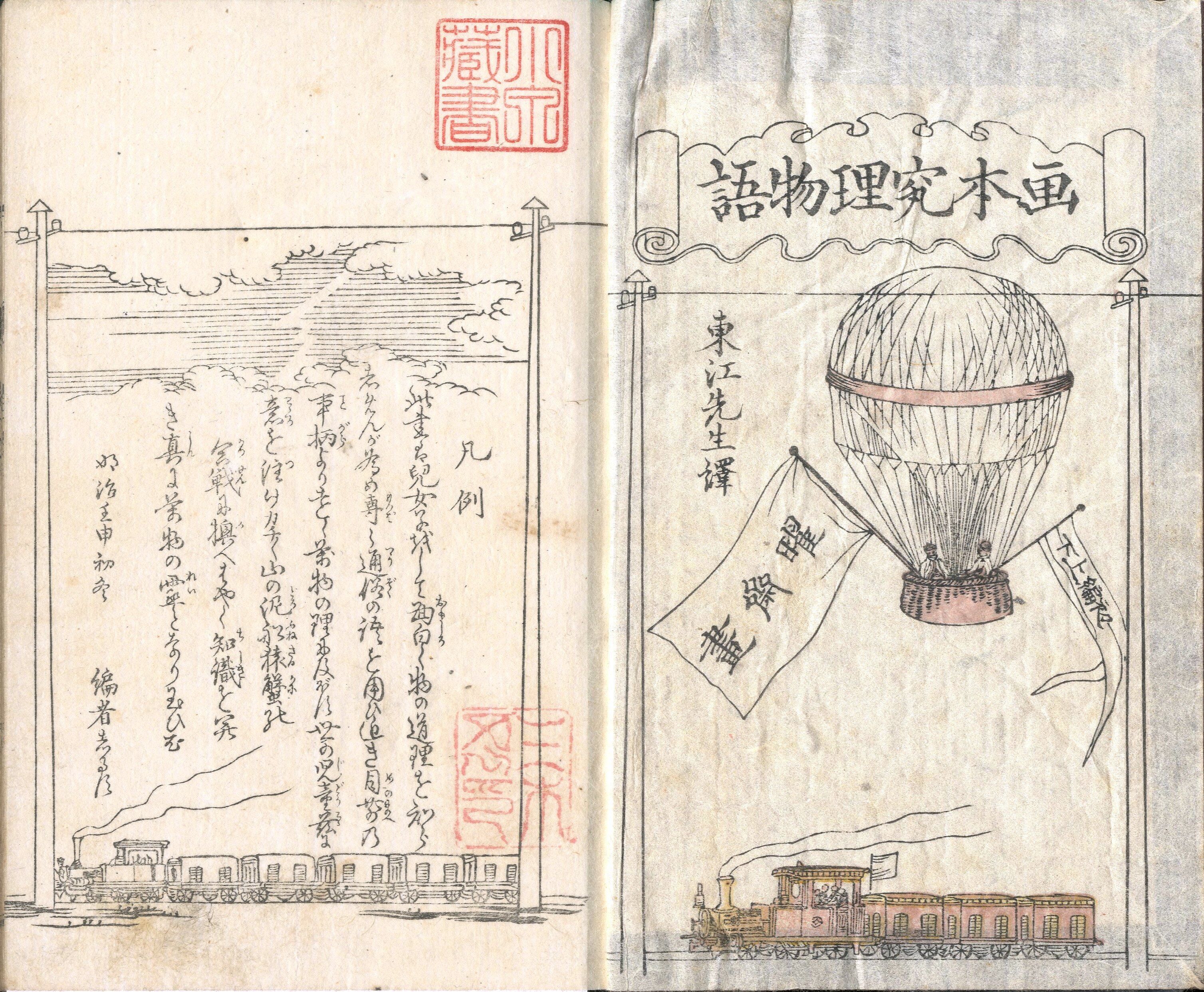 【備考】分類「往来物」。天文・地理・究理学を教授する東京下谷の英学教授所を舞台に、英蘭先生、同息子の羅馬(ロウマ)、以太利屋魯右衛門(イタリヤロエモン)、同息子の仏郎(フツロウ)の4人の対話形式で、究理学の概要を説いた第1回「発端」以下、第2回「雷鳴(カミナリ)の事」(以上上巻、以下下巻)、第3回「電信機の事」、第4回「風船の事」、第5回「飃風(ツムジカゼ)及竜巻の事」の5項について説いた絵入りの窮理学入門書。凡例に「此書は、児女子をして面白く物の道理を知らしめんが為め、専ら通俗の語を用ひ、近き目前の事柄より、遠く万物の理に及ぼす。世の児童、茲に意(ココロ)を注(ツ)け、カチカチ山の泥船、猿蟹の合戦に換へ、はやく知識を開き、真に万物の霊となり玉ひむ」と記す。なお、本書2編以下は未刊か。