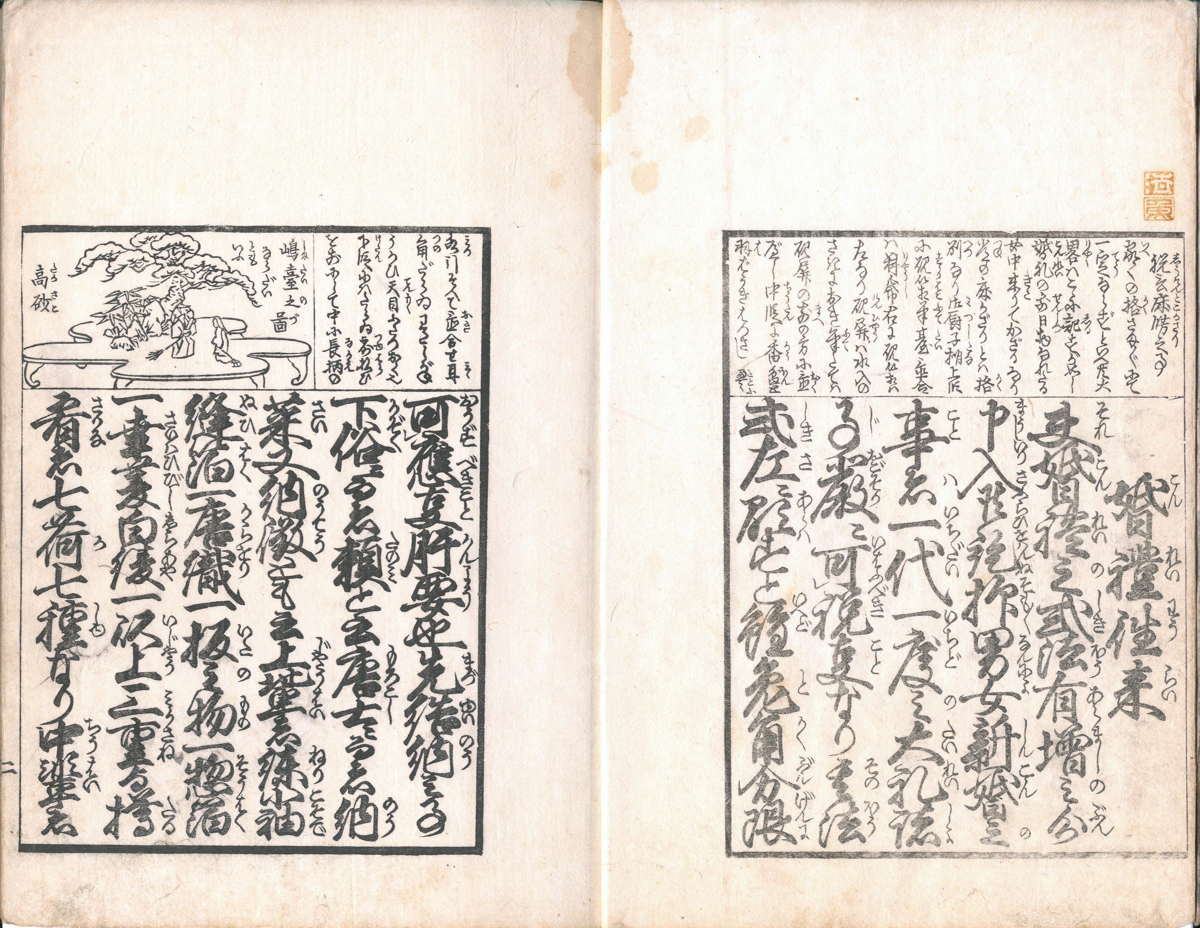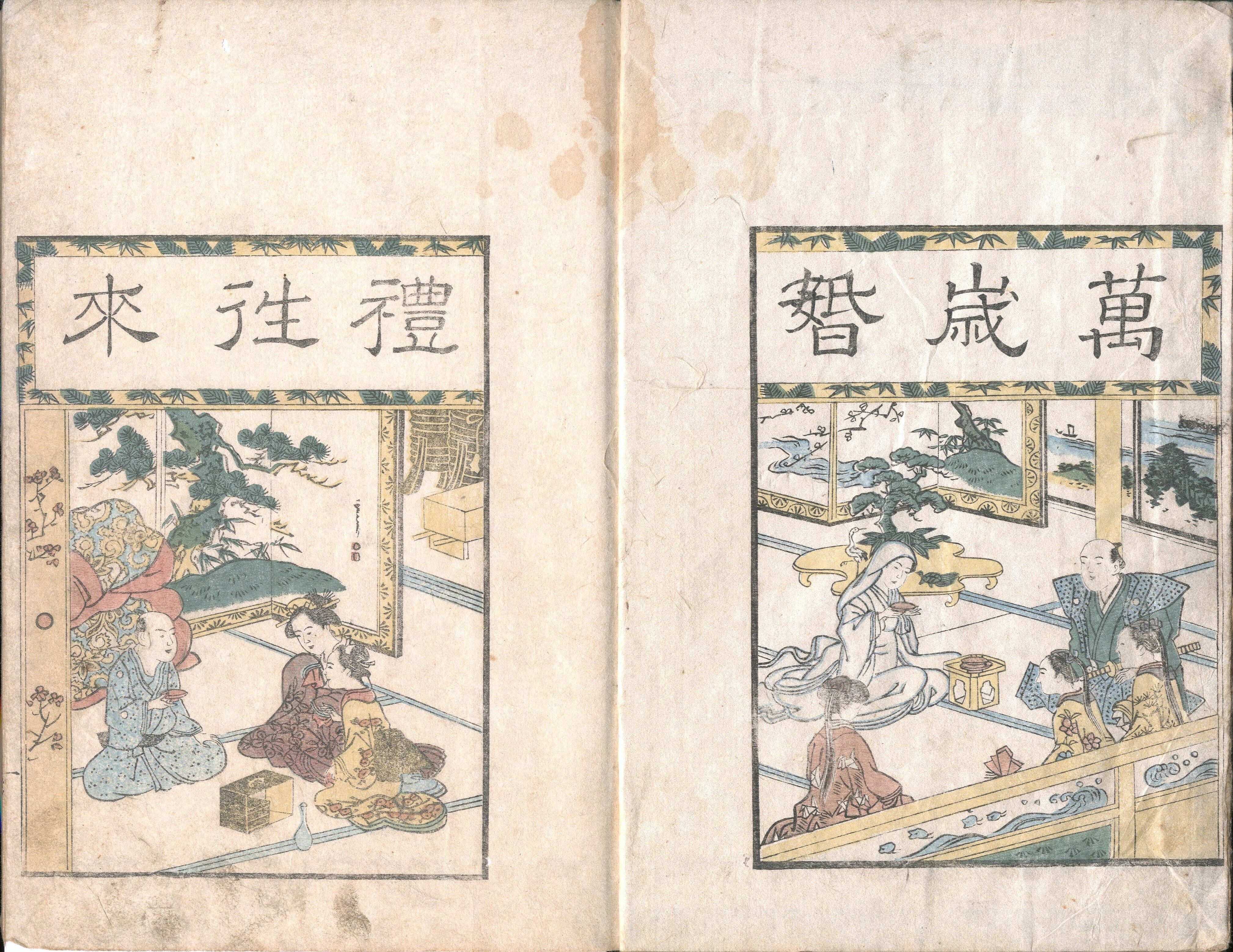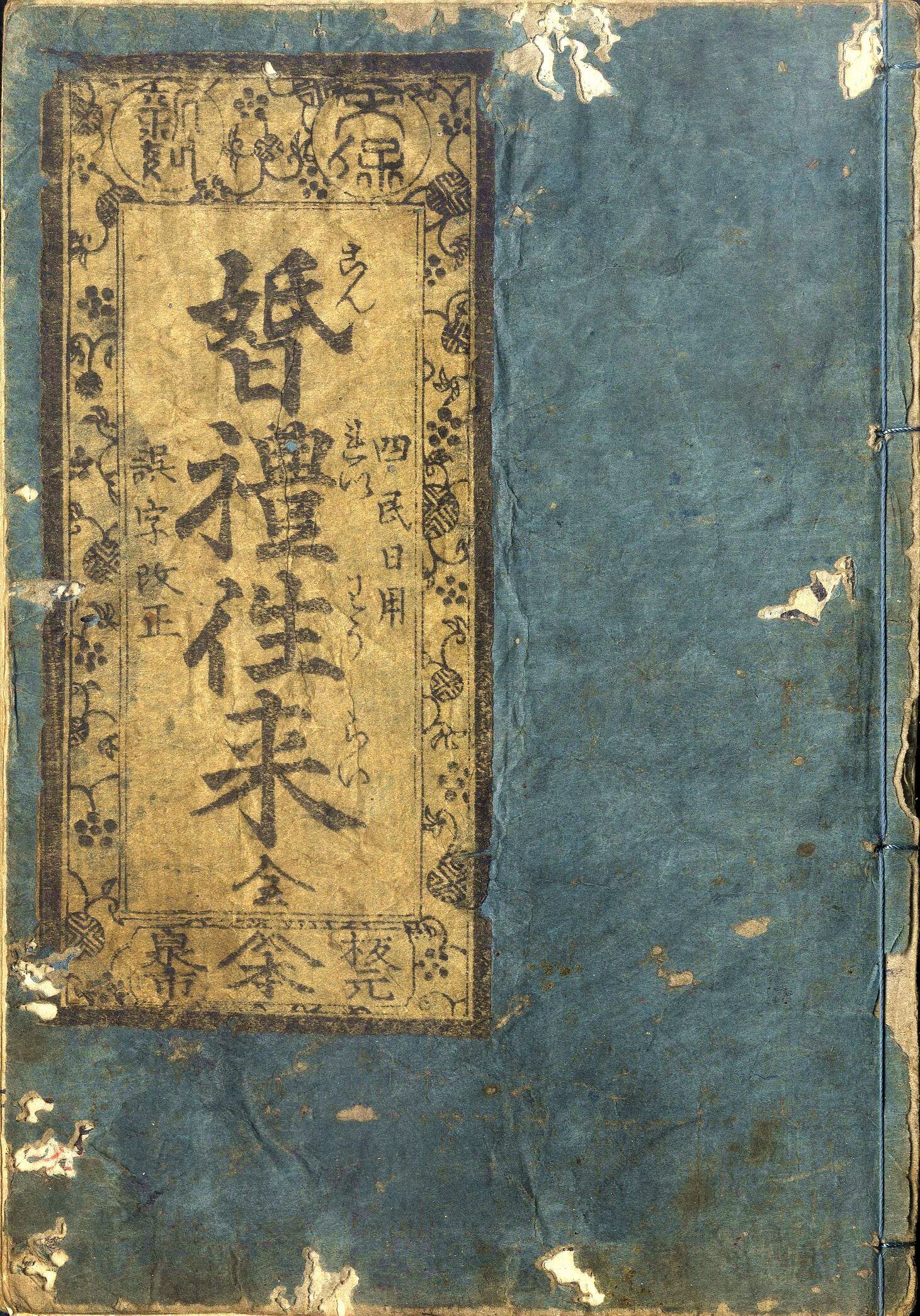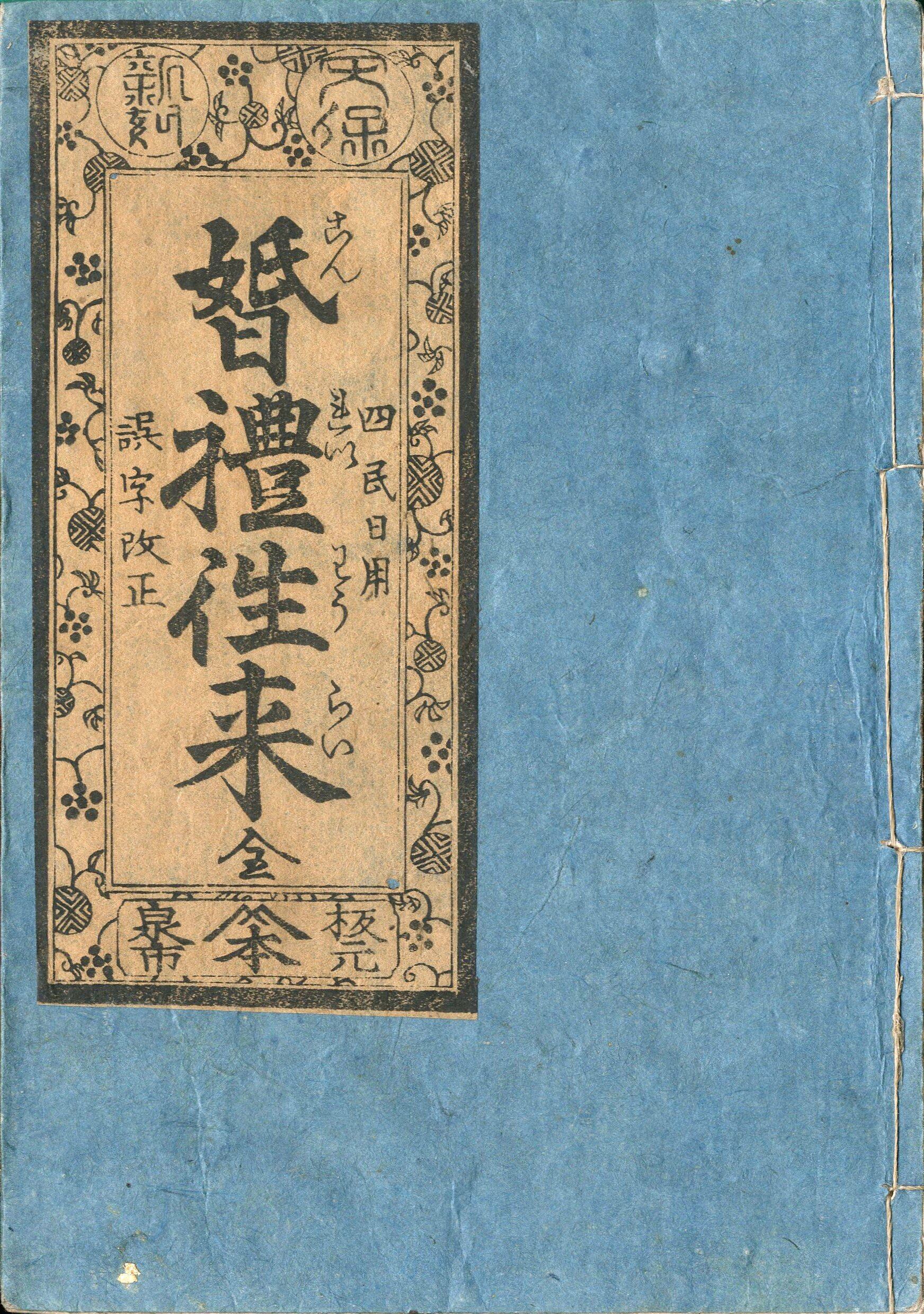 【備考】分類「往来物」。口絵のある早印本と口絵を割愛した後印本など合計7種を収録。『婚礼往来』は、婚礼について要用の事柄を記した往来。冒頭に、婚姻の大切さや分限に応じた婚礼儀式について述べ、続いて「結納」「嫁入」「婚礼」「見参」の順に、身分の違いにも触れながら式礼・膳の次第などについて比較的詳しく説く。本文をやや小字・六行・付訓で記す。巻頭に婚礼(式三献)等の図、頭書に「祝言床餝之事」「歯黒之事」「文字の濫觴の事」「琴のはじめの事」「碁・双六初の事」「雛遊之由来」「貝合せの事」「機織之由来」「縫針之事」「五節句之由来」「七夕歌尽し」を掲げる。後印本に「天保14年」の書き入れがあるので、それ以前の初刊だが、早印本の題簽角書に「天保」とあるので、天保年間初刊であろう。
