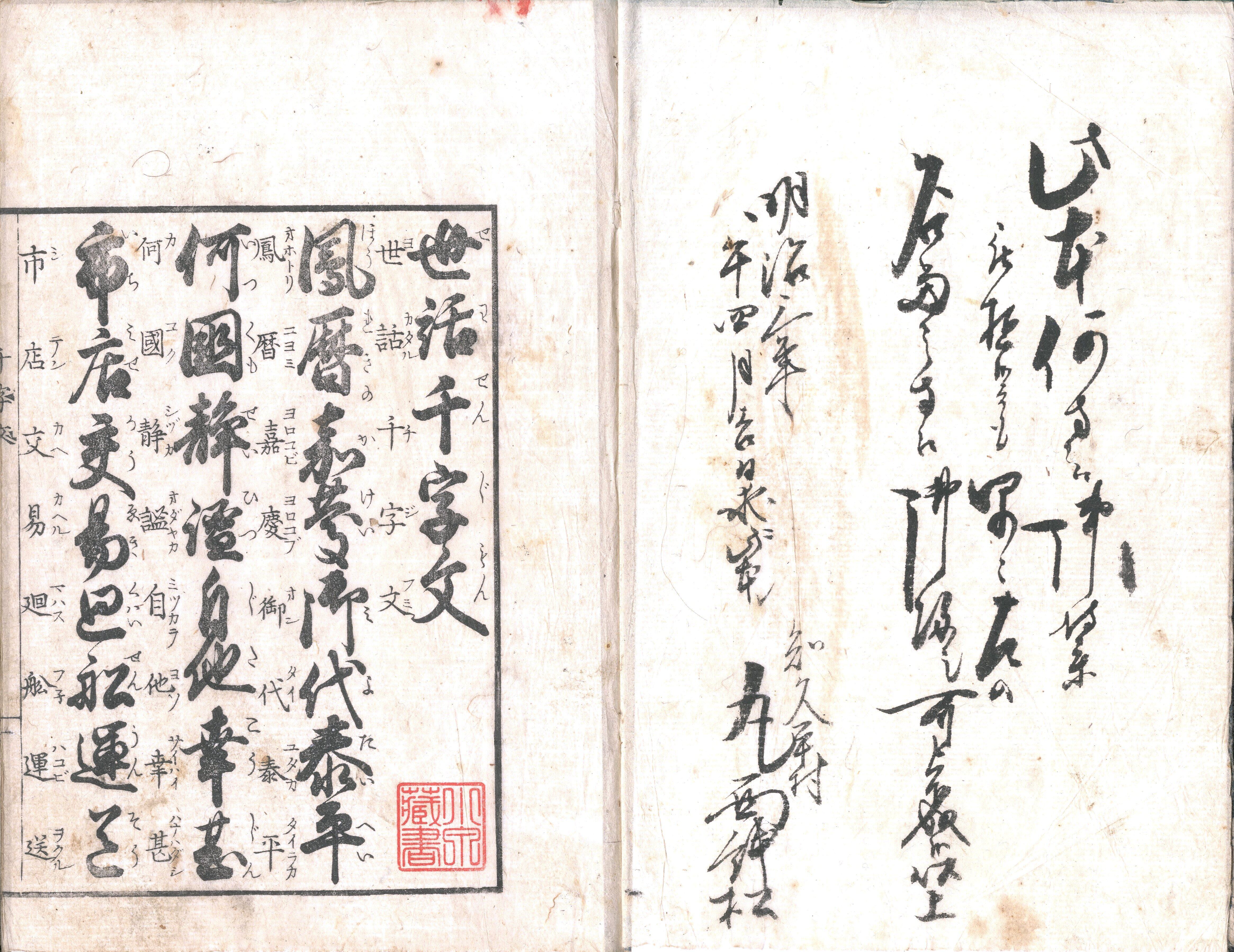 【備考】分類「往来物」。同板2種を収録。本書は、桑原空洞作、享保2年初刊『世話千字文』の本文を行書・大字・4行・付訓で記し、旁らに小字の楷書を添えた真艸両点形式の往来物。『世話千字文』は、『千字文』形式(1句4字、全250句1000字)で社会生活全般にかかわる語句を集めた往来。本文は「鳳暦賀慶、御代泰平、何国静謐、自他幸甚、市店交易、廻船運送、荷物米穀、駄賃員数…」で始まり、商売、普請、相続、徳目、婚姻、交際、人倫、師弟、装束、犯罪、交通、消息、観光、神社仏閣、宗教、病気・養生、公務等々に関する事柄を記し、最後に幕府の仁政を讃えて「千秋万歳」と結ぶ。