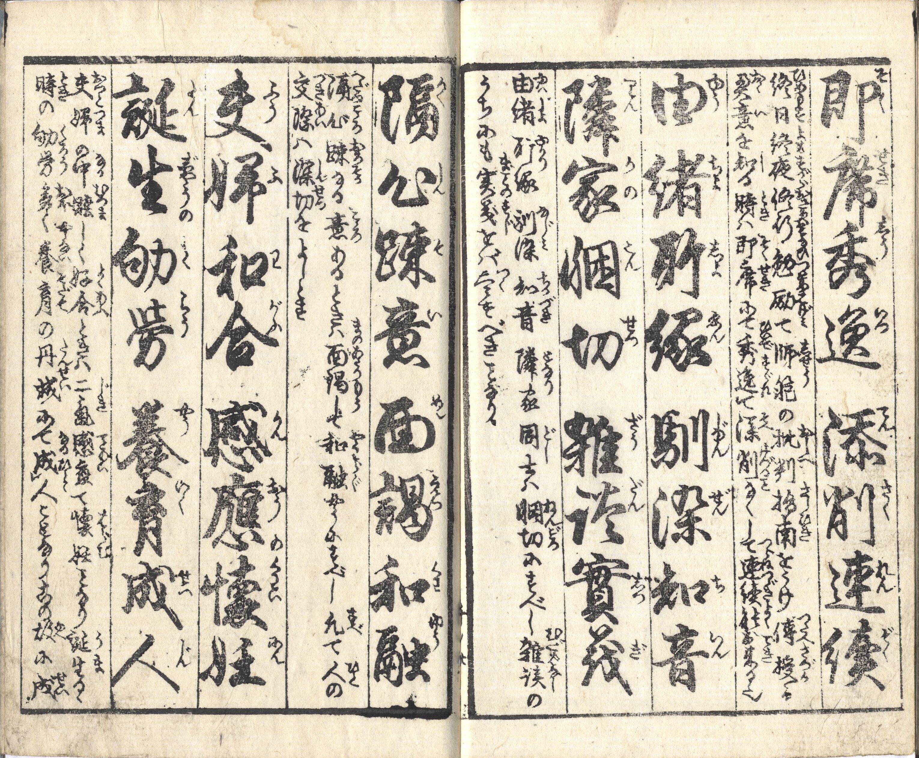 【備考】分類「往来物」。首題に「世話千字文…」とあるが、本書は天保15年刊『〈教訓画入〉幼稚千字文』の冒頭の4句(すなわち本文第1丁表)のみを享保2年刊『世話千字文』冒頭の4句にすりかえ、首題を改めたもので、他の語句・注釈・挿絵は『幼稚千字文』と全く同じ。『幼稚千字文』の類板を隠すために改竄したものであろう。