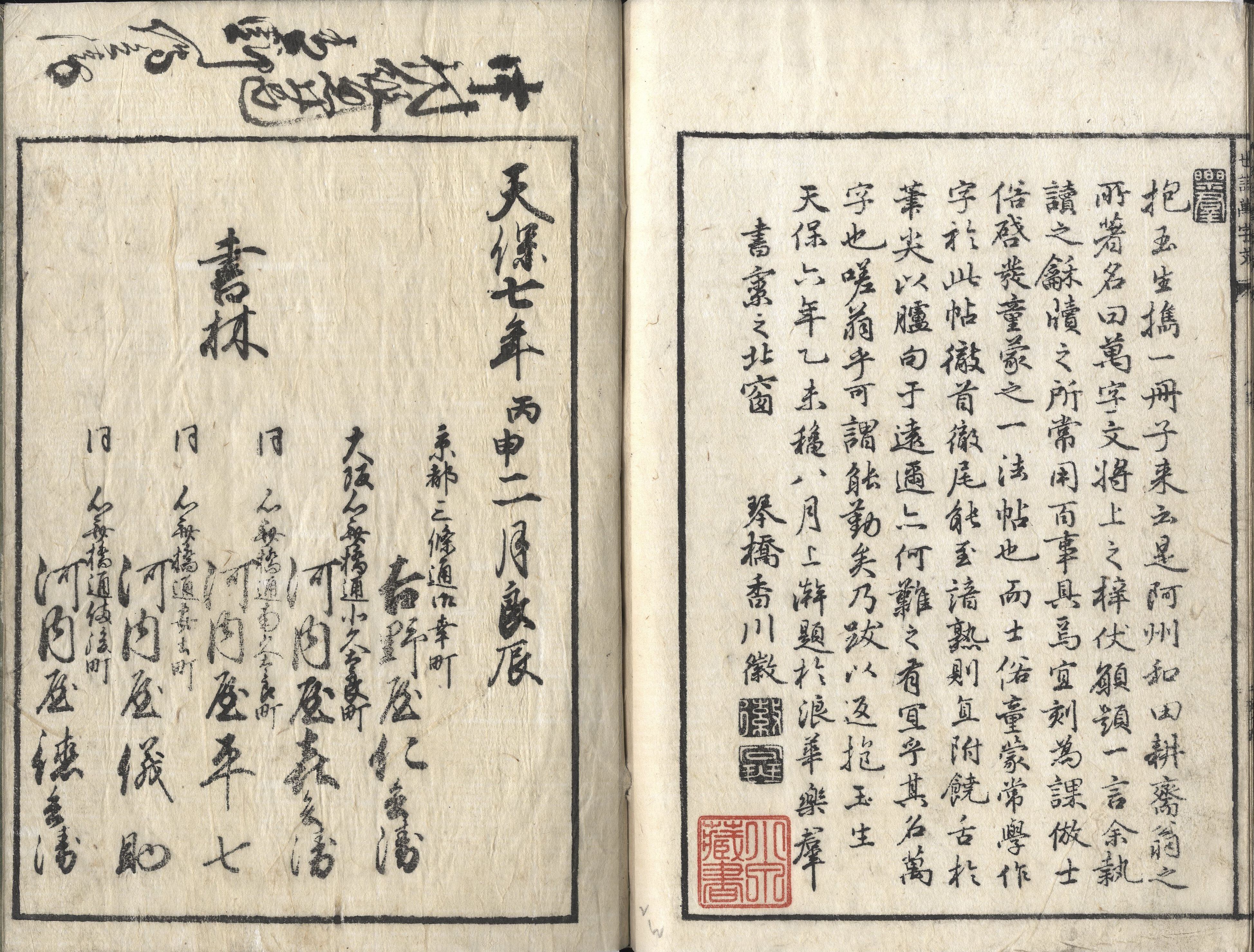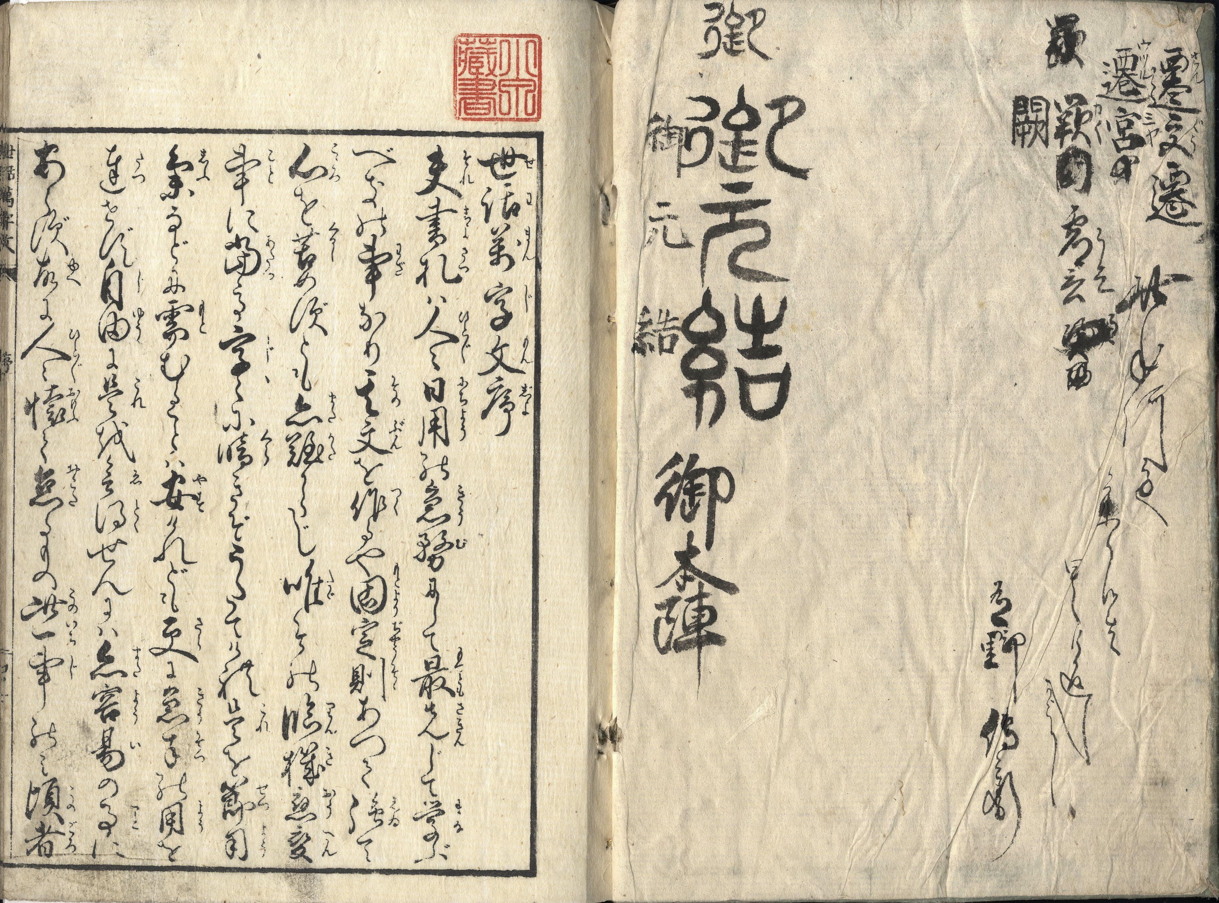 【判型】大本1冊。縦255粍。【作者】和田耕斎作。蔀関牛(藤原徳風)校・序。香川琴橋(徽)跋。【年代等】天保6年秋序。天保7年2月刊。[大阪]河内屋徳兵衛ほか板。【備考】分類「往来物」。末尾に天保板・嘉永板の別本3点を抄録した。hン書は『世話千字文』にならって日用の語彙を集めた往来物だが、『千字文』の漢字4言1句の体裁とは異なり、「夫、日用取遣消息、文躰要用之文字、熟惟(つらつらおもんみるに)、譬先(たとえばまず)、年始之書翰発端者、新春・鳳暦…」で始まる文章で、文言・乾坤・武事・武具・農事・農具・造作具・居家・諸職・縫紙・絹布・染色・薬種・酒磁・仏具・雑船・宝財・家財・衣食・菜蔬・菜肴・草木・禽鳥・魚介・獣蟲・祭祀・神事・人事の28門にわたり約1万字(9996字)の語句を収録。語彙の多くに左訓を施す。序文には、日常手紙を書く際に自分の思う言葉を手早く引けるように、「書牘・贈答」に必要な語句を始めとするあらゆる語句を集めたため『世話千字文』よりも実用的であると強調する。