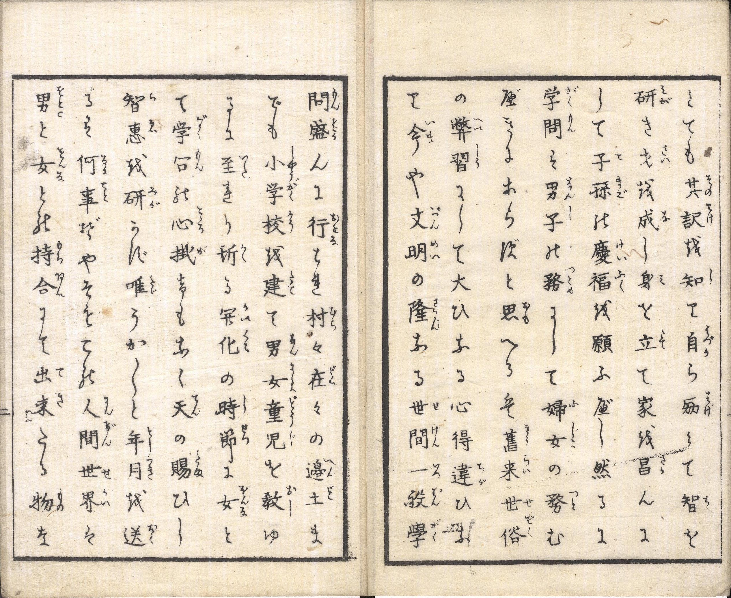 【備考】分類「往来物」。初編は、明治初年の実情を鑑み、女性に対して実学の重要性を説いた教訓書。貧富の原因を「身の才力」に求め、文明開化の時にあたって女子にも学問が必要なことを強調し、「女とても人間普通の学問を務め、夫を助けて家を富まし、子を教て後を永くし、自ら励みて人の人たる道を尽くし、天恩に報ずべき」であると諭す。2編は、学問の本義や実学の重要性などを説く。