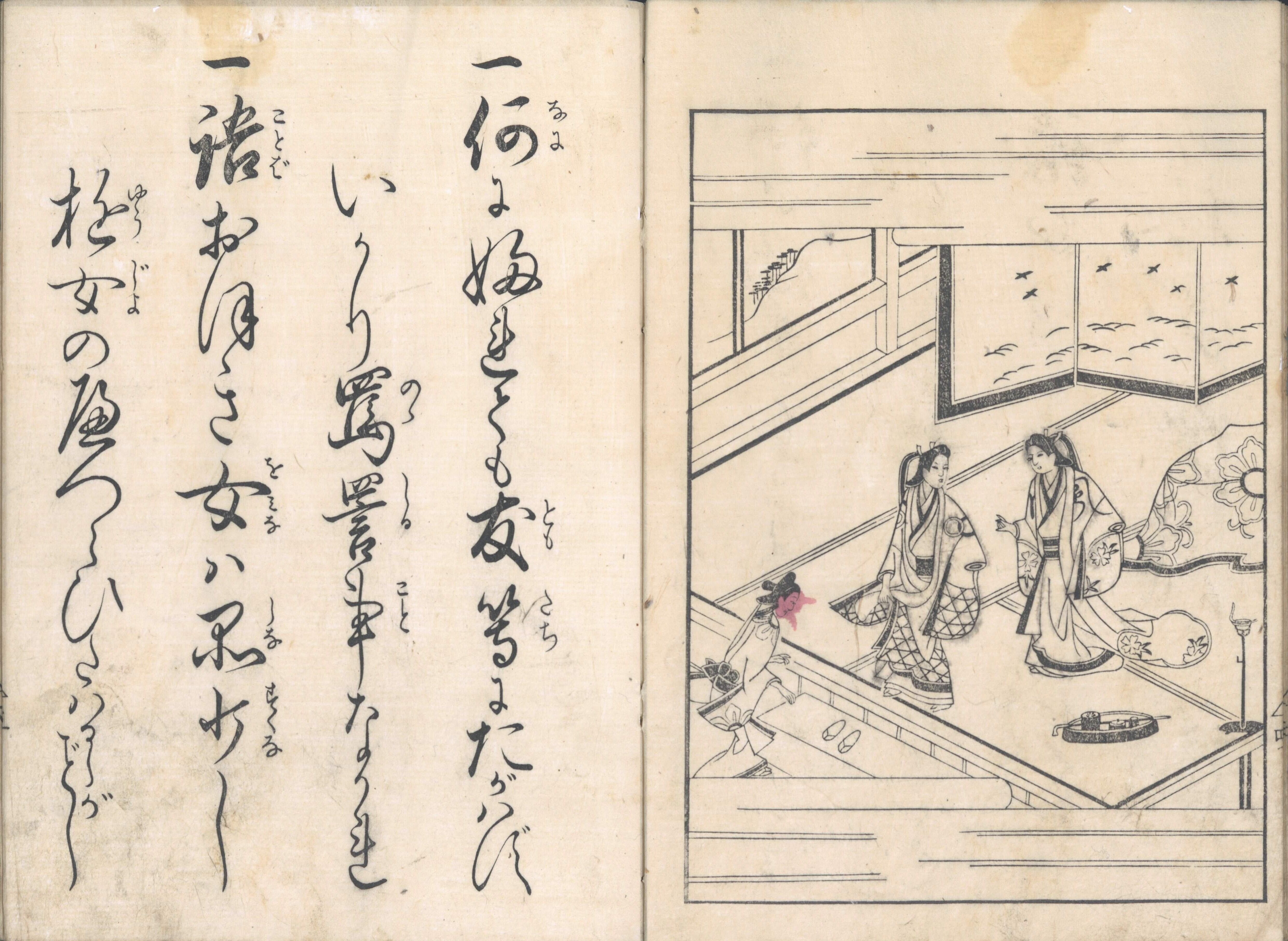 【備考】分類「往来物」。居初津奈作・書、元禄8年刊『〈女誡絵入〉女実語教・〈女誡絵入〉女童子教』を江戸後期に複刻した模刻本。本書の序文は元禄板序文のほぼ全文に1丁程増補したほか、元禄板の本文と挿絵をほぼ踏襲してあるが、本文の文言や挿絵の一部を変更したり(下巻10丁表は全く異なる挿絵に変更)、仮名遣いや振り仮名を一部改めてある。蔵板者の松崎検校(1824-71)は箏曲演奏家(盲人音楽家)で、八重崎検校の弟子。