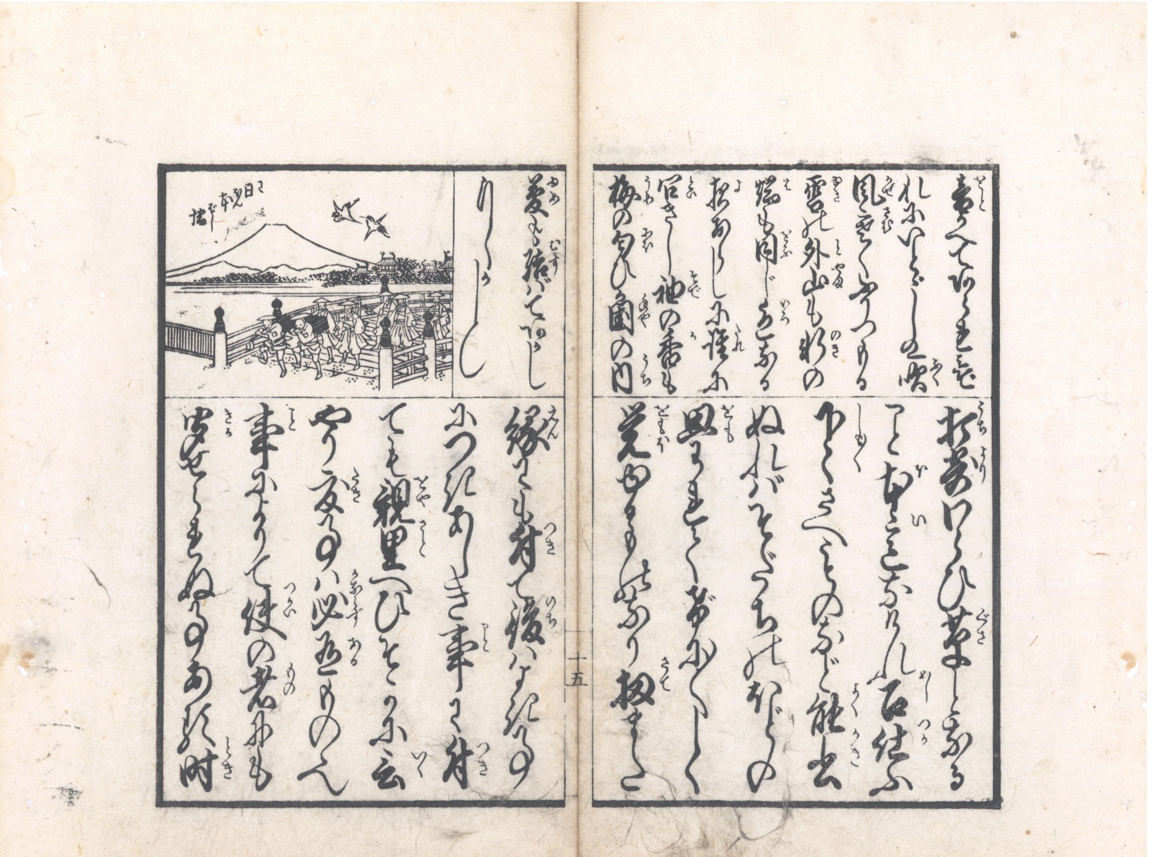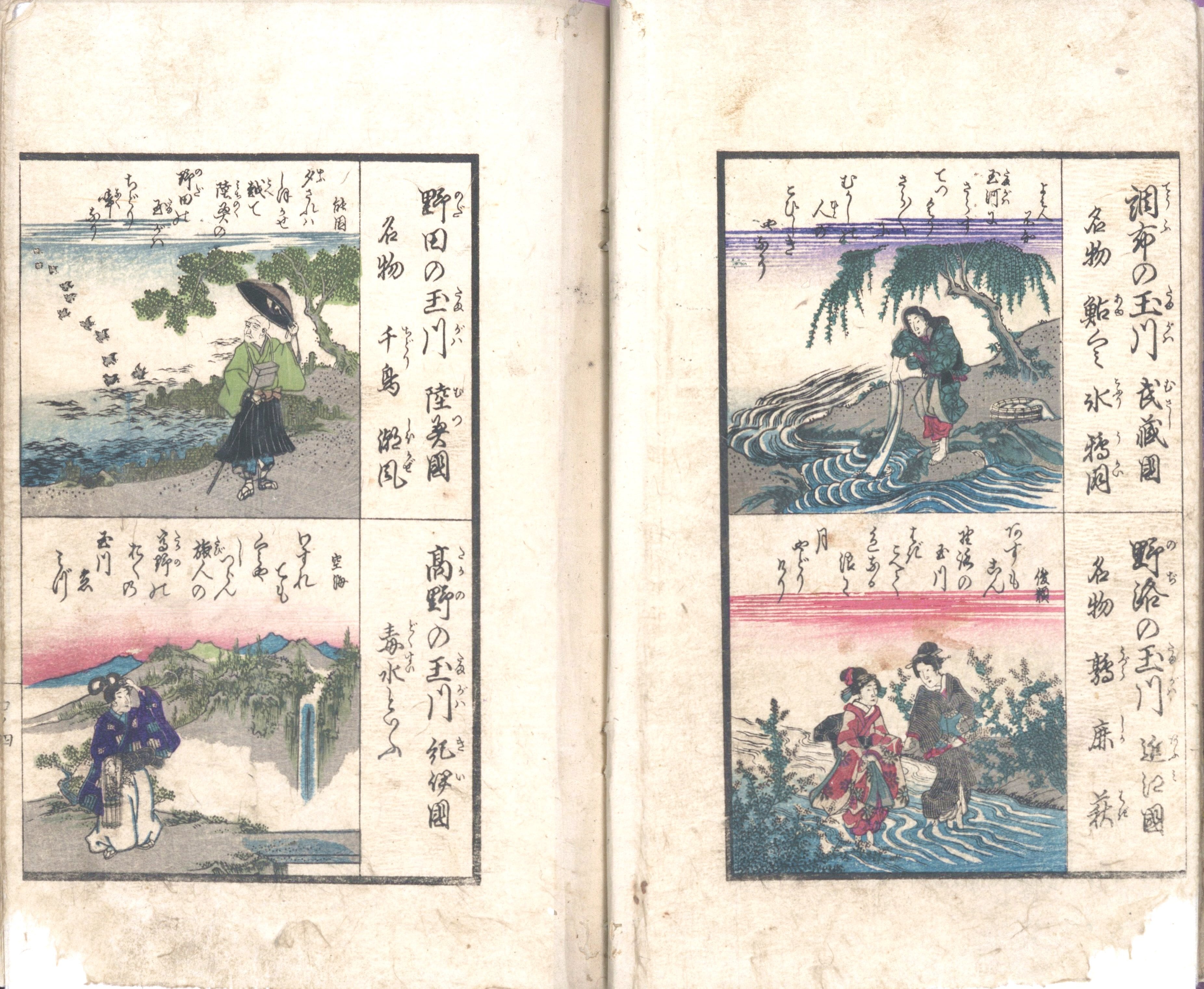 【備考】分類「往来物」。半紙本(口絵色刷り)2種を収録(全冊は書袋付き、袋綴じ展開収録、別本抄録分は通常収録)。『女訓手習かゝ美(女訓手習鏡)』は、多種多様の往来物を集めた携帯型の女子合本型往来。本文には「女今川(元禄13年板系統)」「女手習状」「女消息往来」「源氏名寄」「婚礼女国尽」「女大学」「隅田川往来」「女用文章」「女庭訓倭文庫(女庭訓往来)」を収録。付録記事は膨大で、前付に「賢女略伝」「六玉川絵抄」「七小町の伝」「名女伝」、頭書に「婦女四徳の事」「女手習文」「四季の詠」「女江戸方角」「都路往来」「洛陽往来」「婚礼の式」「仮名づかひ心得」「女専要衣服の文字」「女相性名尽し」「文封じ方の事」「小笠原流折かた」「むすびかた」「竜田詣」「十二ヶ月文の言葉」「月の異名」「名香尽文字鎖」「源氏の歌づくし」「源氏物語一部の大意」「女平生身持かゞみ」「女官名之事」「御所言葉」「四季皇帝の占」「生年守本尊の事」「生性三世相略解」、巻末に「男女相性の事」「懐胎十月の図解」「孔明六曜の善悪」等を載せる。近世後期に広く行われていた女子用往来の大半を1冊にまとめており、小型の中本としては最も大部な往来お一つである。