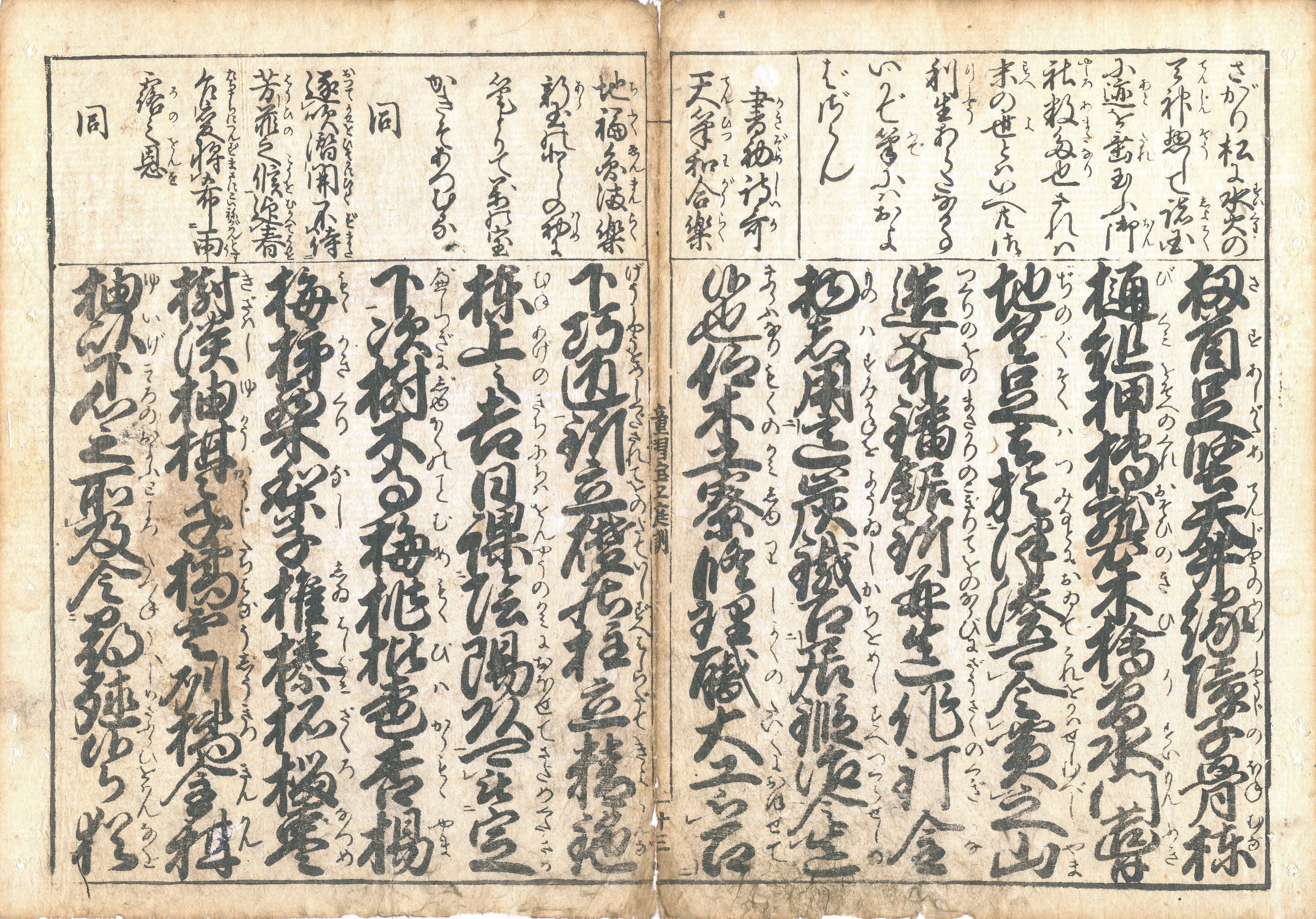 【備考】分類「往来物」。袋綴じ展開収録。後印本も抄録。元禄17年刊『古状揃絵鈔』の増補版。まず前付に「天神経」「小野篁歌字尽」「七ッいろは」等を載せ、本文に「庭訓往来」「今川状」「腰越状」「義経含状」「手習状」「熊谷状・経盛返状」「風月往来」「弁慶状」「実語教・童子教」、あるいは「庭訓往来」「大坂進状・同返状」「今川状」「腰越状」「手習状」「熊谷状・経盛返状」「義経含状」「風月往来」「実語教・童子教」を収録する(このうち「大坂進状・同返状」を欠く本もある)。本文を大字・6行(「実語教・童子教」は7行)・付訓で記す。頭書に「菅丞相伝記」「書初詩歌」「万手形案文」「商売往来」と「公家衆之次第」「百官名尽」「法躰之名」「京都町尽」「巻物絹布之字」「染物字尽」「禽獣魚蟲」「草木花菓」「十二月異名」等の語彙集と、「近江八景」「相姓名付字」、さらに本文絵抄(「今川状」~「実語教・童子教」)を掲げるほか、末尾にも「篇冠尽」「国尽并郡付」「五性合判形相性事」などを付載する。刊記に「享保十二丁未改正」と記すのは元禄板の改訂を示すものであろう。また、安永2年再板本では本文が「庭訓」「風月」「今川」「手習」「腰越」「曽我・同返」「含状」「熊谷・経盛」「弁慶」「実語・童子」の順となり、「大坂進状・同返状」に代えて「曽我状・同返状」が収録された。なお、本書には『実語教・童子教』のみの抜刷本が現存するため、他の箇所の抄録本が刊行された可能性もある。なお、本書はもともと『童習往来』の書名で刊行される予定だったが、敦賀屋九兵衛・吉文字屋市兵衛合梓の『童子往来』との類似称号の問題(差し構え)となり、外題を『万宝福寿往来』と改めた。なお、享保12年板には、本書から「大坂状」を割愛したものや、本書から「庭訓往来」を除いて外題を『万宝教訓往来』と改めたものもある。