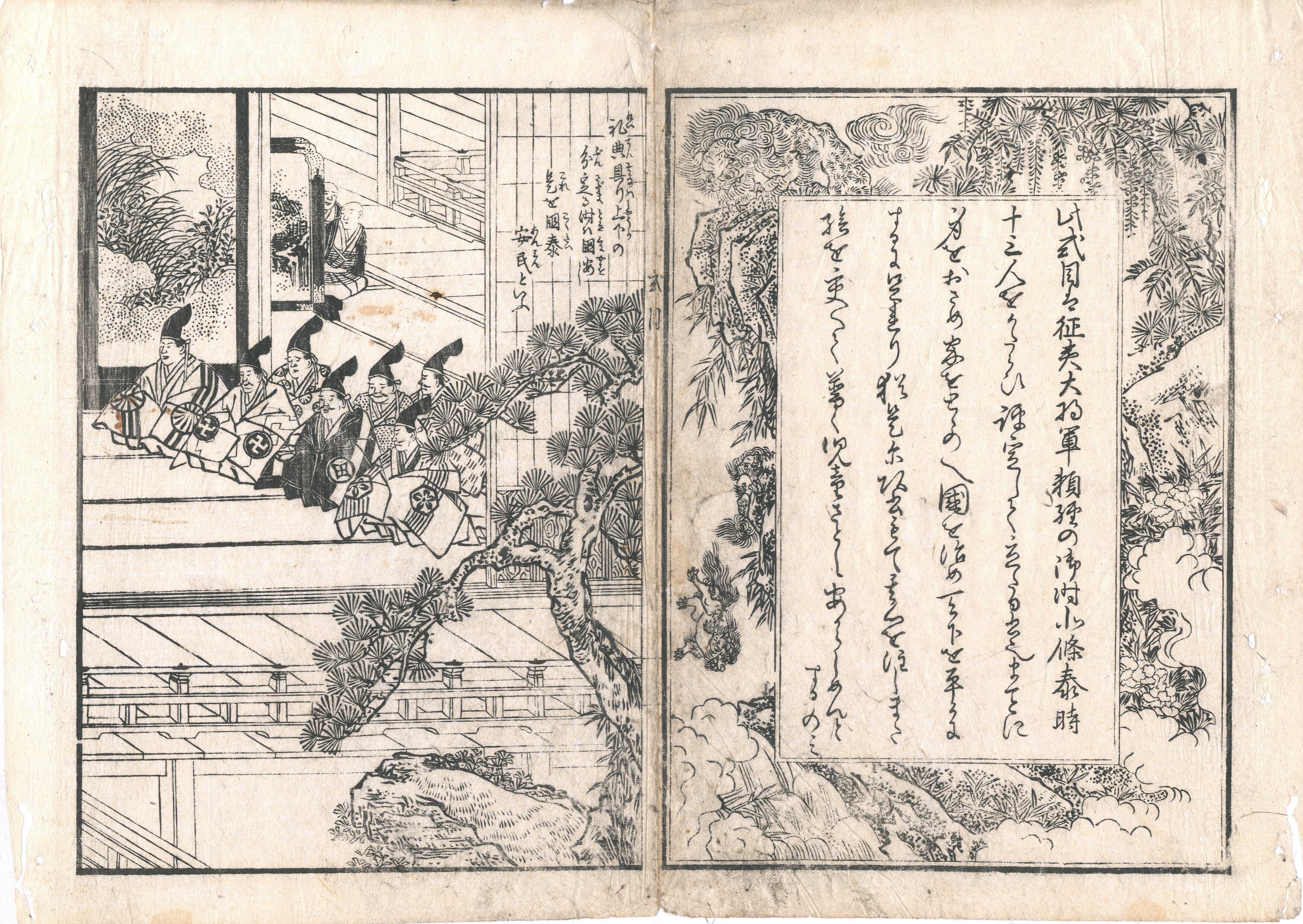 【備考】分類「往来物」。後印本など4種を収録(2冊を袋綴じ展開で全冊収録。見開き挿絵は別本にて全て収録)。『御成敗式目』の童蒙向け注釈書。『式目』本文を大字・7行・付訓で記し、頭書に平易な本文要語解を置き、さらに本文・頭書に数葉の挿絵を掲げる。巻頭に「士農工商図」「読書・手習い図」等、巻末に「九々のこゑ」を載せる。