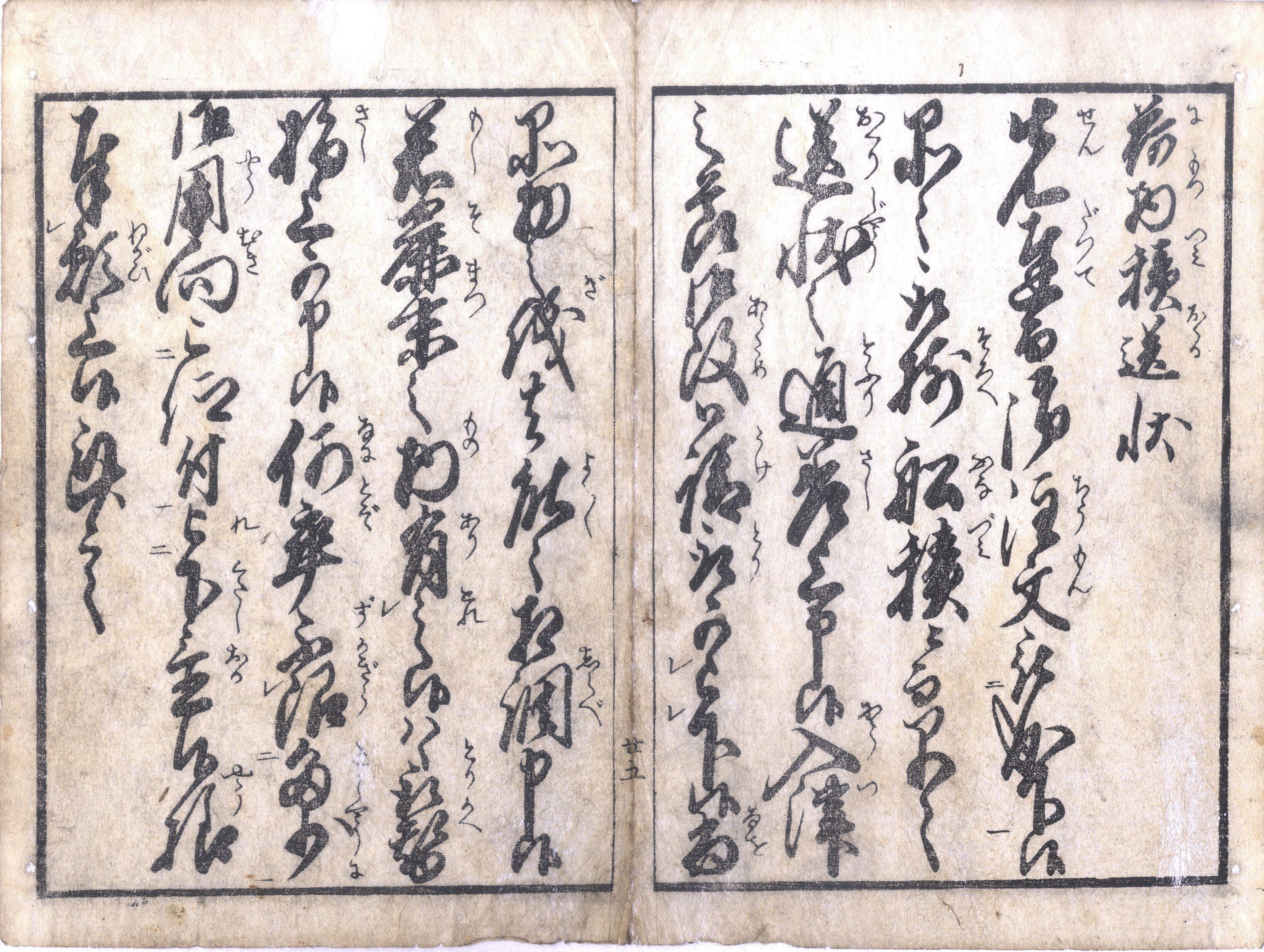 【備考】分類「往来物」。袋綴じ展開収録(見開き図は再掲)。「消息例文」「名頭字づくし」「大日本国尽」から成る用文章。「消息例文」は、「年始之状」~「婚姻怡之礼状」の18通を収録。四季・五節句祝儀状や諸用件の書状が中心である。本文を大字・5~6行・付訓で記す。巻頭に「士農工商図」「書札上書認様上下の事」「絵馬之書様」、巻末に「十幹十二支」「十二月異名」を掲げる。