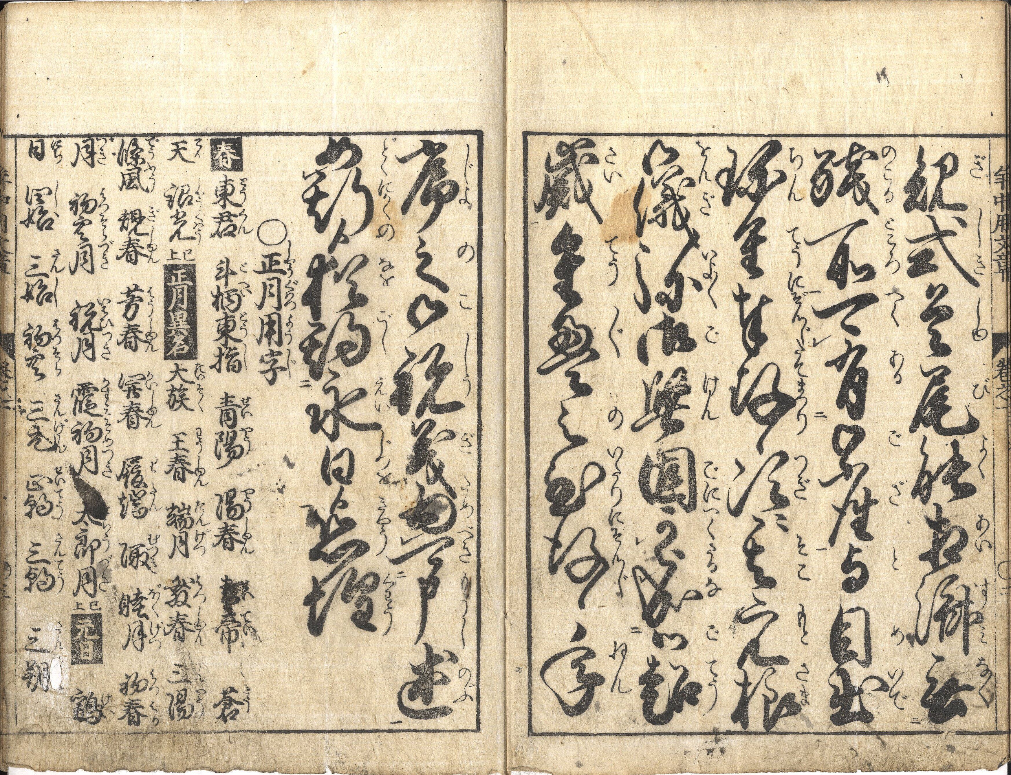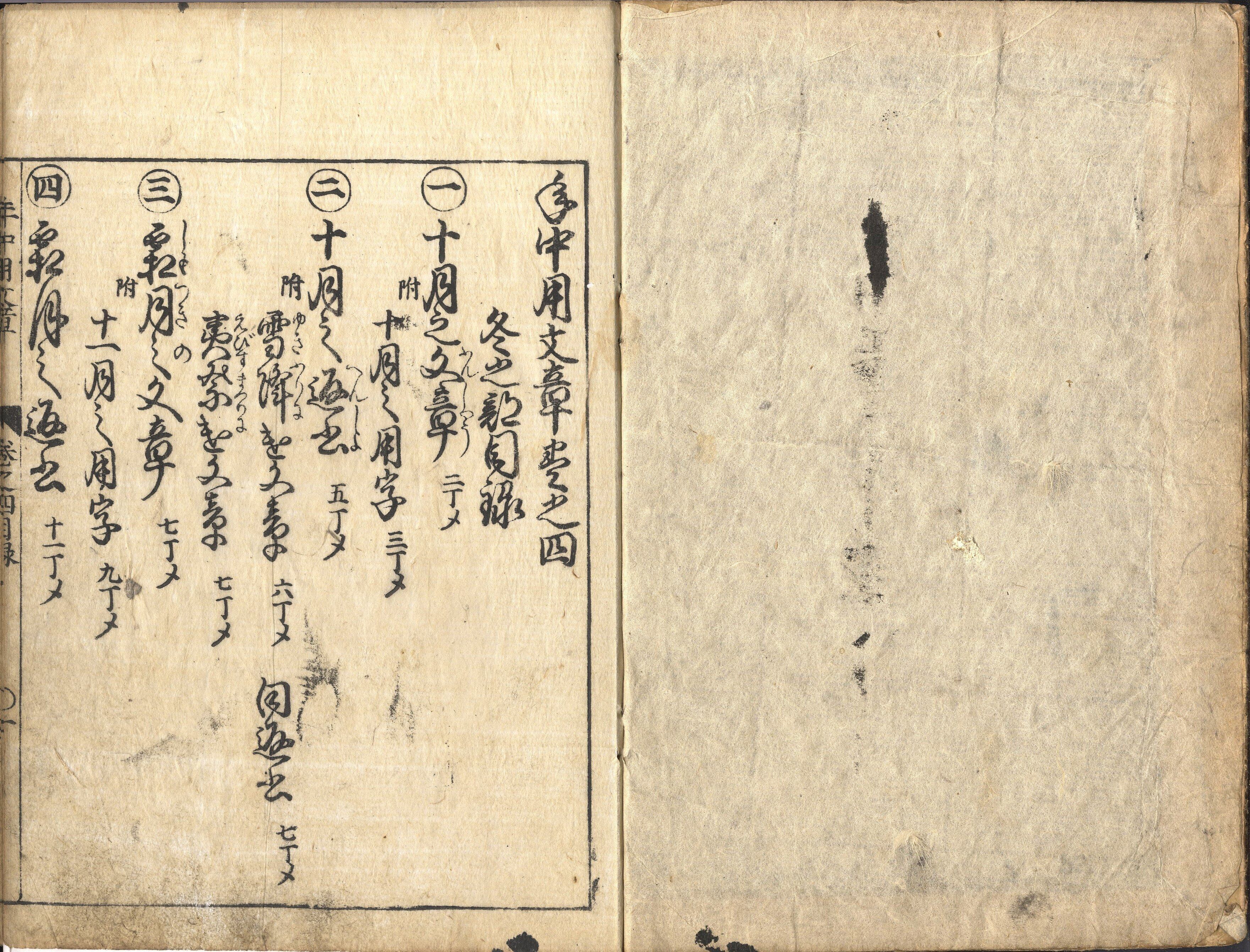 【備考】分類「往来物」。末尾に、別本を抄録した。巻之一「春之部」(「年始に遣す文章」~「花見誘引書状・同返書」までの19通、および1-3月の用字)、巻之二「夏之部」(「四月の文章」~「納涼促状」の17通、および4-6月の用字)、巻之三「秋之部」(「盆之文章」~「送菊花書状・同返書」の12通、および七月~九月の用字)、巻之四「冬之部」(「十月之文章」~「年忘人呼書状・同返書」の14通、および10-12月の用字)、巻之五「雑之部」(「打絶人へ遣す状」~「求師状・同返書」の26通、および「披露状之図式」以下6例の書式・書札礼、さらに「手形文言」と題して「金銀預手形」「売上手形」「請取手形」の三通を収録する)にわけて、合計八八通の消息文例と3通の証文類文例等を収録した大部な用文章。各巻とも、基本になる例文を大字・5行・付訓で、付録の例文と各月の用字をやや小字・10行・付訓で認め、用字の所々の語彙に割注を施す。
