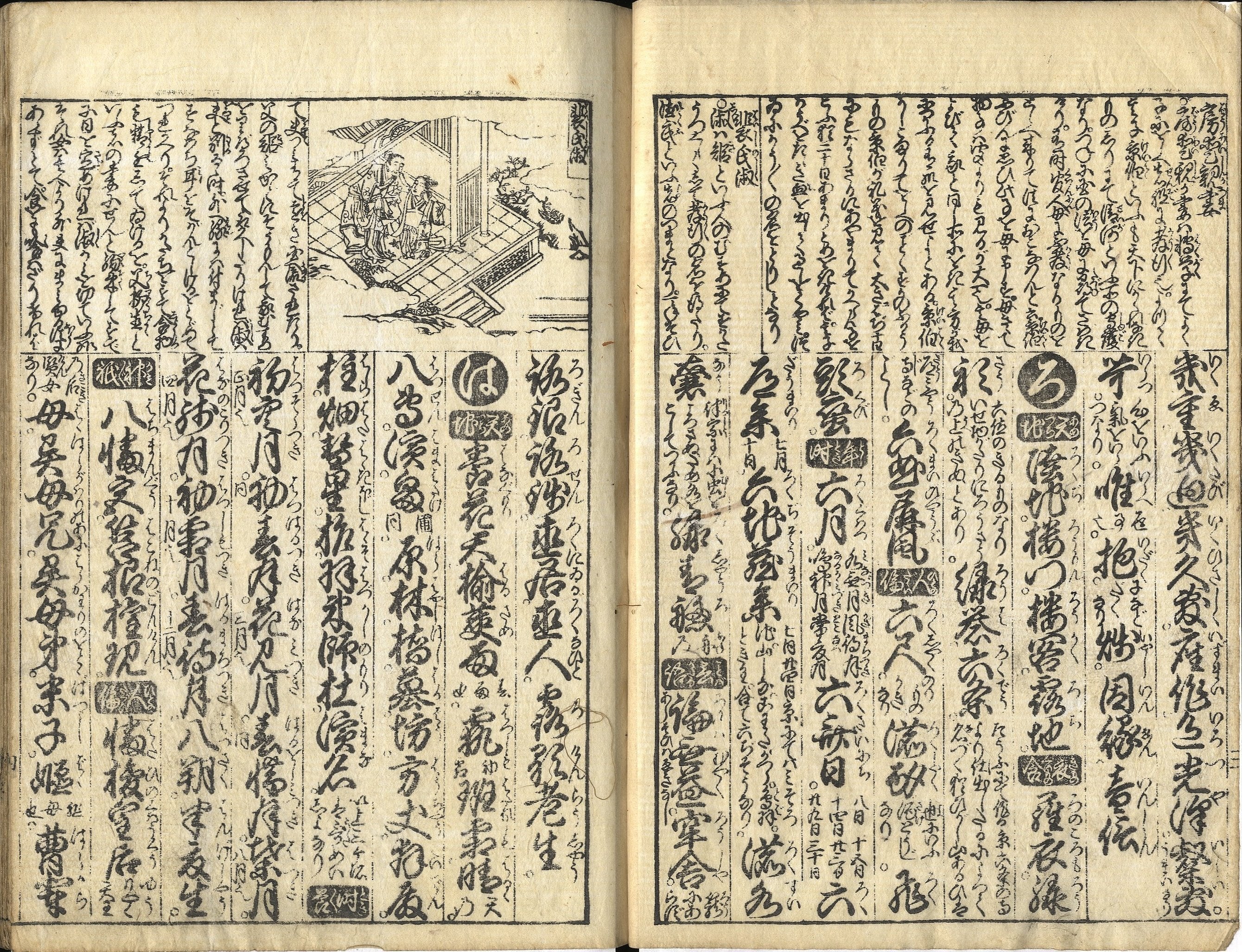 【備考】分類「往来物・辞書」。天地・神祗・人倫・年月・衣食・草木・生類・器財・言語の9部門(「十門部分」最後の「正誤」は事実上の部門ではない)で、御所言葉などの女性語を集めた節用集。享保元年刊『男節用集如意宝珠大成』と対をなし、同じく山本序周編、享保2年刊『文林節用筆海往来』頭書「節用字づくし」とも密接な関連があるが、「女節用集」では人物の注記が長文な点が目立つ。語彙をやや小字・8行・付訓で記し、所々に割注を施す。「女節用集」には諸本があり付録記事などもやや異なるが、底本では前付に「粟嶋之図」「洛陽東山之図」「女中一生諸礼」「〈当世風流〉紋所」「百人一首絵鈔」「万年暦大ざつしよ相生之事」「女ふみこと葉」「男の名づくし」「女中名づくし」等、頭書に「女二十四孝絵抄」「女武者物語絵抄」「茶湯立様・喫様之事」「諸人片言なをし」「産前・産後養生之事」「合食どくけし」「銭売買相場附」「男女かたぎ枕」「女みだれ髪」「妙薬秘方」「五十人一首狂歌尽」「生下未分之語」「京都名物」「〈京都・南都〉大仏殿之伝記」「夢うらなひの事」等を他の女子用往来と共通する付録記事を多数収録する。頭書に「元禄二年まで○○年」の表記が散見されるため、この頃の成立であろう。