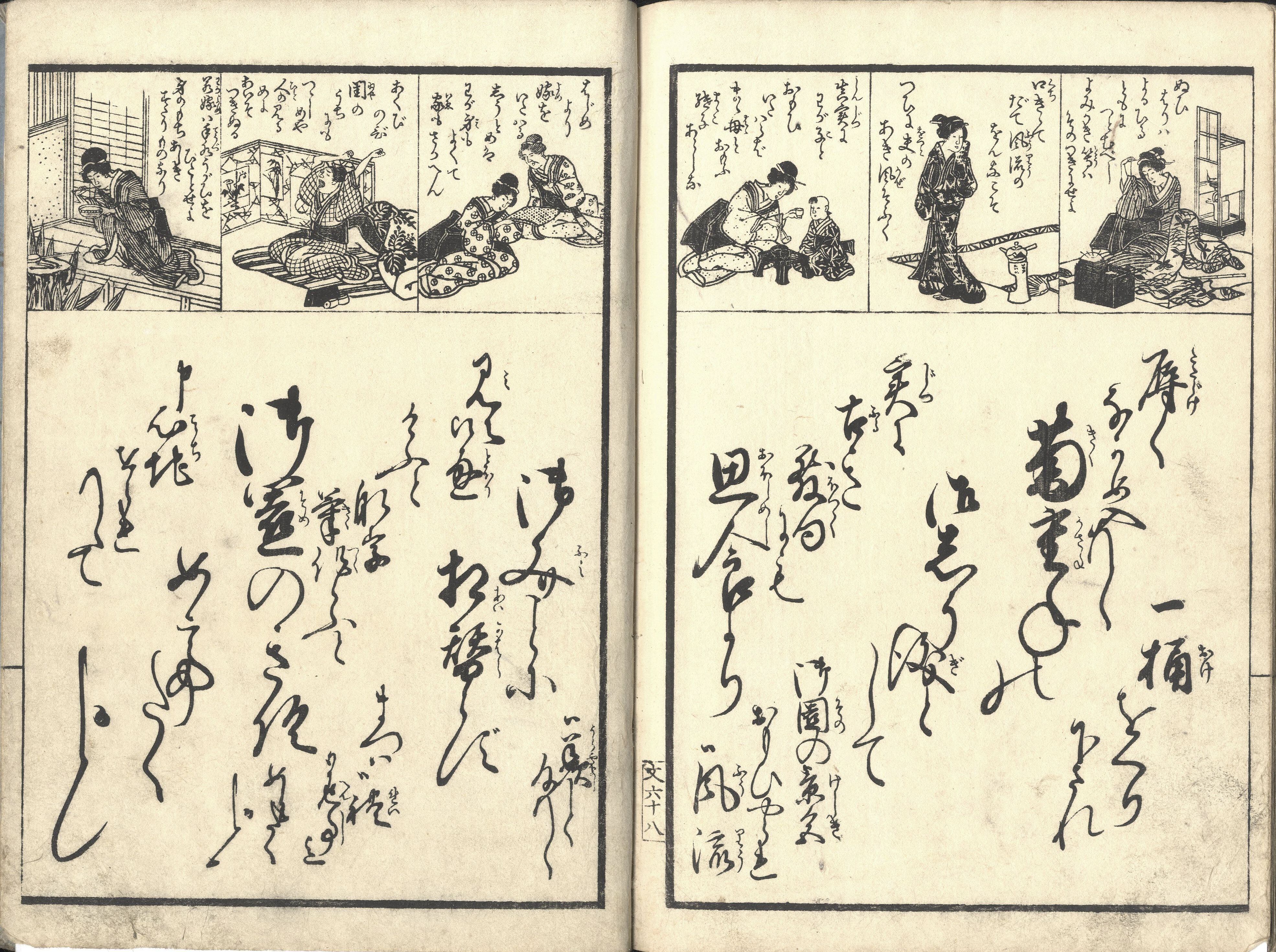 【備考】分類「往来物」。「年始の文」から「奉文(二通)」までの38通を収録した女用文章。各例文を大字・5行・付訓の並べ書きで記す。五節句・四季に関する例文が大半で、「湯治見廻のふみ」「結入祝儀のふみ」「婚礼しう儀の文」「出産祝儀の文」「奉公に出たる方へ遣はすふみ」なども含む。このほか巻末に、散らし書きの五節句祝儀状(5通)を付す。巻頭に「六歌仙和歌(色刷り口絵)」を始め、豊富な挿絵とともに「和歌」「色紙短冊歌書やうの事」「手習」「五行相生相剋并男女相性」「歌貝」「貝合」「香道濫觴」「活花」「茶湯」「双陸」「花結」「機織」「縫針」「衣服を裁ときの心得」「何某大納言殿より御息女へ送給ふ御消息」「四厄十惑の事」「結燈台の事」「婦人の事并胎教」「婚礼式法」「子を教ゆるのくさぐさ」「衣桁飾様の事」「歯黒の事」「女の眉とる事」「嶋台の事」等を載せるほか、頭書にも「諸礼躾がた」「香道たしなみの事」「名香六十一種名寄文章」「女中詞づかひ」「大和ことば」「万染いろの名」「畳紙折形の図」「進物目録書様」「婦女をしえ艸」「食事しつけがた」「給仕の次第」「婦人平生心得草」「一代灸忌日の事」「産の前後食物并薬法」「婦人日用字づくし」「琴・三味線のこと」「四季の曲并序」「年中消息詞」「文認るこゝろ得」「一生涯の祝事」「女中嗜みの道歌」など特色ある記事を数多く掲載する。例文の豊富さもさることながら、付録記事の多彩さが本書の特色である。