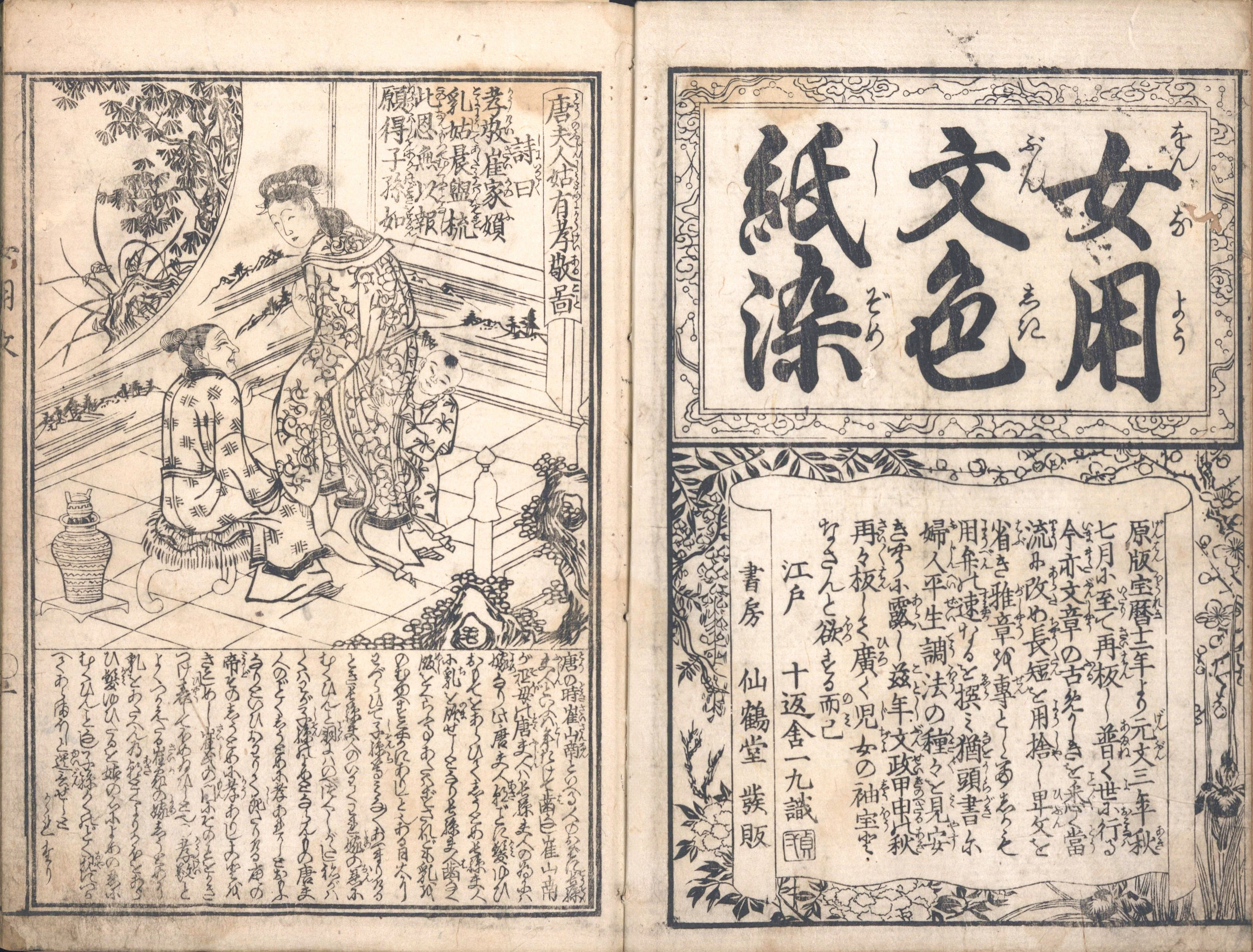 【備考】分類「往来物」。『女用文章色紙染』は、序文によれば、元文3年初刊『〈新板女筆〉女用文色紙染』を、十返舎一九が「文章の古めかしきを悉く当流に改め、長短を用捨し、卑文を省き、雅章を専として、しかも用弁の速なるを撰」んだものという。しかし、全20通の文面は元文3年板とは全く異なるもので、各状の主題などが踏襲されているにすぎない。本文を概ね大字・4行・付訓で記す。元文3年板に比較して文章がやや長く、文言中に人名・地名などの固有名詞を含む点に特色がある。付録記事も元文3年板とは全くの別内容で、前付に「衣服調法秘伝抄」「十二月之異名」等、頭書に「文の書様心得の事」「年中故実・五節句ゆらゐ」「源氏物がたり目録」「婦人たしなみ草」「女中詞づかひの事」「薫ものの銘づくし」「万染ものの類仕やう」等を掲げる。