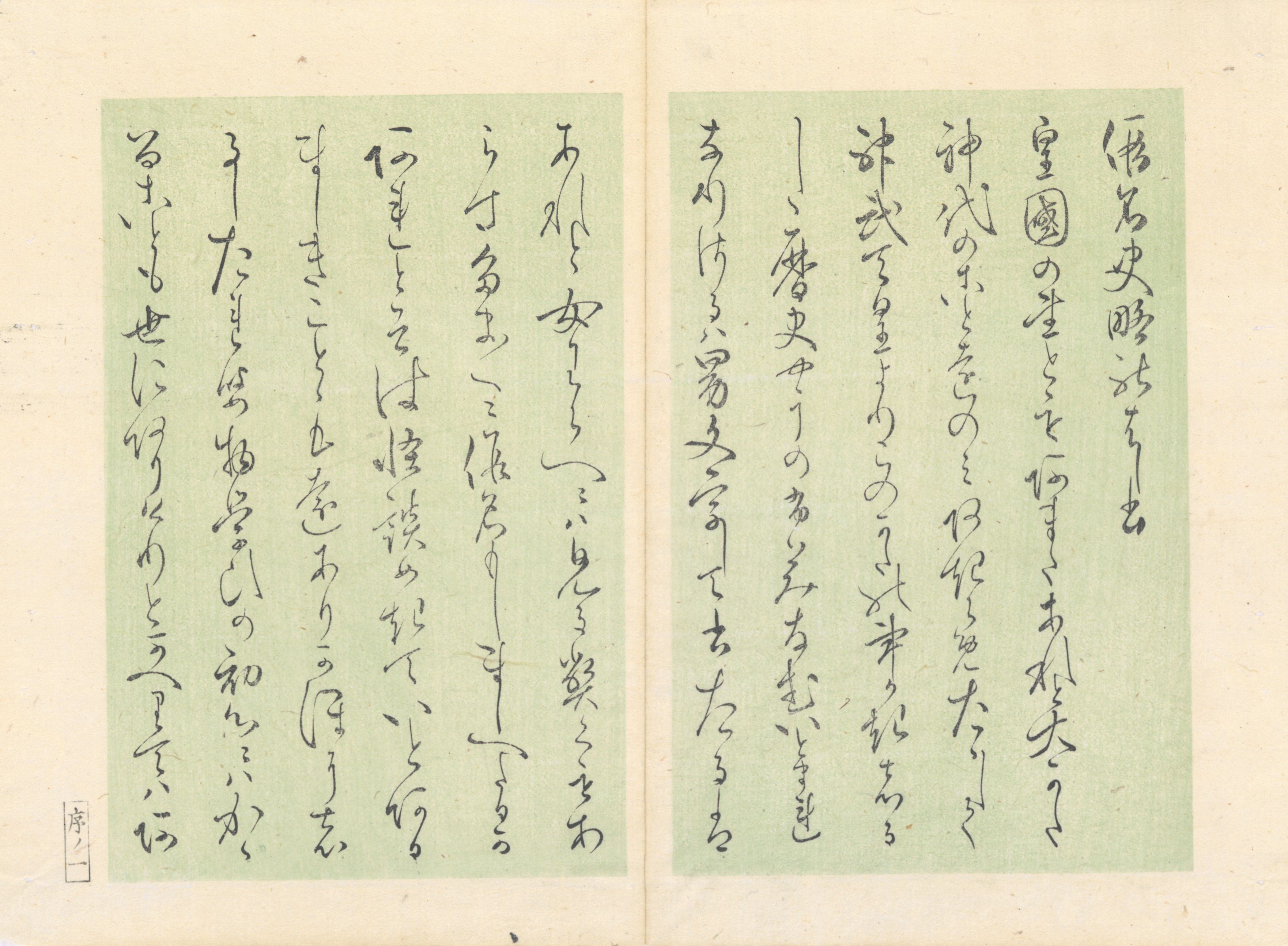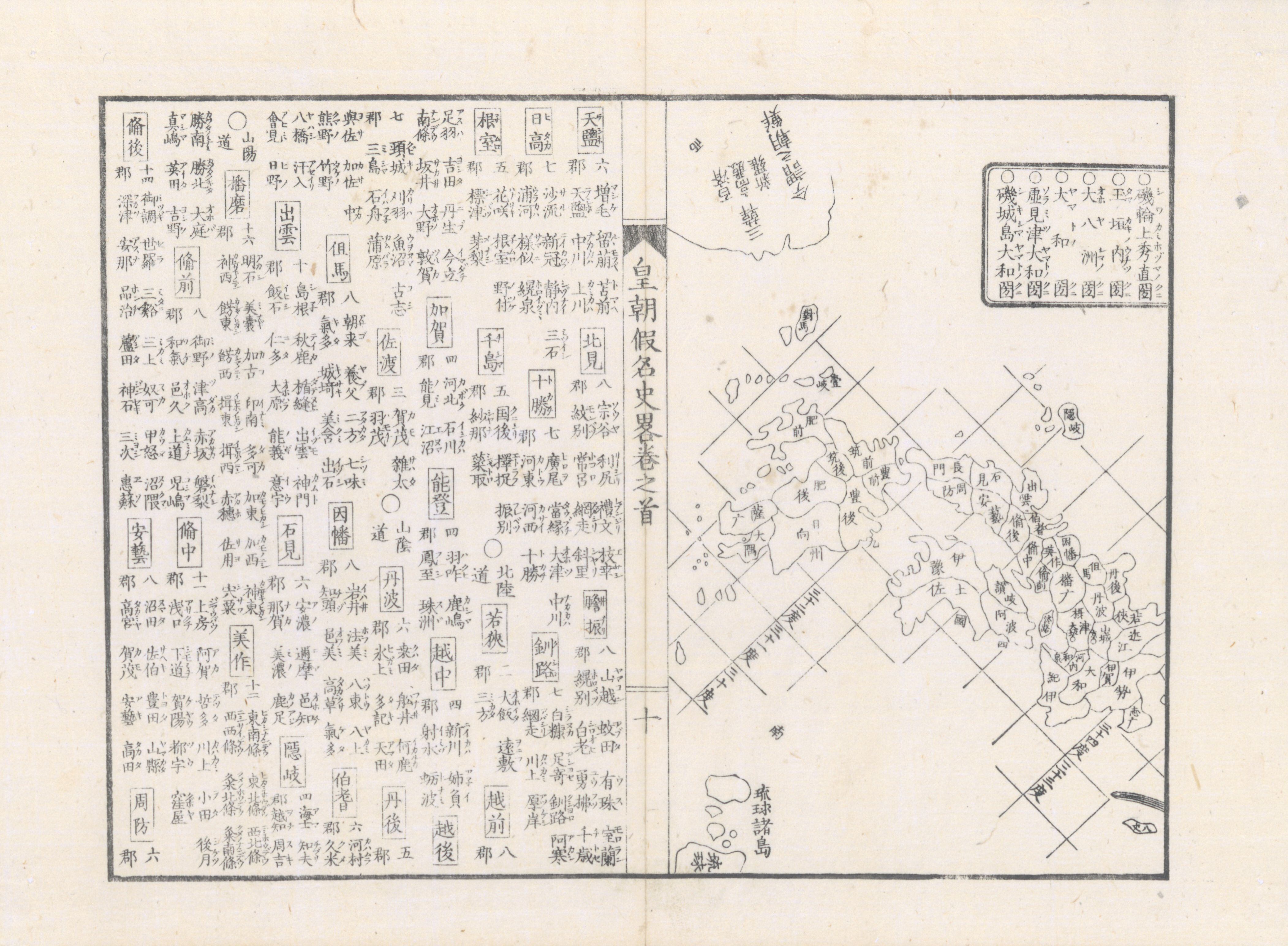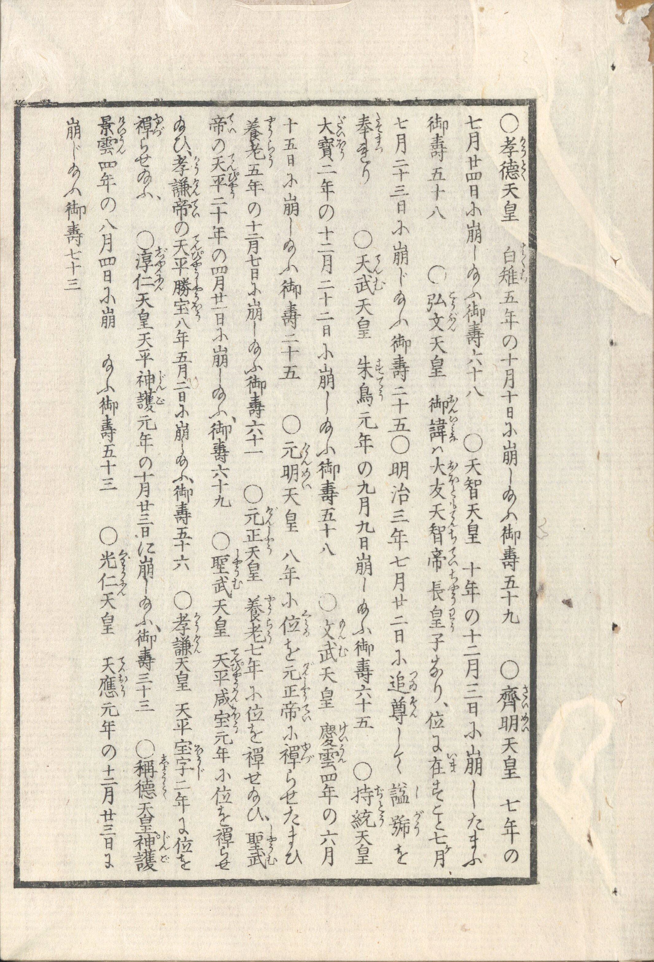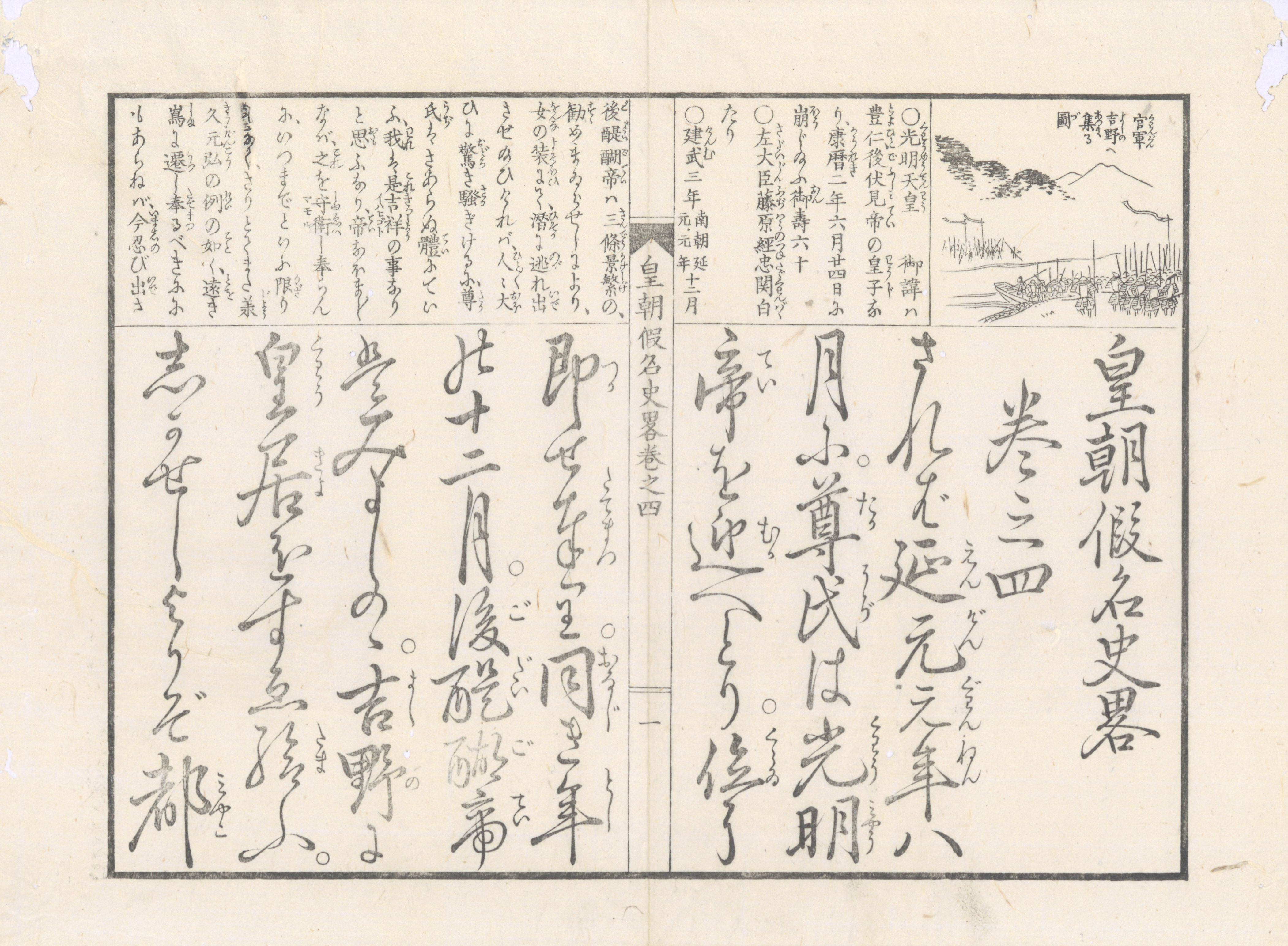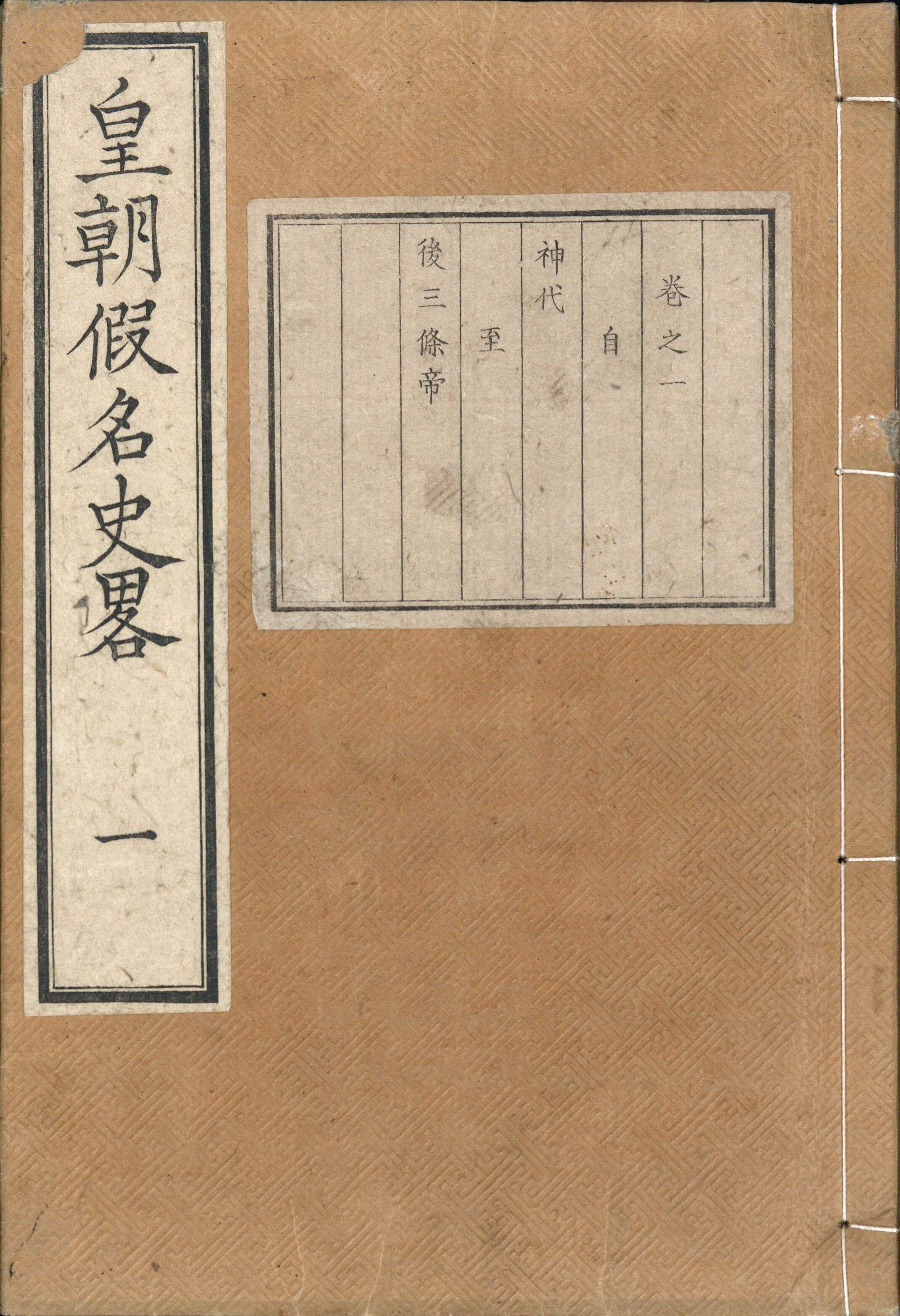 【備考】分類「往来物」。同板別本も抄録。また、4巻51丁は落丁につき別本により補充(見開き画像に加工)。『皇朝仮名史略』は、広告によれば半紙本五巻六冊(巻之三以降は未刊か)。巻之三以降は未見だが、目録によれば、巻之一は神代から後三条帝まで、巻之二は白河帝から後鳥羽帝まで、巻之三は土御門帝から後醍醐帝まで、巻之四は光明帝から御柏原帝まで、巻之五ノ上は御奈良帝から後陽成帝まで、巻之五ノ下は後陽成帝から今上帝(明治天皇)までの皇統の歴史を綴る。「天地(あめつち)の、開闢(ひらけ)しはじめなりいづる、国常立(くにとこたち)の尊(みこと)より、いや継々(つぎつぎ)に天神(あまつかみ)、七代(ななよ)とかぞへ地神(くにつかみ)…」で始まる七五調の文章を大字・五行・付訓で記す。頭書に、歴代天皇の諱や当代の主要事件や関連の挿絵を掲げる。また、巻之一巻頭に色刷り口絵「日本武尊之像」「藤原鎌足公之像」、また「歴代天皇尊系図」「歴代遷都地名」「歴代年号改元索引」「五畿八道(郡名)」「皇国称号(日本地図)」「開闢略記」を載せる。