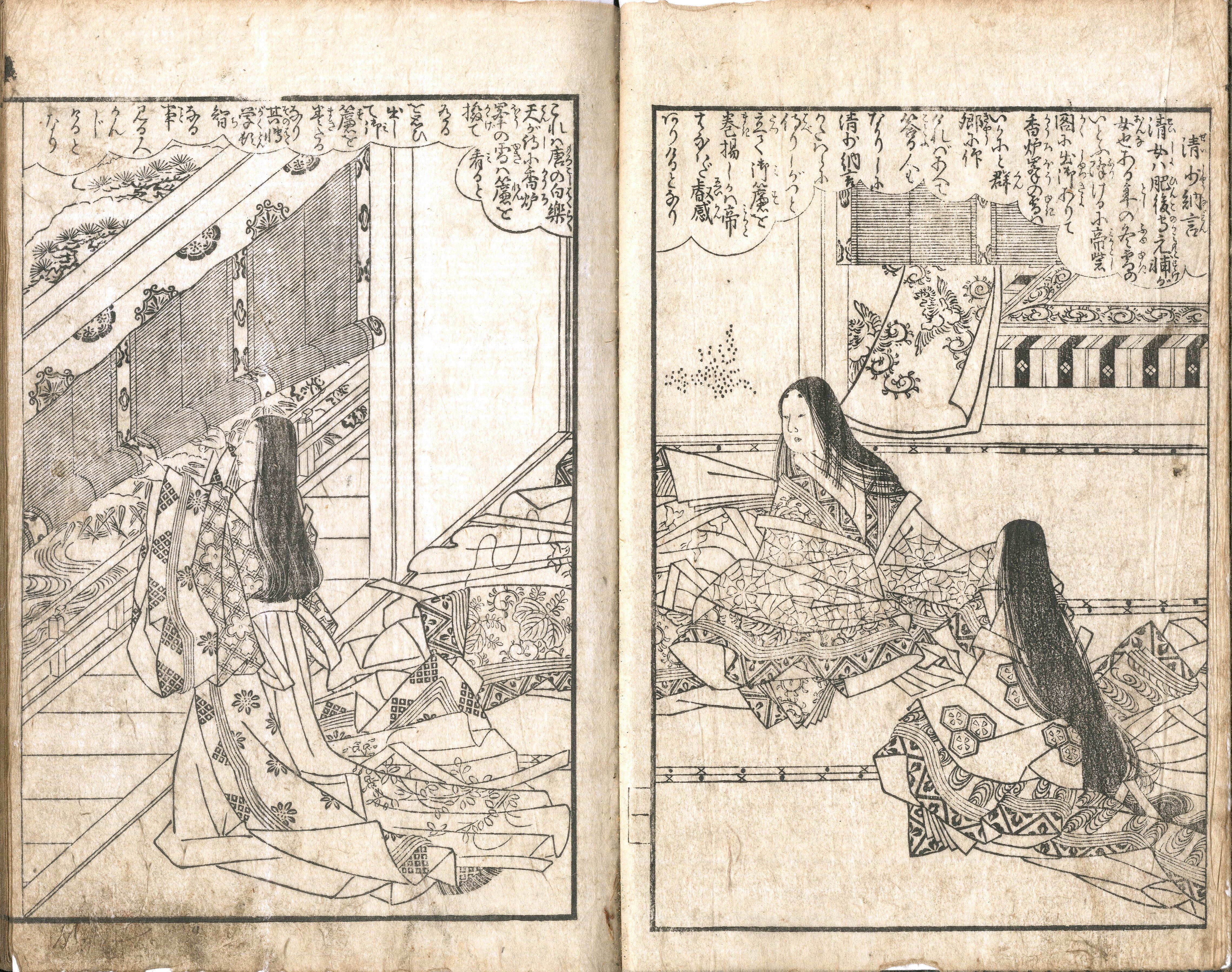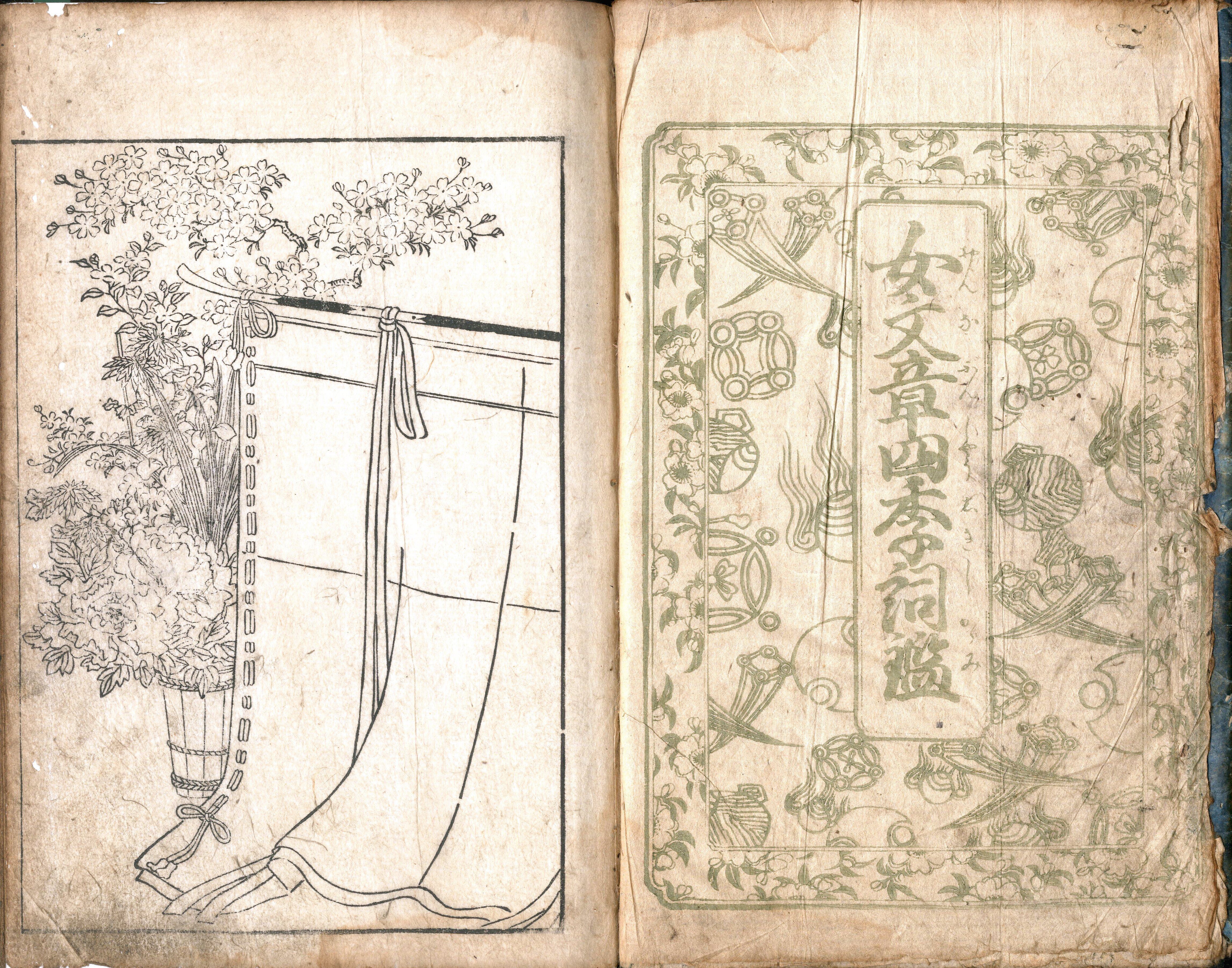 【備考】分類「往来物」。早印本・後印本など3種を収録。『女文章四季詞鑑』は、「初春祝義之文」から「歳暮寿之返事」までの二九通を収録した女用文章。例文は書名の通り、ほとんどが四季の挨拶・風物・行事にまつわるもので、「雷見舞之章」「祭礼見物之文」「年わすれ催之文」なども含まれる。年始・年末等の例文に散らし書きを採用するが、多くは大字・五行・無訓の並べ書きである。また、例文毎に目次と共通した印(花や草木の図柄)を付けるのも特徴。付録記事にも独自の内容が少なくなく、前付・頭書等に「和歌の事」「女風俗躾時」「里海士人麿像」「男女相性」「賢女四季之和歌」「女中名五姓により善悪の事」「婚礼之図式」「香道たしなみの事」「松之目出度謂」「娘を五文字云説」「教訓手ならひ短歌」「躾方教短歌」「我儘育教短歌」「国尽を習べき事」「大日本国尽」「苗字の文字を習給ふべき事」「苗氏文字尽」「花咲草木の字を嗜おぼへ給ふべき事」「四季花の名づくし」「十二月之異名并引うた」「松之異名和歌之詞」等を掲げる。なお、早印本には流布本と一部異なる前付を収録し、奥付に「画工、北尾政美」ではなく、「画工、北尾重政」と記載したものがある。