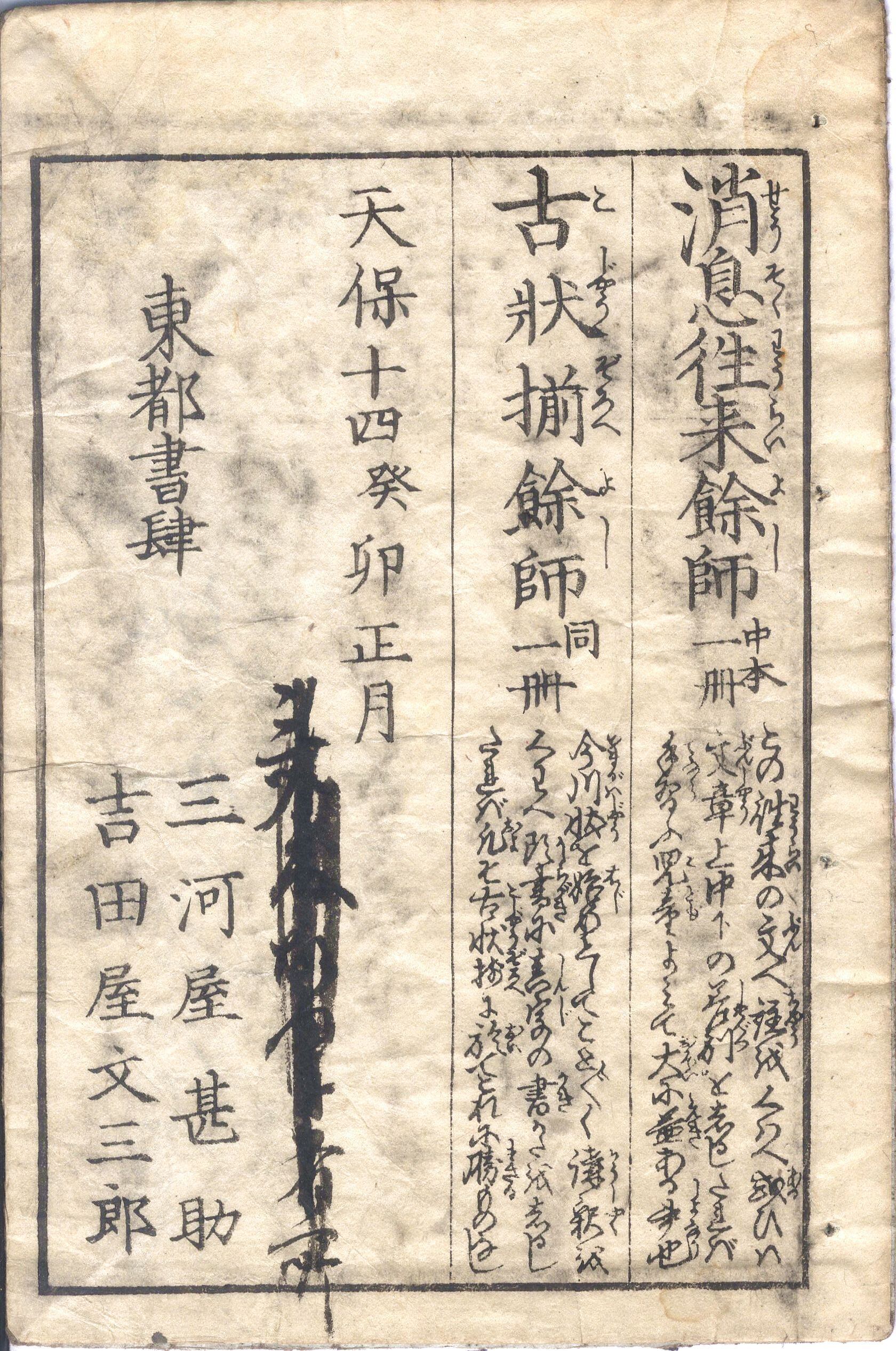 【年代等】女年中文案詞:天保頃刊。[江戸]和泉屋市兵衛板。女用文宝蔵:。天保14年刊。[江戸]吉田屋文三郎板。