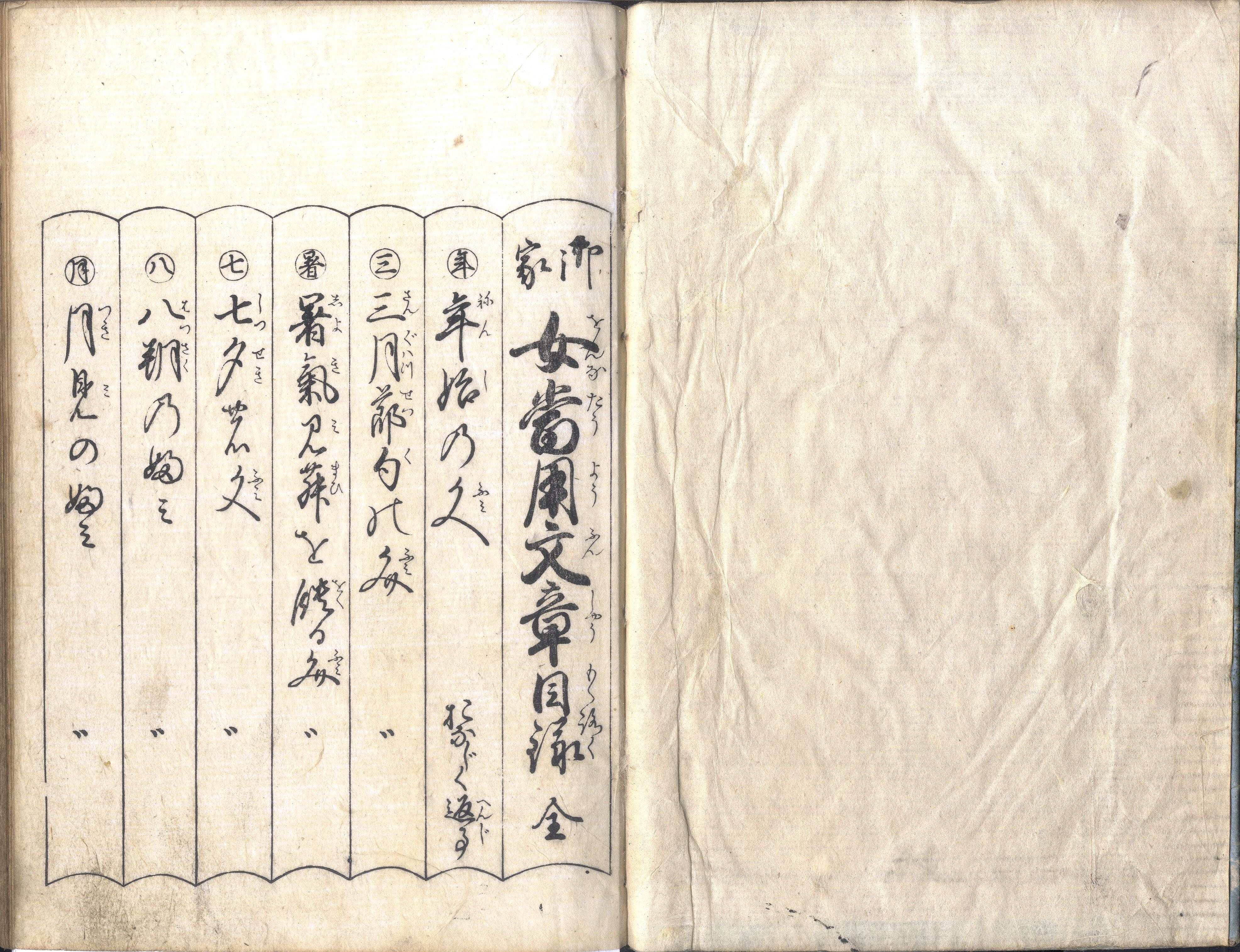 【備考】分類「往来物」。同板別本も抄録した。本書は女用文章では比較的少ない頭注付きの手本兼女用文章。「年始の文」から「歳暮の祝儀仰書の文」までの往復文51通(26題の往復文。弔状のみ返状なし)を収録し、四季折々や佳節に伴う祝儀状・誘引状、諸事に関する依頼状や礼状、病気・寒気見舞状など一通りの例文を載せる。頭書に語注や書簡作法・年中行事等に関する注記を多く掲げるのが特徴。また、追伸文を伴う例文も多く、書籍広告ともとれる『難波往来』『都名所図会』等の書名を文章中に盛り込み、巻末には脇付の上下を示す。なお、本書の小口方向に検索用の丸付き漢字(例文見出しの頭字)を配置して読者の便を図るのも一工夫であろう。
