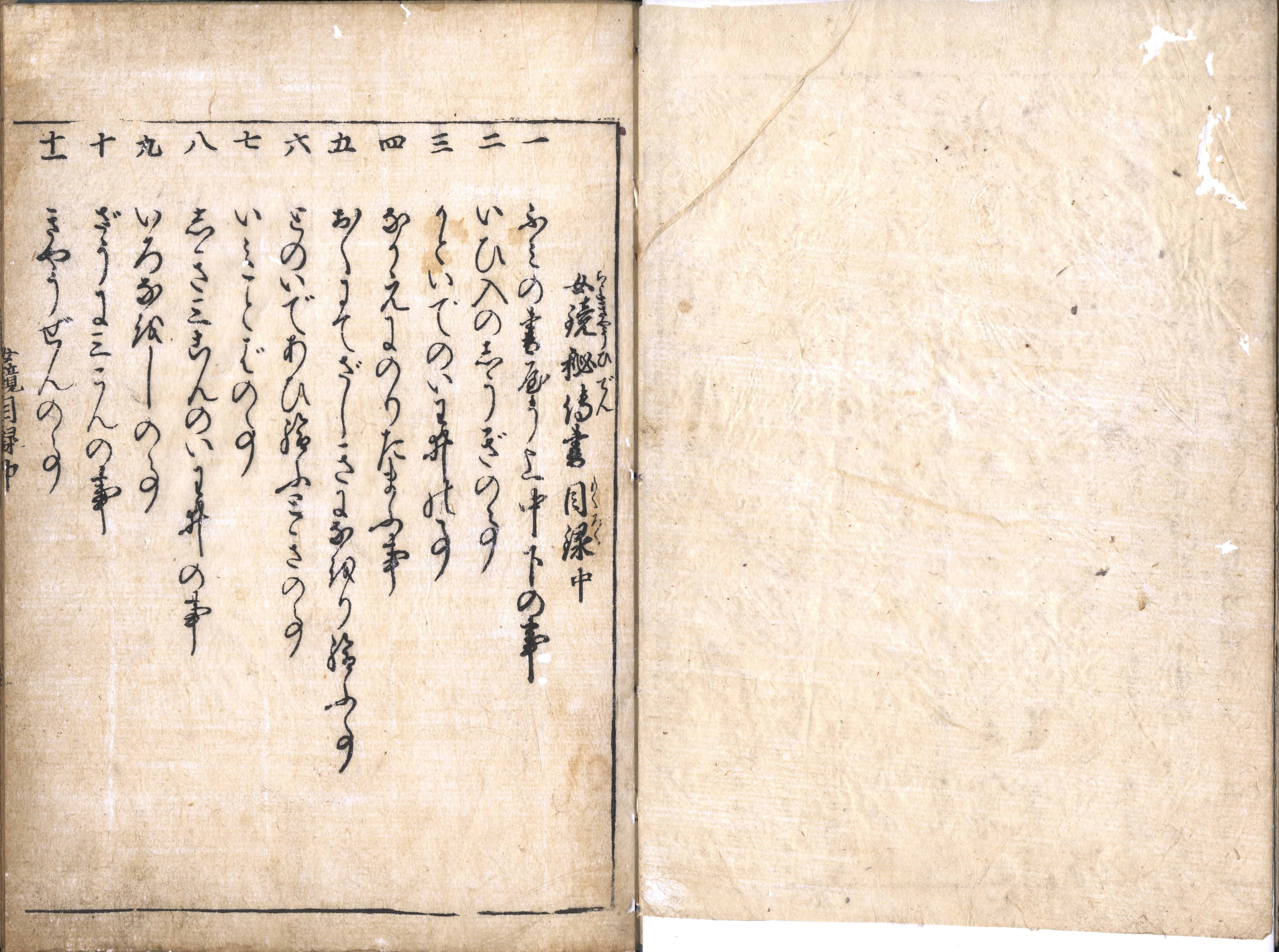 【備考】分類「往来物・仮名草子」。『女かゞみ[女鏡秘伝書]』は、江戸前期の代表的な女訓書で、慶安3年板を始祖として江戸中期まで何度も板行されたが、底本は、慶安頃の刊本に挿絵を増補した江戸中期の改編本(上・下巻は挿絵増補版、中巻は本文のみ)。序文によれば、本書は「夫婦の間」をよりよく保つために編んだもので、朝晩見る鏡のように本書を座右の書にせよと諭す。上巻「一、五しやう三じうの事」以下34項は女性の教養や衣裳・化粧等の心得、中巻「一、ふみの書やう上中下の事」以下35項は書札礼と婚礼全般、下巻「一、おとこ・をんなわかうせぬときの事」以下51項は産前・産後の心得、通過儀礼、食礼、養生について述べる。ほとんど仮名書きの本文をやや小字・11行・所々付訓で記す。本書は、女性に必要な教養全般を具体的に詳述した近世最初の文献であり、特に近世最初の女性書札礼としても重要。また、本書の記述には万治3年刊『女式目』と共通する部分が多く見られる点も注目される。