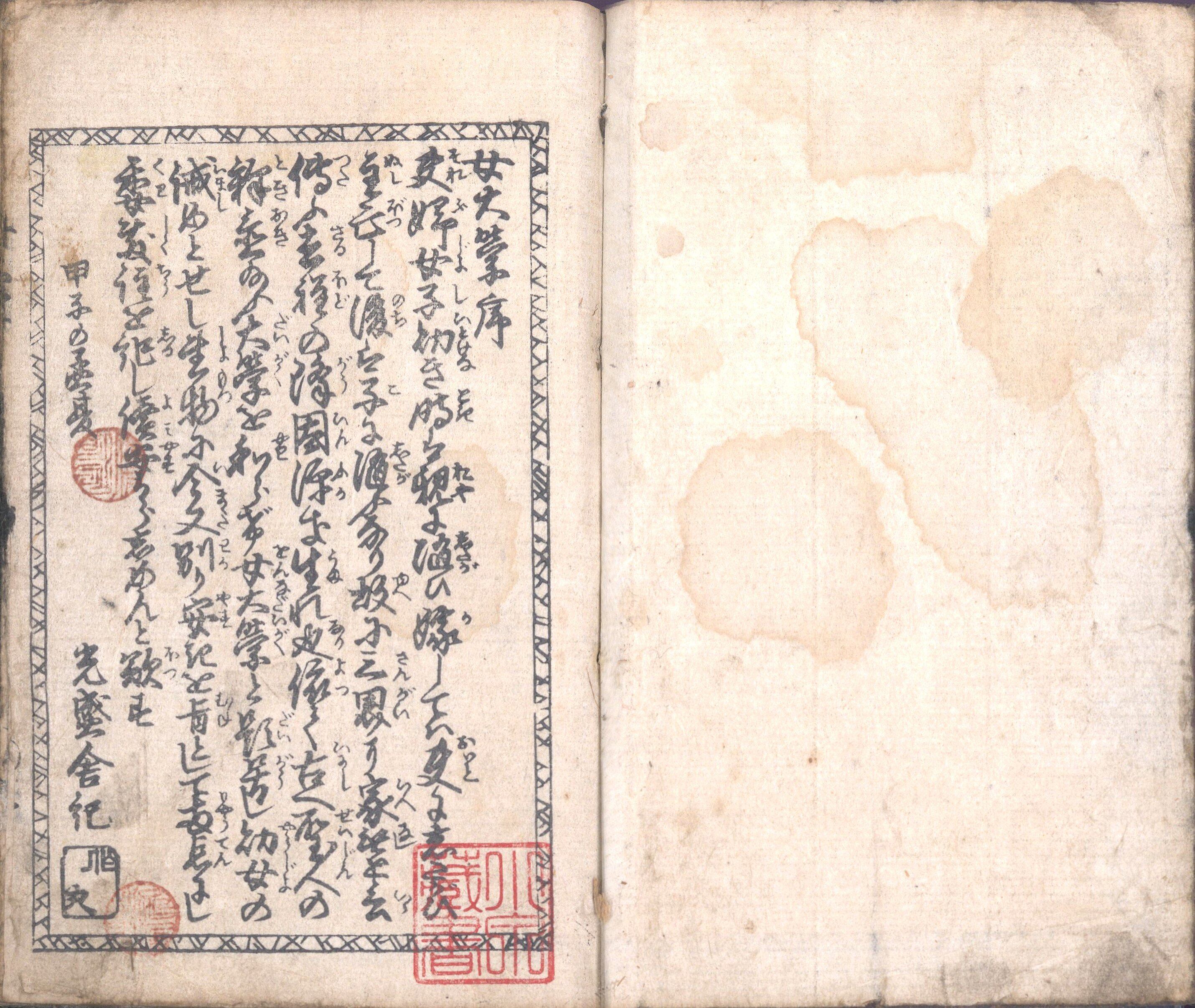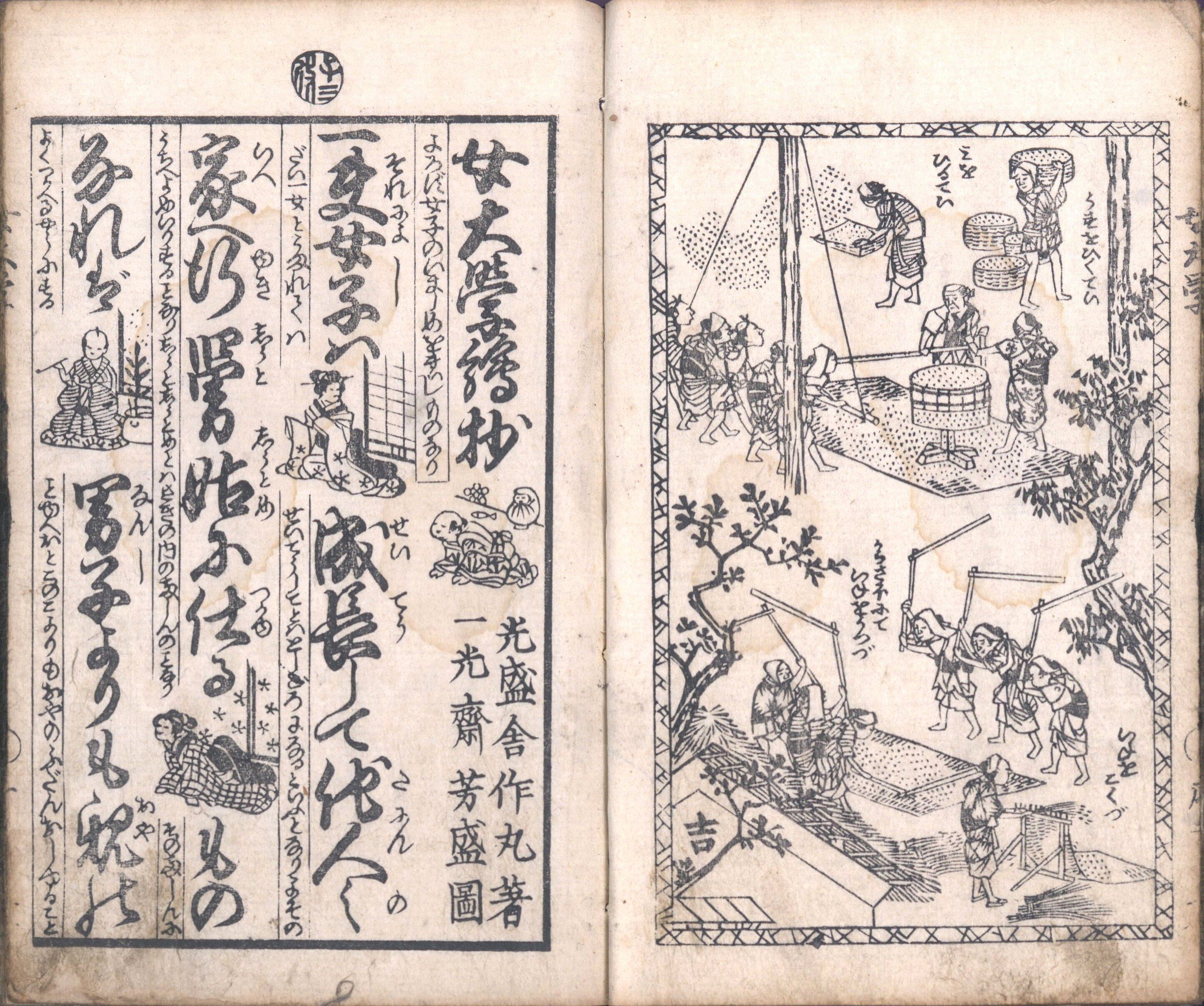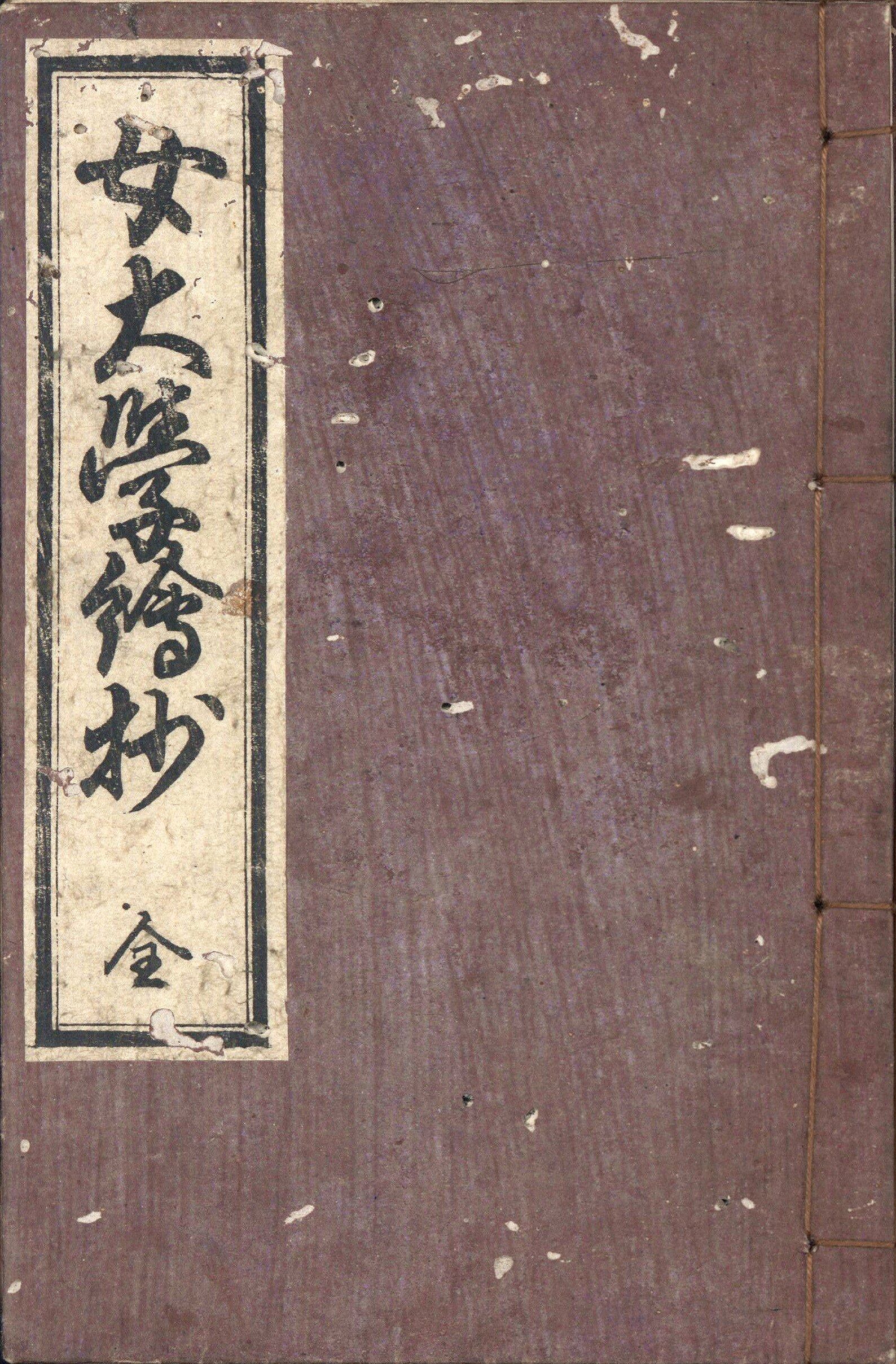 【備考】分類「往来物」。同板2種を収録(後半に収録した後印本は袋綴じ展開収録)。『女大学絵抄』は、『女大学(女大学宝箱)』の本文を大字・4行で記し、本文中の所々に本文要語を絵解きした小さな挿絵を加え、さらに本文の左側にごく簡単な解説文を小字で付記した往来。本書と同体裁の往来物が、幕末に江戸書肆・吉田屋文三郎によって数多く出版された。