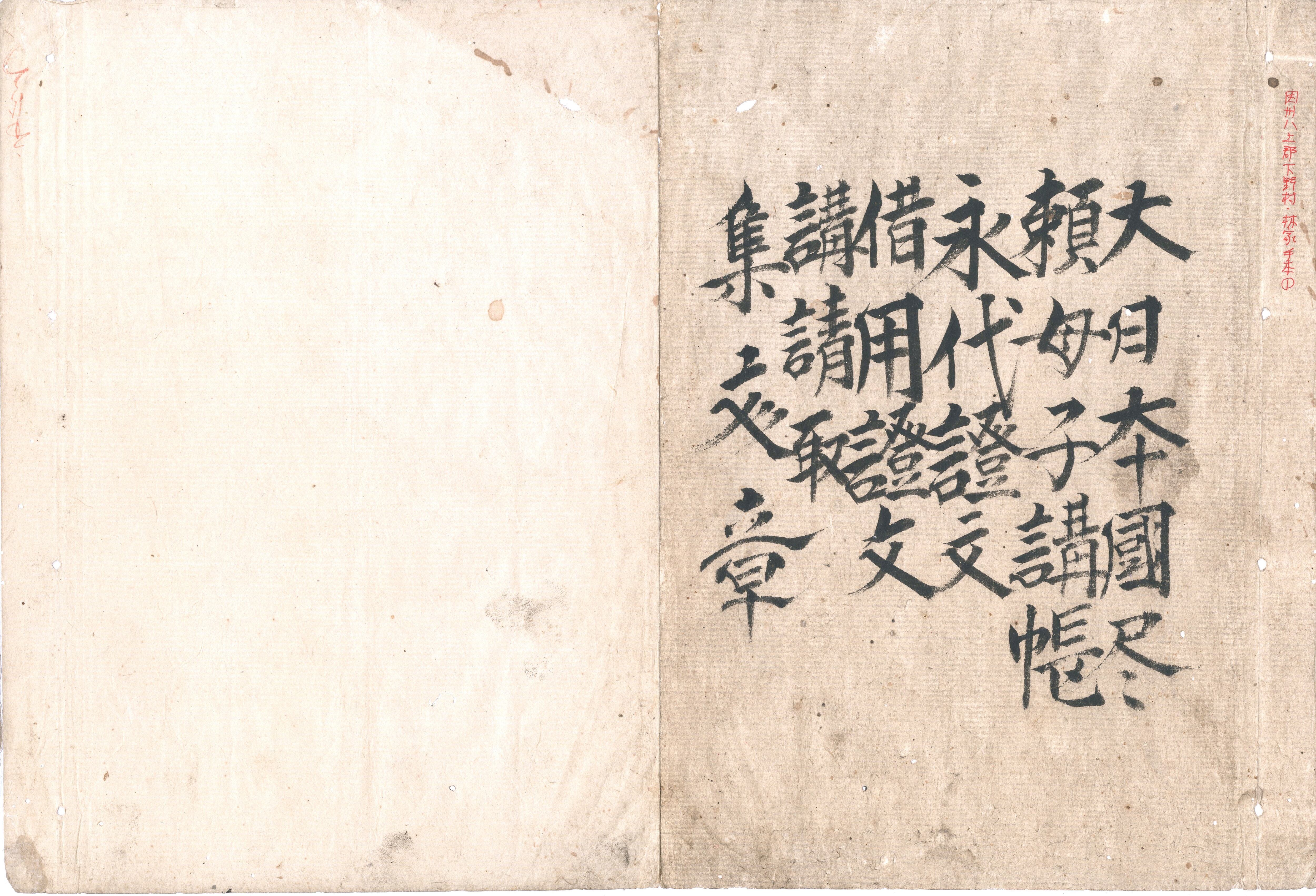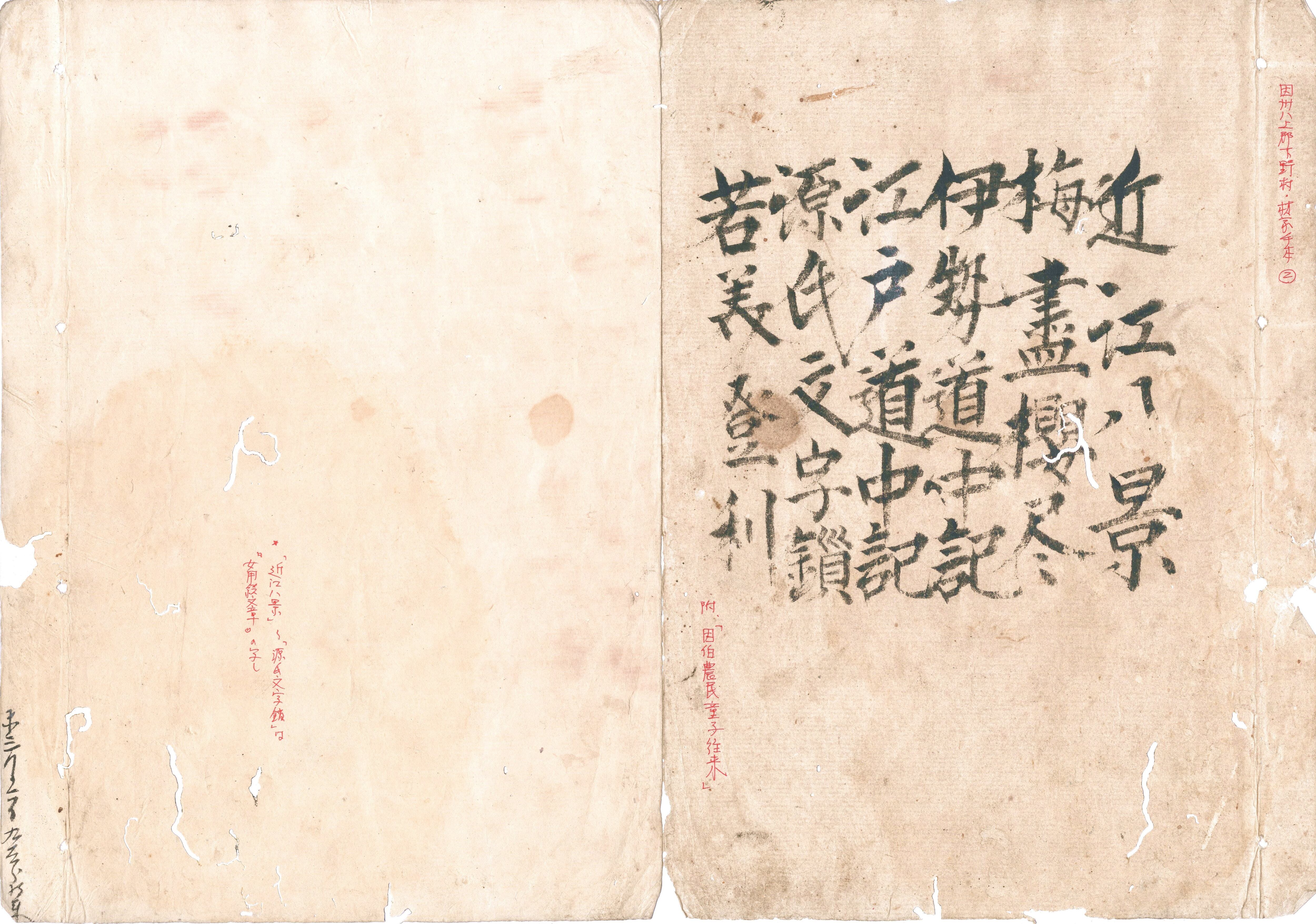 【備考】分類「往来物」。下野村(現・鳥取県八頭郡八頭町(ヤズチョウ))、林治平旧蔵書。因幡国八上郡下野村で使用された特大本2冊の手習本。第1冊は、「大日本国尽」「頼母子講帳(元治元年4月)」「永代証文(元治元年6月)」「借用証文」「講請取」「集文章(「年頭状」以下32通の例文集)」。第2冊は、「近江八景」「梅尽」「桜尽」「伊勢道中記」「江戸道中記」「源氏文字鎖」「若美登利」「因伯農民童子往来(農民童子教訓書)」を収録する。このうち、「因伯農民童子往来」は、因州地方の農家子弟向けに書かれた教訓書。「一、農民と生れては、至極軽き者なれども、御百姓は国家の根本にて、御上の御宝が土地・人民とて、従殿様に御撫育を専に思召被為下、昼夜に不限御国恩の難有事不可忘…」で始まる冒頭は一見一つ書きのようだが、実際は全一編の文章に作る。父母へ孝を尽くし、老人は他人でも懇ろに敬い、親兄弟で争うことなく、村中が和睦して互いに切磋琢磨し、苦楽を共にして暮らすこと、また、四季の農耕に励んで正直・倹約を心懸け、子どもにも分相応に手習い・算用を習わせ、将来は村方の役に立つように育てることを説く。さらに、因伯両国の永代請免制のあらましにも触れ、この「作取の御国」の百姓に生まれながら農業経営に苦しむようでは他国で世渡りできるはずがないと戒め、幼少から身に付けるべき事柄や守るべき心得を述べて締め括る。特定地域の童蒙用に編まれた往来として興味深い。第1冊は多く本文を大字・6行・無訓で、第2冊は本文を大字・6行・無訓で記す。