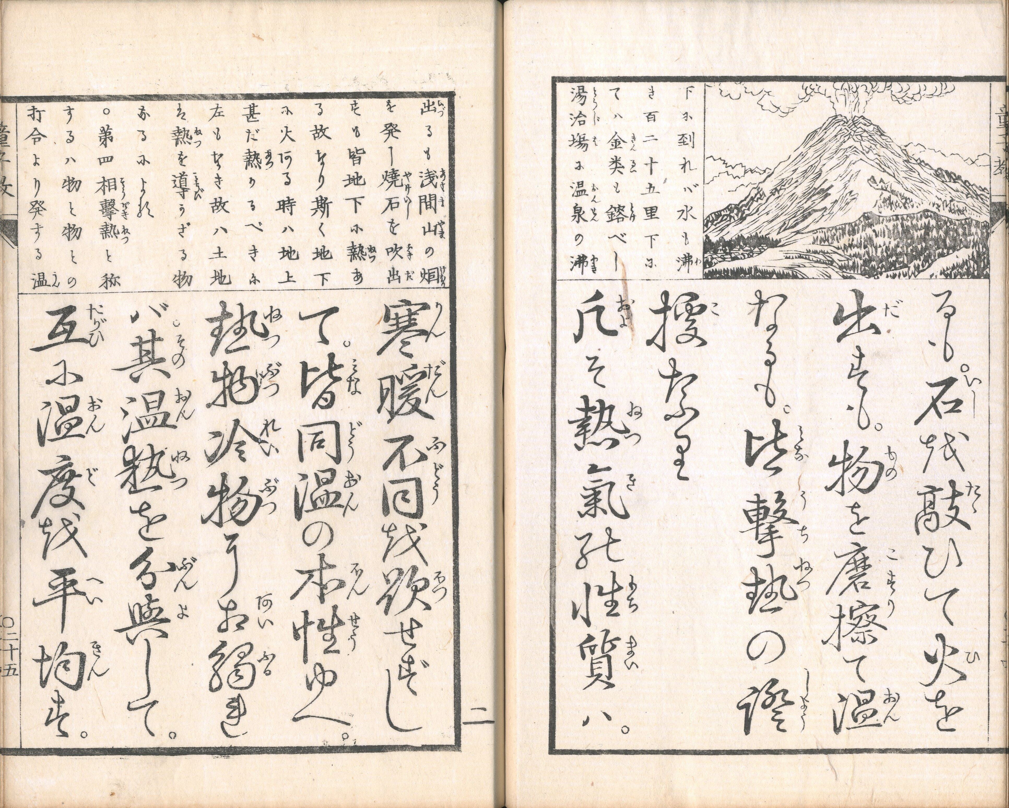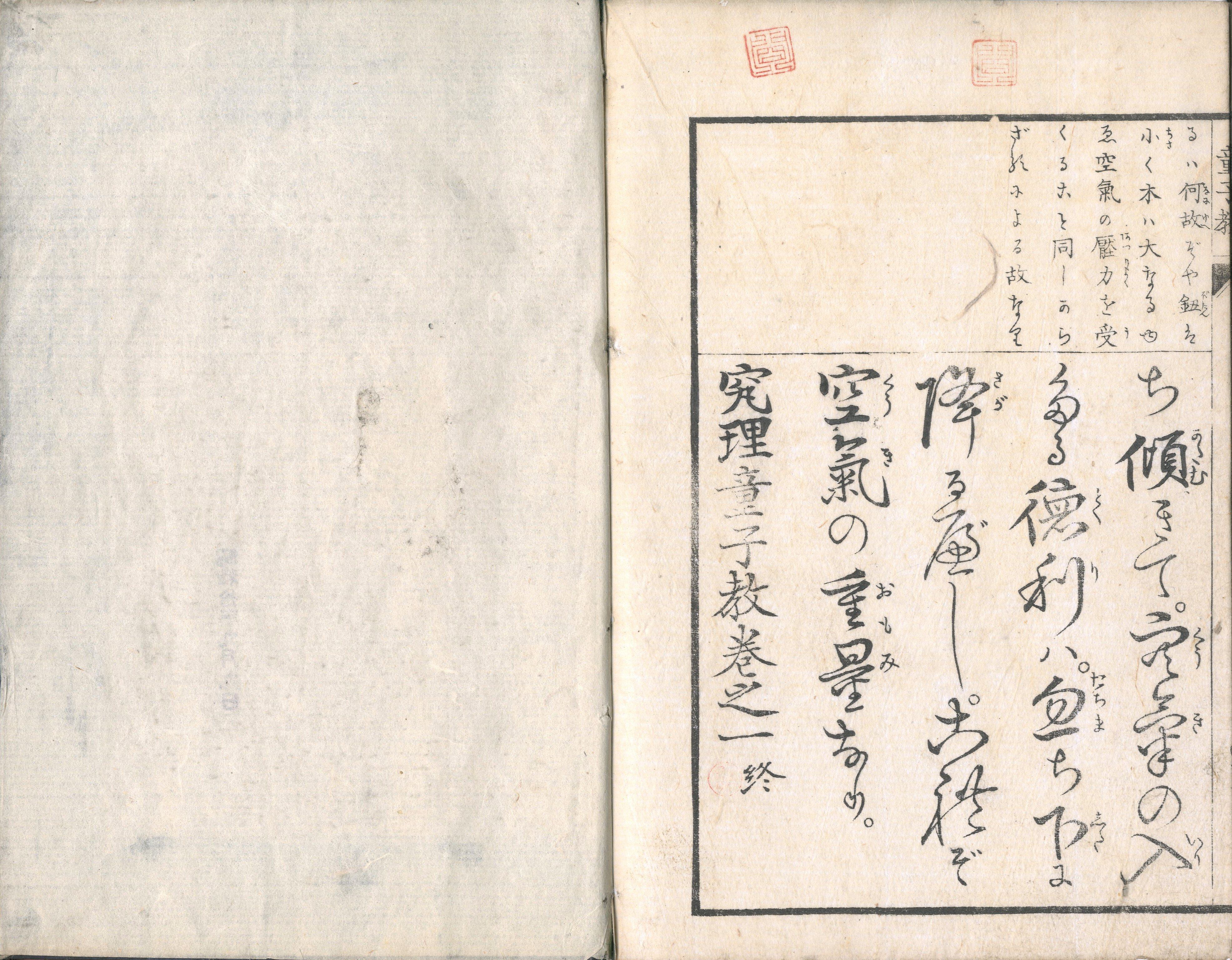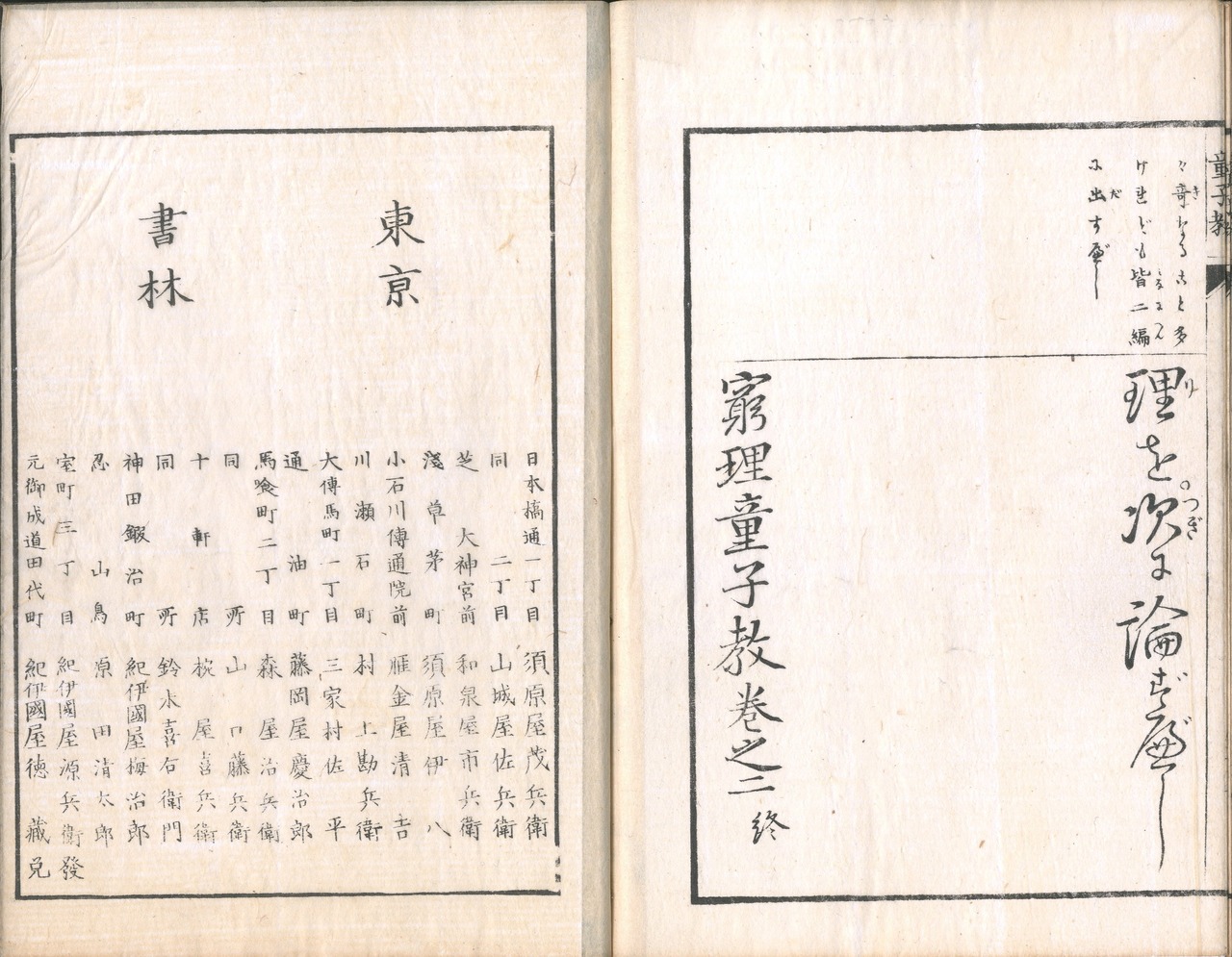 【備考】分類「往来物」。同板別本も抄録した。本書は、窮理学(本書頭書に「天地の間にある万物の道理を究め其物の源質を知り、しかる後に之を人の用に供給するの学問」と説明)上の基礎知識をほぼ七五調の文言で綴った手本。『童子教』と称すが、いわゆる『実語教・童子教』とは何の関連もない。上巻では第1章「究理の要義」で窮理学のあらましを述べ、第2章「空気の事」で空気の特性や大気に関する諸説を展開する。また下巻では第3章「風の事」で風の原因やその作用、気候や季節との関わりなどについて、第4章「熱気の事」で熱の作用や熱の五源(太陽熱・火熱・電熱・固有熱・相撃熱)、熱の性質、寒暖計などについて述べる。本文を大字・5行・付訓で記す。頭書には、本文の関連記事や挿絵を掲げ、エヤ(エア)ポンプ・晴雨鍼・風雨鍼・風速計・反射鏡を始めとする実験器具や測定器なども紹介する。