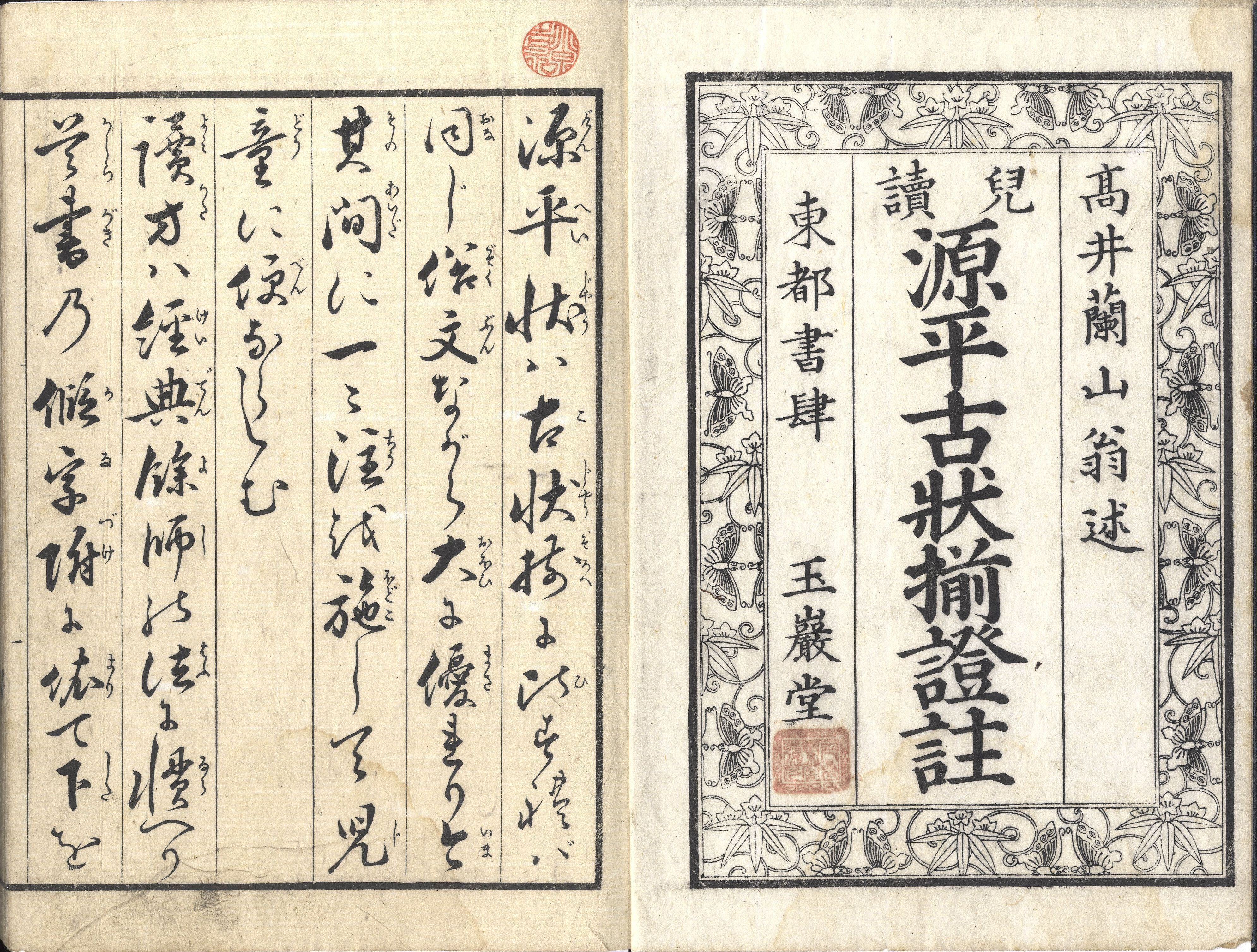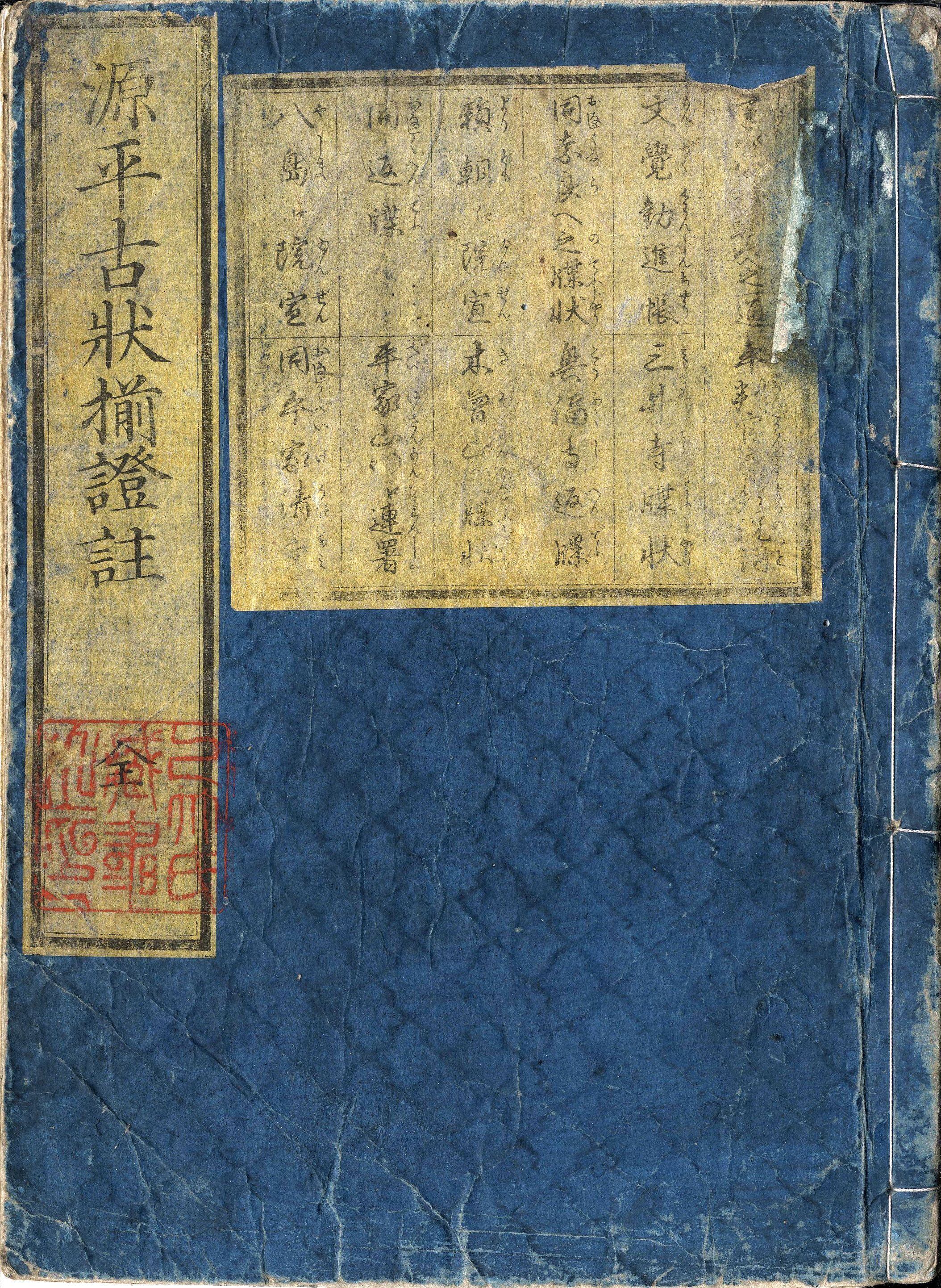 【備考】分類「往来物」。末尾に天保13年板(全冊収録)および刊年不明板(抄録)を掲げた。『日本庶民教育史』で有名な乙竹岩造旧蔵書(題簽部に蔵書印)。寛文10年刊『武家往来』や元禄14年刊『盛衰記源平往来』の流れを汲む古状型往来。ほとんど同文のものから、同一主題ながら全く別文に書き替えたものまであるが、『武家往来』上・中巻から抜粋した11状に、冒頭の「頼朝配流之時、重盛自筆之一通」を増補した合計12状を収録する。書名のように、源平の勢力の盛衰に大きく関わる古状(ただし一般の『古状揃』に所収の古状を一切省く)を中心に配列するのが特徴。蘭山は自序で、「源平状は『古状揃』に比すれば、同じ俗文ながら大に優れり」と述べており、それら「源平状」を当時流行した「経典余師」の体裁にならって施注したものである。各状を数段に分けて行書・大字・8行・無訓で記し、段毎に割注を施し、さらに、頭書に楷書・小字・付訓の本文を再録して読方を示す。注釈内容は詳細で、人物の出自・事跡や歴史的背景にも言及して、各状が子どもに的確に理解されるように工夫する。