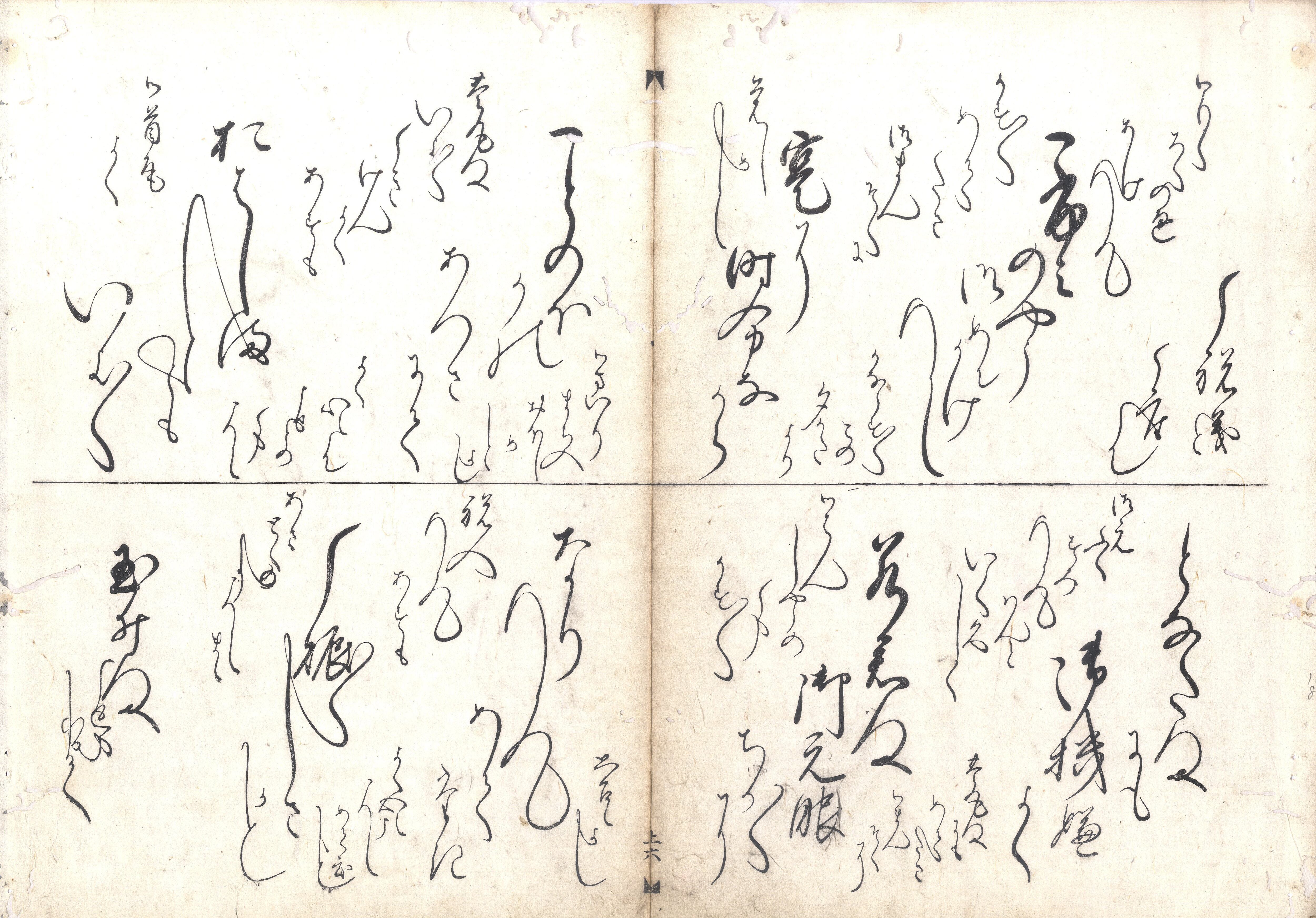 【備考】分類「往来物」。袋綴じ展開収録(短冊図のみ再掲)。題簽題は各巻毎に異なり、上巻『女筆子日松』、中巻『女筆姫小松カ』(序文から推測)、下巻『相生のまつ』。序文によれば、筆者が20年間かけて集めた女筆の模範例文を一書にまとめた女筆手本。全文が同じ筆跡であるため、これらの消息文を編者が模写したものであろう。上・中巻に女文を収録し、上巻が「新年祝儀状」~「婚礼祝儀状」の17通、中巻が「子の日祝儀状」~「歳暮祝儀状」の18通で、全文を散らし書きで記す。いずれも御所方など貴人女性向けの披露文を主としており、例文中に古歌や、古歌に含まれる表現を多く採り入れた「引歌」的な手法を用いるのが特徴。また、本文が所々2段になっていたり、付録記事が多彩な点も独特である。さらに、下巻を全て女中の有職故実・礼法関連の記事とするのも異色で、御厨子・黒棚・衣桁の飾り方や、「武家祝言式法」以下、婚礼・出産・通過儀礼・食礼、四季衣装、女中名・人称等について詳述する。このほか、上巻巻末に「色紙寸法・短冊寸法」、中巻巻末に『和漢朗詠集』からの詩歌を載せる。