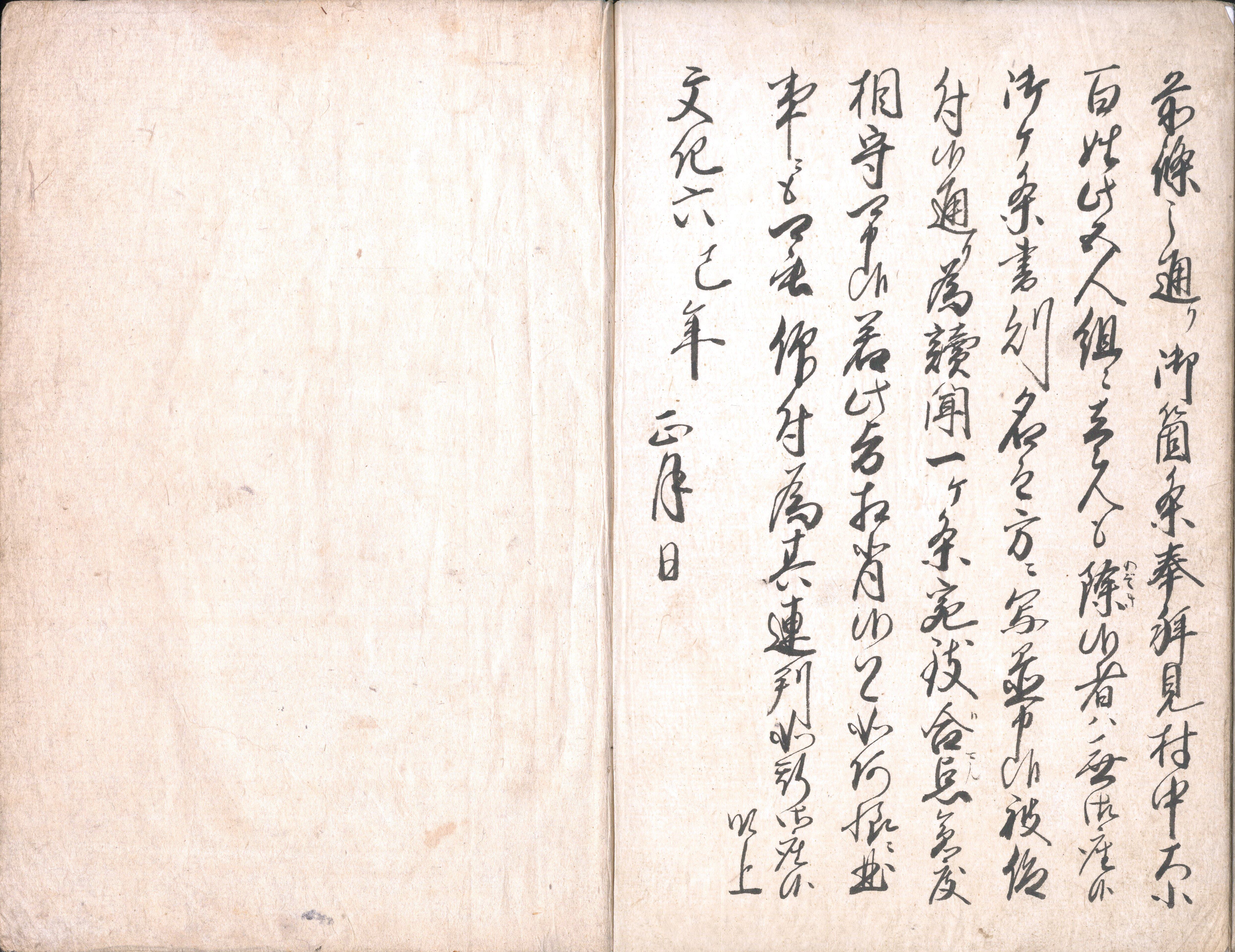 【備考】分類「往来物」。越後国頸城郡松野山南組東川村(現・新潟県十日町市)で使用された「日本国名尽」以下7本の手習本を合本したもの。「日本国名尽(南閻浮提(ナンエンブダイ)大日本国名尽)」は、五畿七道および二島毎に国名を列記したもので、いわゆる「(大日本)国尽」。「苗字附」は「松平、前田、嶋津、細川、伊達、黒田、浅野、毛利…」以下、諸大名等の苗字を集めたもの。「羽倉目安」は、一揆訴状などを題材にした目安往来物の一つ。寛文12年6~8月、越後国魚沼郡羽倉村と信州水内郡森村との間でやりとりされた訴状とその返状を手習本に認めたもの。「小千谷目安」も目安往来物の一種で、越後国魚沼郡小千谷村百姓、市郎左衛門が寛延元年12月に評定所へ提出した質地騒動をめぐる訴状を記したもの。「天保卯年御触渡(申渡条々)」は、天保14年6月に越後国頸城郡地方に出された、分不相応の家作、江戸への出稼ぎや廻国修業、人別改帳の厳格化などについての触書と東川村惣百姓連印の請状の写しを手習い教材としたもの。以上のほか、川浦役所が天保15年に発した触書の写しである「質素倹約御触書写」と、文化6年1月発布の五人組規則である「五人組御仕置帳」(天保16年1月書)を付す。なお、本書には、「国尽」「苗字付」「イロハ」などの初歩往来物を合綴するほか、上記の写本の随所に漢字の読みを記した付箋を付けるなど、手習本として使われた明確な形跡が見られる。また、袋綴に挿入されていたメモも、その丁の前後にデジタル収録した。