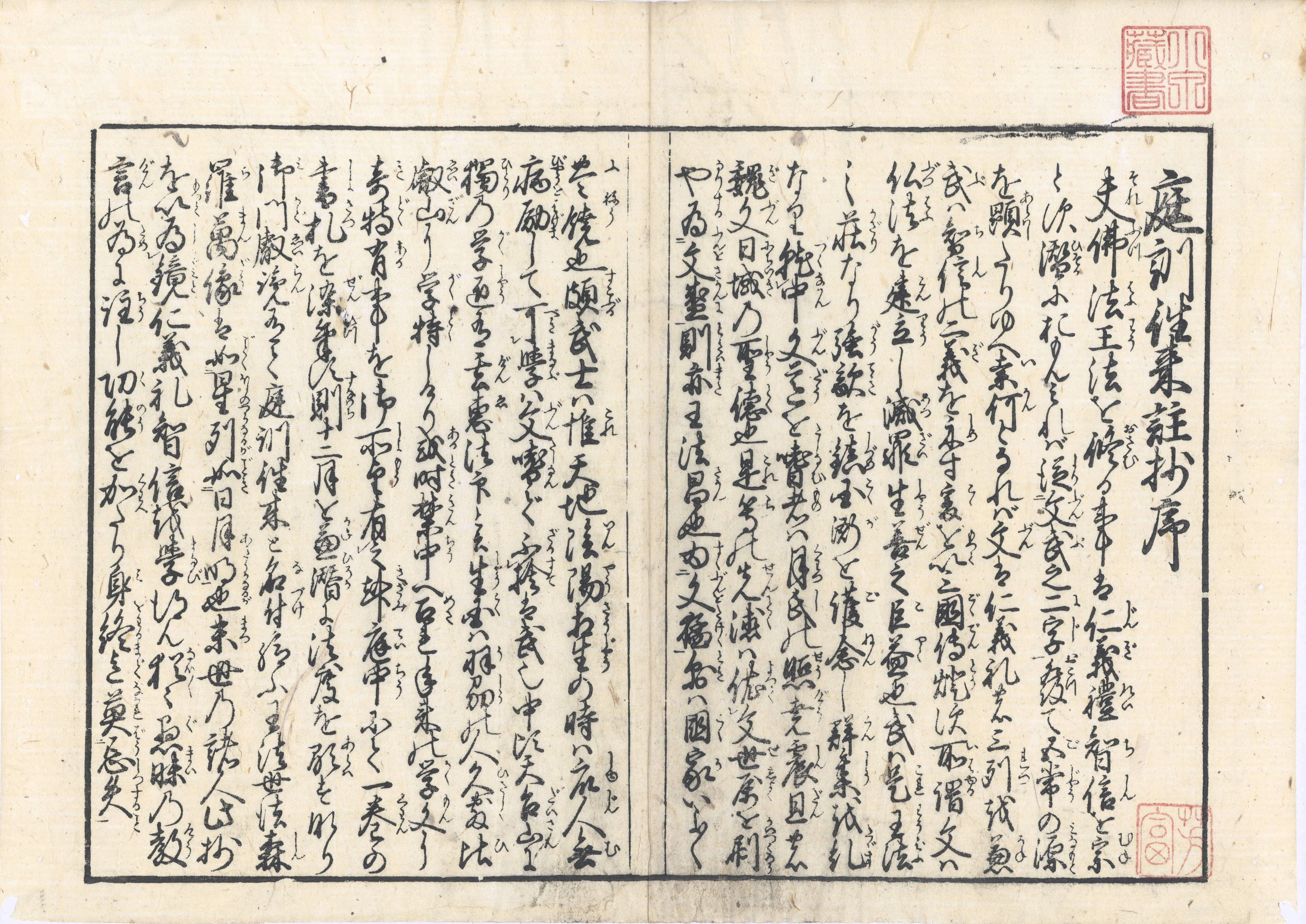【備考】分類「往来物」。袋綴じ展開収録。後印3巻合1冊本も抄録した。『〈天保再刻〉校正庭訓往来註抄[庭訓往来註抄]』は、大本3巻3冊、また3巻合1冊で、『庭訓往来』の各状を12-13段に分けて行書・大字・6行・付訓で記し、段毎に漢字・平仮名交じり文の詳細な注解を施した注釈書。施注内容は、寛永8年刊『庭訓往来註(庭訓往来抄)』を源泉として万治2年刊『庭訓往来抄』に継承されたものに準拠する。なお、本書の内容を8行書きに改編した『庭訓往来抄〈平かな附講釈〉』が天保9年に出版されたほか、『庭訓』本文を無訓に改めて新たに本文読方を頭書に増補した改訂版『〈嘉永新鐫〉庭訓往来注抄』が嘉永5年に刊行されている。