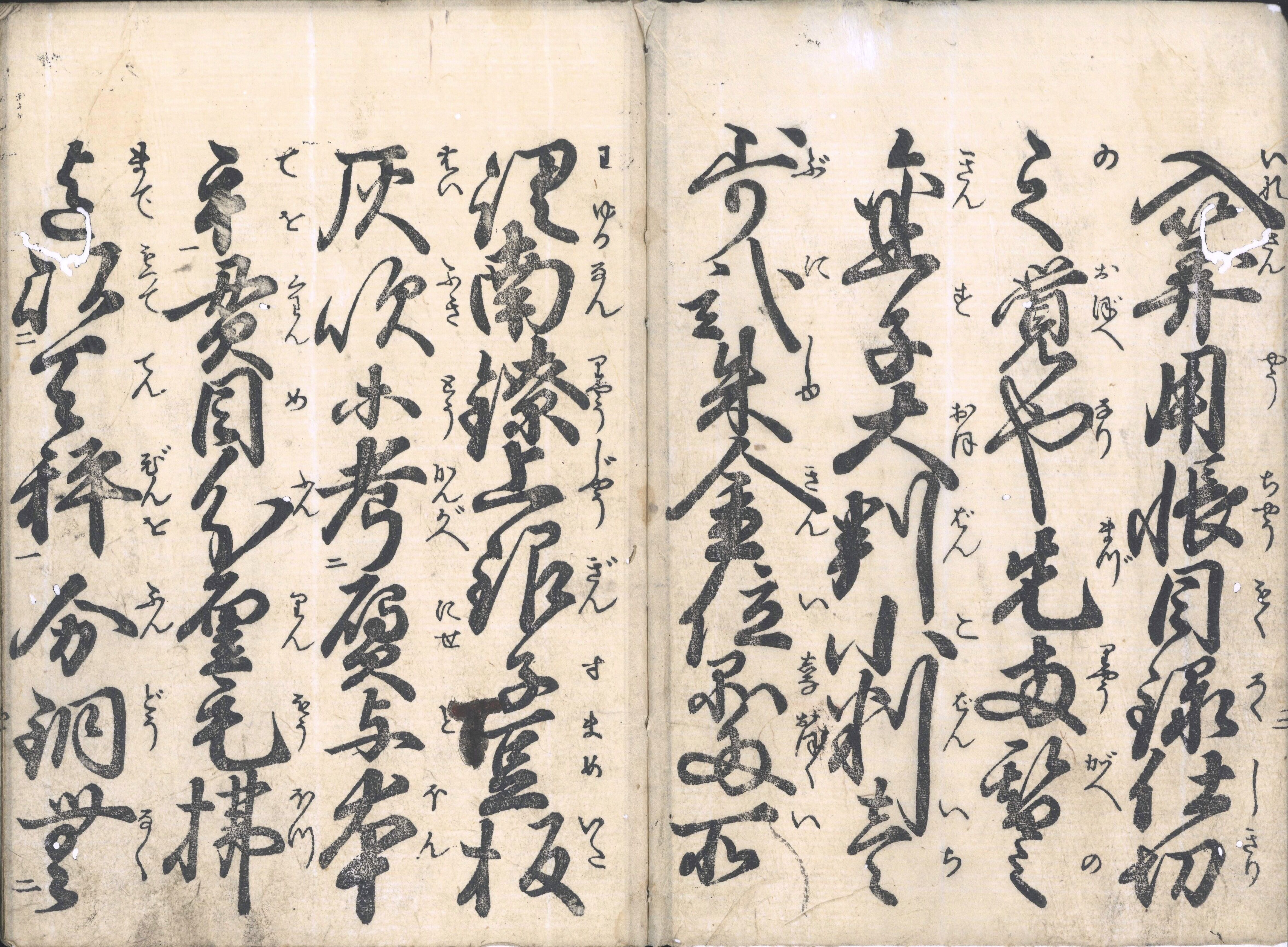 【備考】分類「往来物」。本書は流布本『商売往来』を大字・4行・付訓で認めた半紙本の往来物。見返しに「片仮名イロハ」「十干十二支」を掲げる。