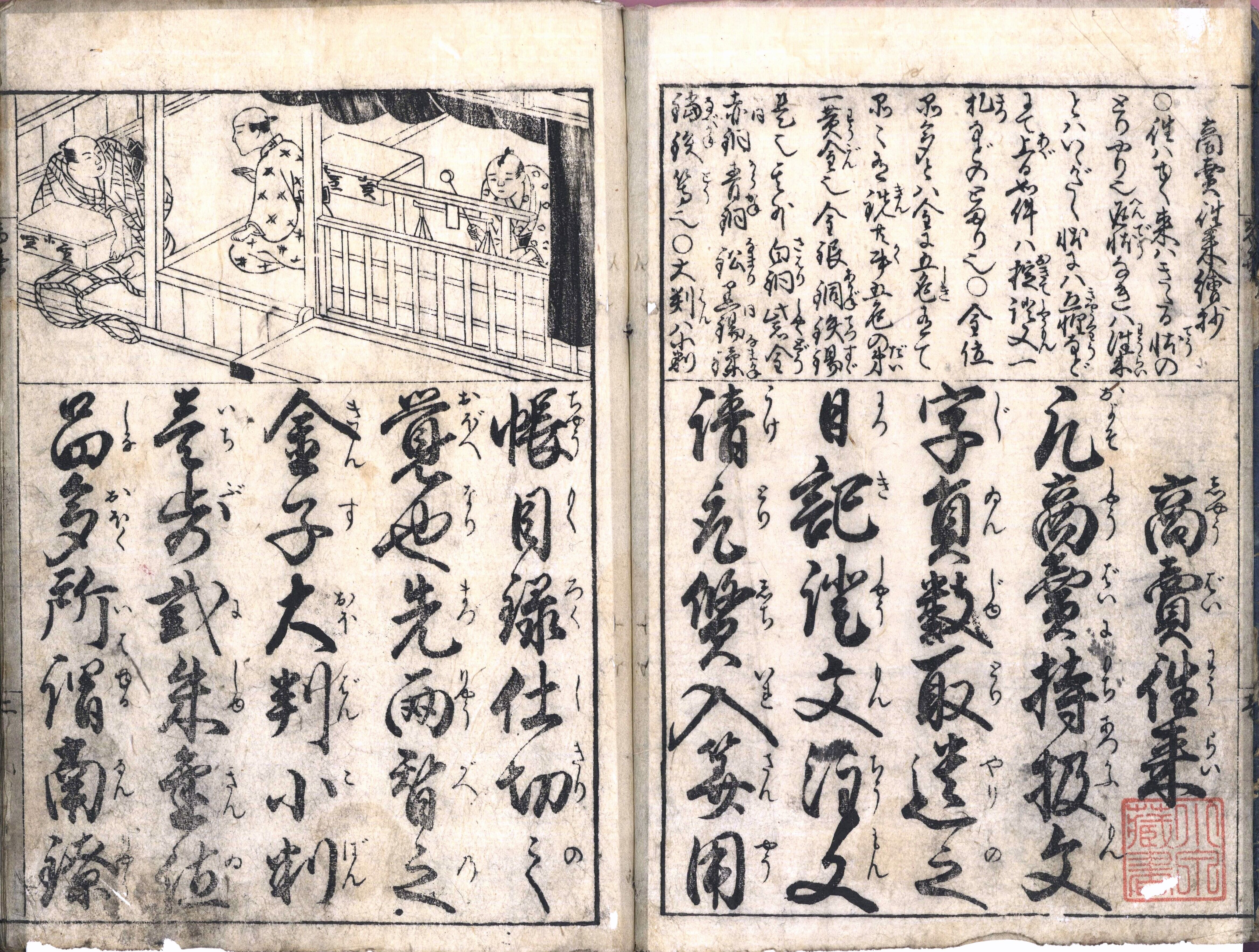 【備考】分類「往来物」。『〈頭書絵抄〉商売往来』は、流布本『商売往来』本文を大字・5行・付訓で記し、頭書「商売往来絵抄」で本文の絵解きや要語解、その他関連記事を掲げたもの。まず「往来」の解説から始まり、「往はゆく、来はきたる、状のとりやり也。返状なきは往来とはいゝがたし。状には恐惶などにて上る、如件は掟、証文一札などのとまり也」とあり、簡潔平易なもので、適宜、「諸物斤目覚」「雑穀」「絹布類」「四季時服」「武士之用具」「唐物・和物」「山海之魚鳥」などの項目を関連語彙を列記する。