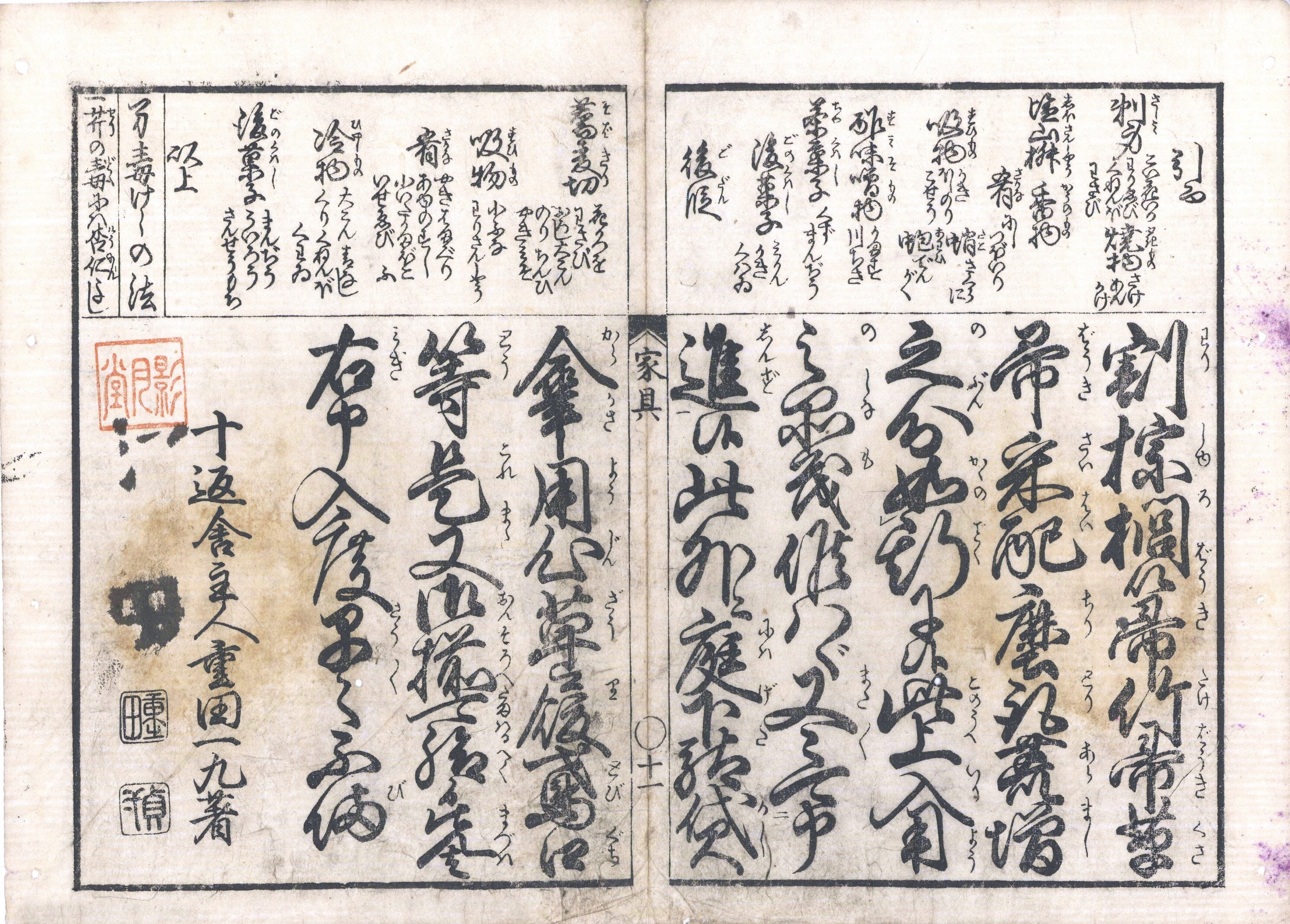 【備考】分類「往来物」。袋綴じ展開収録(見開き図再掲)。『〈甲申新版〉家具名尽文章』は、家屋新築にあたり家具・調度類の新調を依頼する手紙文になぞらえて、日常生活に必要な家財・諸道具類を書き綴った往来。「家飾の具」「家財・調度」「庖厨道具」の3つに分けて紹介し、所々、加工の内容や素材、および名産地・種類等について付記する。本文を大字・5行・付訓で記す。頭書に、鼎・釜・壺など八つの家財の字義・故事・用途・形状などを挿絵とともに紹介した「家飾具器の図」を始め、「竈神(かまどがみ)の事」「献立認めよう(『童子諸礼躾方往来』の頭書と同じ)」や、解毒剤について記した「万毒けしの法」などを掲げる。