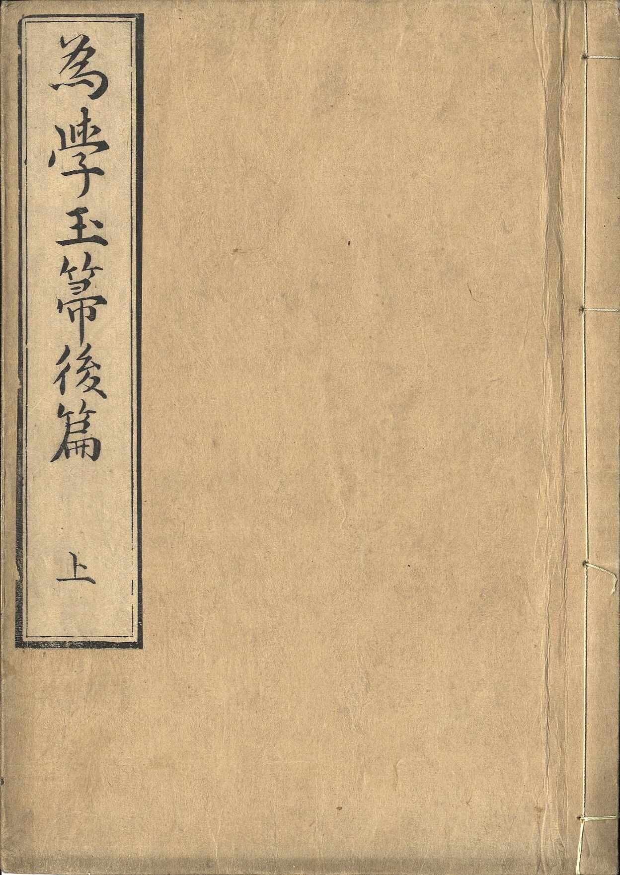 【備考】分類「心学」。後印本も抄録した。前篇:手島堵庵と弟子との問答の聞書から「心学に適要にして道術に深切なる」ものを採録して一書としたもの。書名の由来については、序文に心身の「塵埃を掃除する」義と記し、跋文では、本書が『我杖』や『塵斗』に続き、「古人の格言を以て産業を全ふするの一助とし、嘉言善行を集成して、以て日用の間に備へ、心身の塵埃を掃除して、以て天性に復する」ことを教えた書と紹介する。上巻は「あら玉の春」「克己(こっき)復礼」「念々の起る根」「致知格物」「博文約礼(はくぶんやくれい)」など8条、中巻は「心身の安楽」「性を知り道を信ず」「誠は意(こころばせ)を専らにするの謂(いい)」「主一無適」「本心の思ひ、人心(わたくし)の私案」「危き事の根本」など10条、下巻は「曽子と一休との差別(しゃべつ)」「道を信じ、志を立つ」「本心を知れば死生なし」「小過を以て妻を去る」「道の体用」「本心の体用」「性を知るの外(ほか)に第一の悦(よろこび)」など9条を収める。後篇:手島堵庵と門弟との問答聞書である『為学玉箒』の後篇。跋文にあるように、寛政元年の秋に手島和庵・上河淇水等による『為学玉箒』前篇刊行後約20年を経て、書肆芳樹軒(蓍屋儀兵衛)の切望により後篇3冊を加え前後6冊として刊行した。上巻に「三綱領」「本心の心得」「耳がなければ」「角あれば物のかゝり」「心こゝにあらざれば」「新しき箒を以て」など12条、中巻に「人をつかへば苦を」「正月の謡初(うたいぞめ)に」「克伐(こくばつ)怨欲(えんよく)」「仁者(じんは)性の徳」「死人には天心なきにや」など10条、下巻に「老子白髪にて」「君子に成たしと」「無所住は罪を聖人に」「絵に書し餅」「子を見(みる)事親にしかず」「本心は色形なしと聞(きく)」「正月は何を以て目出度(めでたく)」など13条を収録する。なお、『江戸書目』397頁に「為学玉箒 後篇 全三冊 墨付五十九丁/同(文化)五年辰九月/手島堵庵著/板元 京 近江屋次郎吉/売出 須原屋茂兵衛」とある。