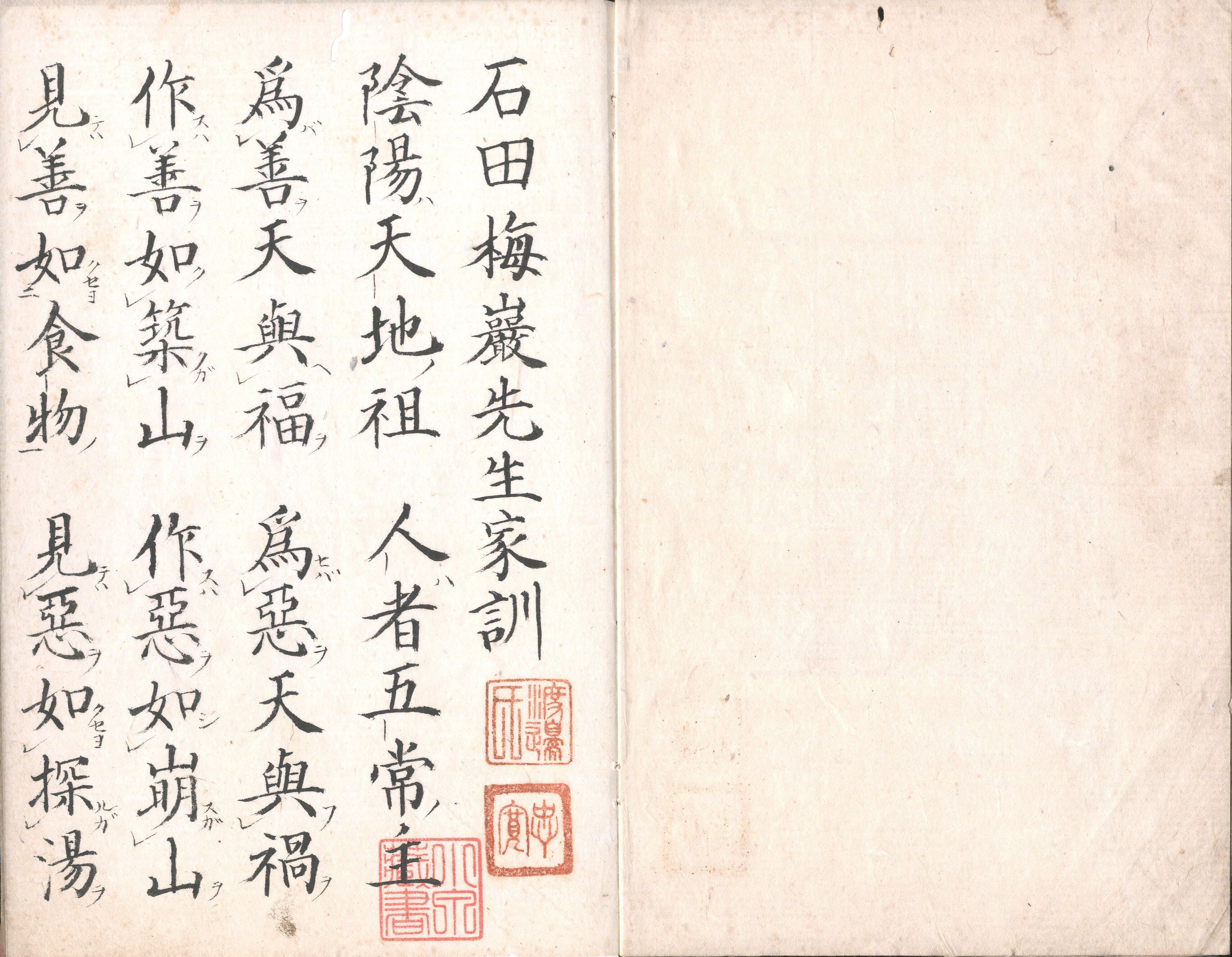 【備考】分類「心学・往来物」。梅岩作は仮託であろう。裏表紙に「明治25年」の書き入れ。本書は、漢字5字1句の対句形式で、天地の理や人倫を説いた心学書であり、実語教型往来物。「陰陽天地祖、人者五常主。為善天与福、為悪天与禍。作善如築山、作悪如崩山。見善如食物、見悪如探湯…」で起筆し、「…切問近思矣、仁在其中矣。天心是人心、人心是成天。天理言義理、義理言天理。天理与義理、欲一以貫之」と結ぶ合計190句で綴る。