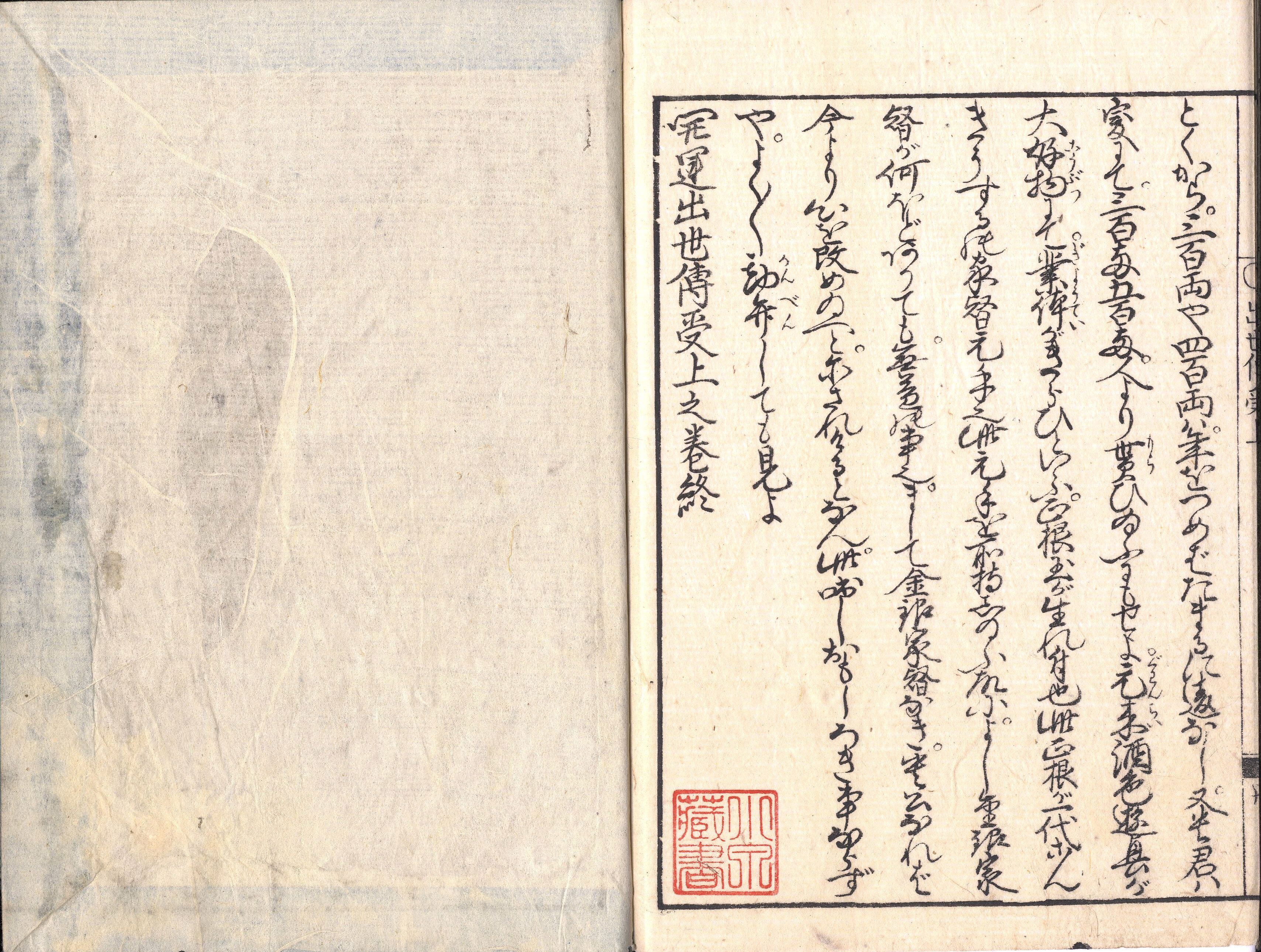 【備考】分類「心学」。後印本2種も抄録した。 「開運出世伝授」の幟を掲げた翁が、大名・蓮野実(巳)之助等の相談に応じる問答形式で、家業出精と「倹・忍・根気」の3つを守ることが開運の秘訣であると諭したもの。儒仏その他の金言や愚頓漢と知賢漢、豊臣秀吉・韓信、瓢箪病、石部金吉等々和漢の故事を適宜引いて質素倹約・堪忍辛抱・根気の要点や、天運を得る法、職分、性善、また、性根を入れて稼ぎ本心に従って生きるべきことを説く。扉に「此草紙は世の人身に応じたる運を開くの道をしらず、貧乏困窮にせまり、心痛・苦労するを救ひ、運をひらき、立身出世をなし、家内和合し、子孫繁栄をなすの術を、おもしろおかしくおしへさとせり」とあるほか、『あつめ草』2篇7巻末広告にも、『かねもうかるの伝授』と『開運出世伝授』の2冊が、「世の人の貧窮・難渋をすくひ、身を治め、身体(しんだい)の勝手をよくし、足る事を知り、おのづから色欲・利よくをしりぞけ、若き人のほうたう不埒をあらため、自然と運をひらき、立身いたし、道にかなひて、かねをもうけ、子孫長久栄昌にいたる道理を伝受し、女童も見やすくたいくつなきよふに、おもしろく、又、おかしくもおしへさとせしものなり」と紹介する。