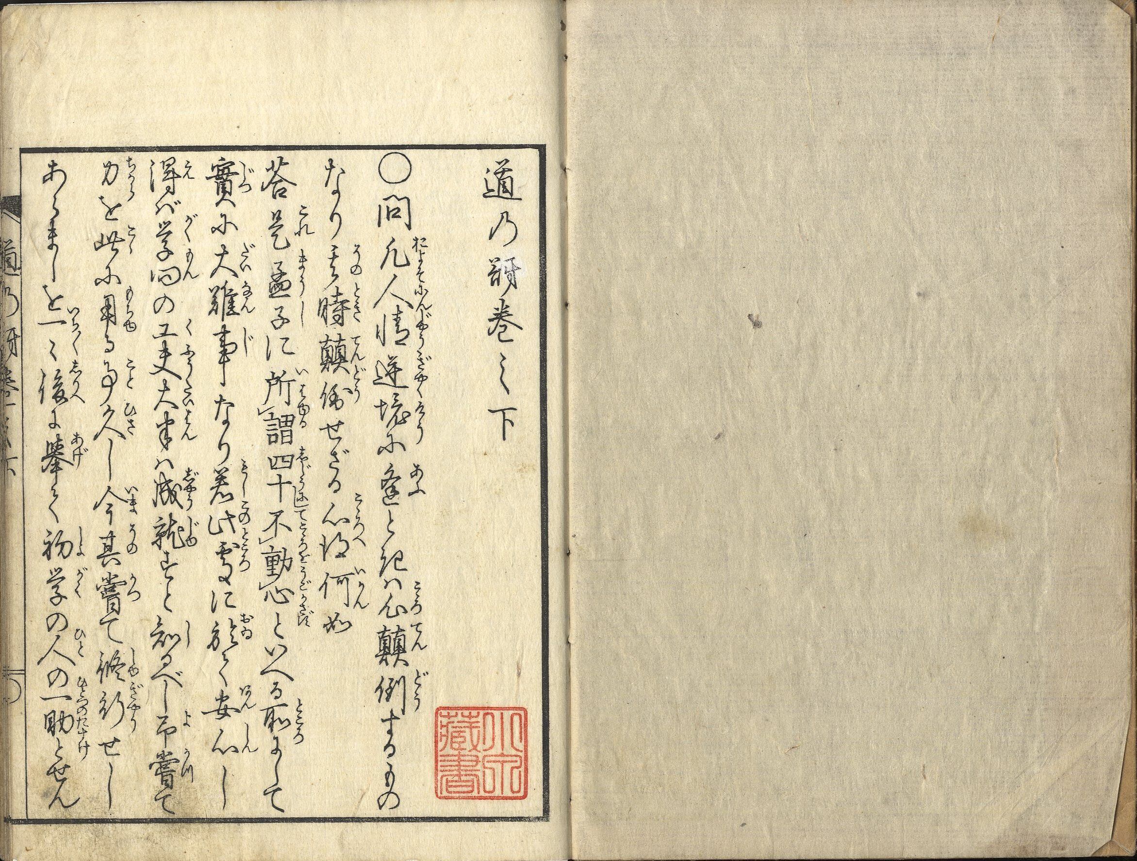【備考】分類「心学」。全編問答形式で、人間の果報を保つ秘訣や心の持ちよう、仁・義・礼・智・信の「五常」や修身・斉家の修行法などを説いた道話。