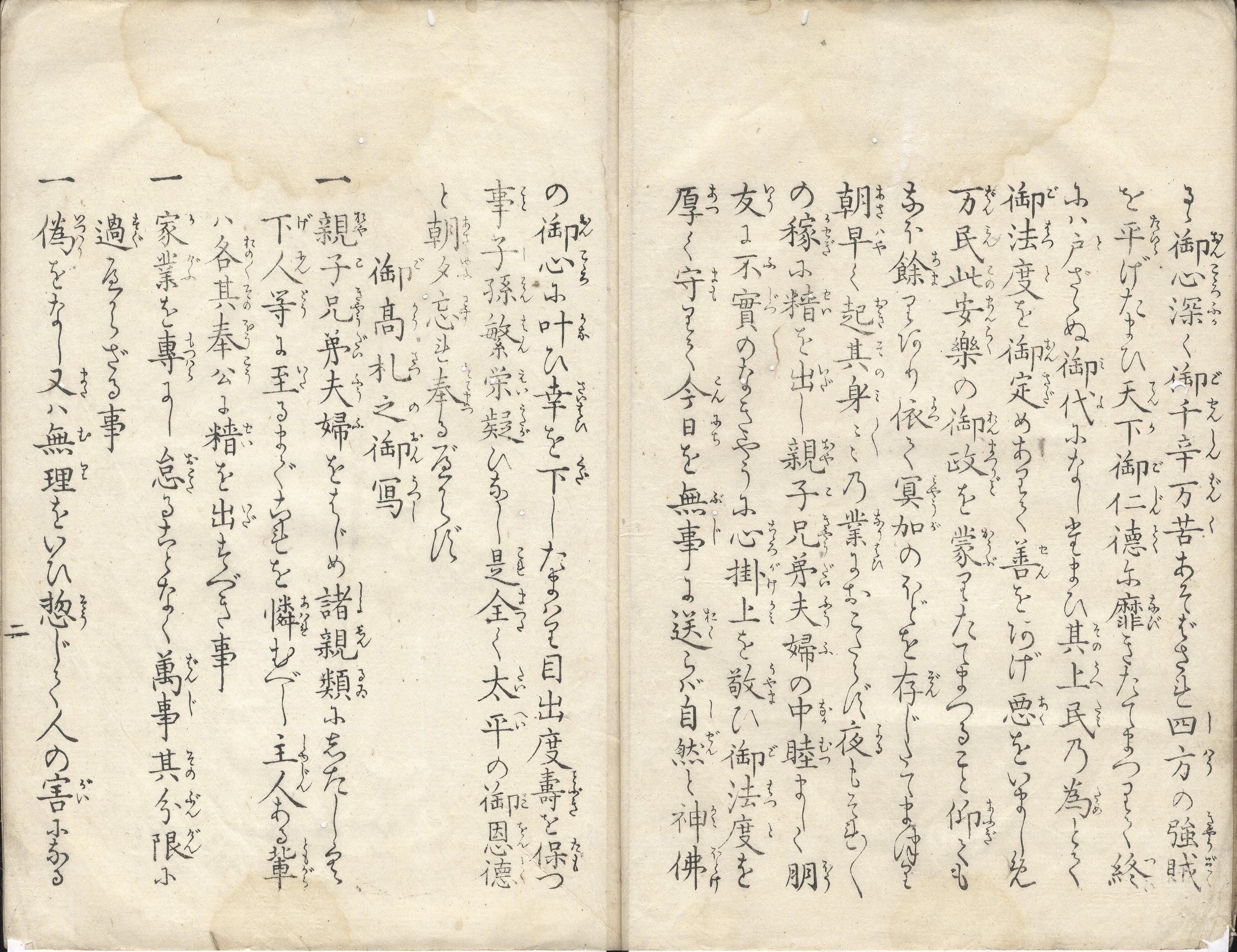 【備考】分類「心学」。後半に江戸後期施本([江戸]井田正左衛門施板)を全冊収録した。徳川幕府の「御高札御写」を掲げて、国恩の広大なことを諭したもので、底本は、天保12年、不章による施印本を嘉永元年に牛翁が再び施印したもの。巻末に「立身請合陰徳証文」を付す。