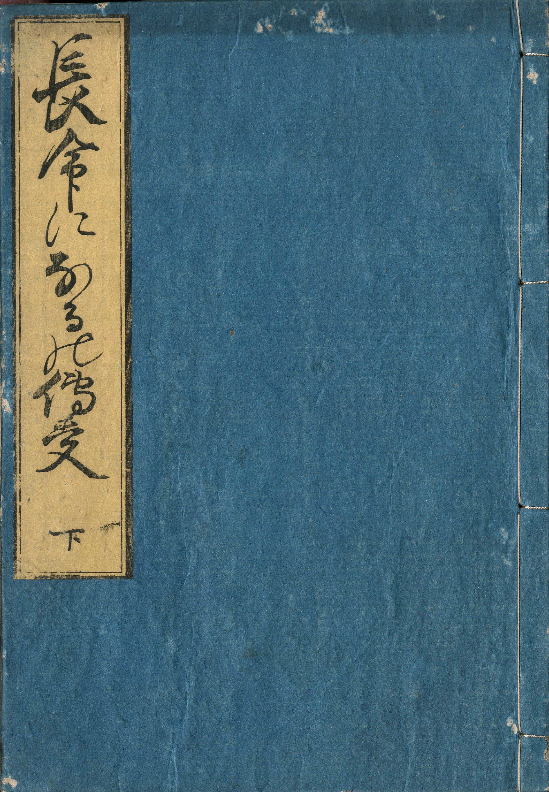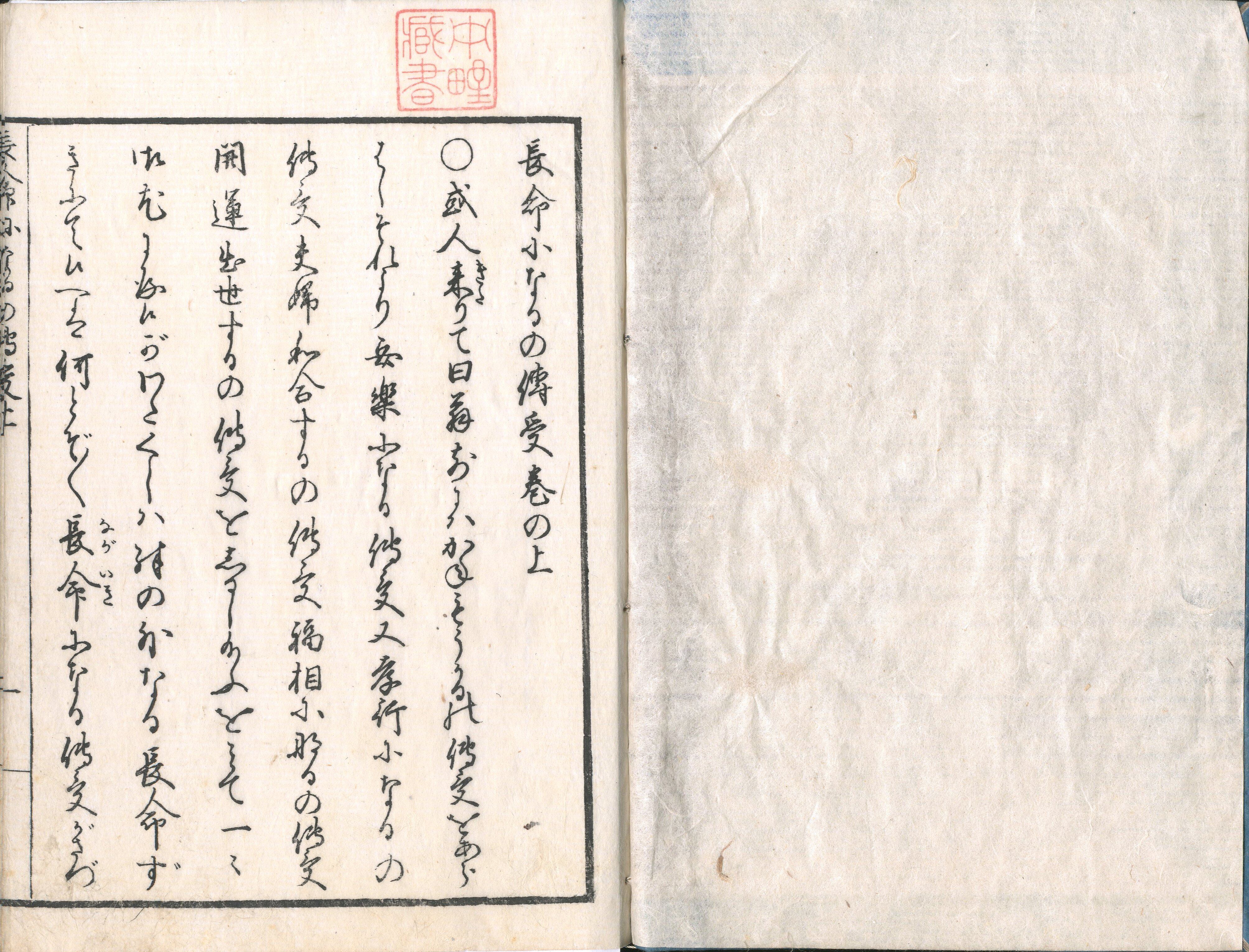 【備考】分類「心学」。後印本の吉野屋板で全冊収録し、他の3本を抄録した。本書は、安楽伝授・孝行伝授・夫婦和合伝授・福相伝授・開運出世伝授など数々の伝授本を著してきた翁へ、今度は「長命」の秘訣について尋ねるという設定で、長命を得るための家業出精や孝行などを問答形式で述べた道話。上巻では、裕福で長寿を望む男の相談に対して「朝起や身を働きて灸をすゑねふたがらずに家業精出せ」の道歌を引いて早起き・家業出精や「朝起大菩薩」の信心が長命をもたらすことを諭す。続いて、大病に患う老父の長寿を尋ねる孝行息子には、養子栄次郎の実例を引いて、孝心が老父の寿命を伸ばす所以を説く。下巻では、顔立ちは良いが化粧が濃い異相の女の「愛らしい色女のままに長命を得たい」との相談に対し、1粒で10歳若返るという秘薬を誤って服用したため赤ん坊になってしまった寓話などを通じて、彼女が「己を身贔屓する心の迷い」を悟り、天地と等しき長命を得るまでの顛末を述べる。